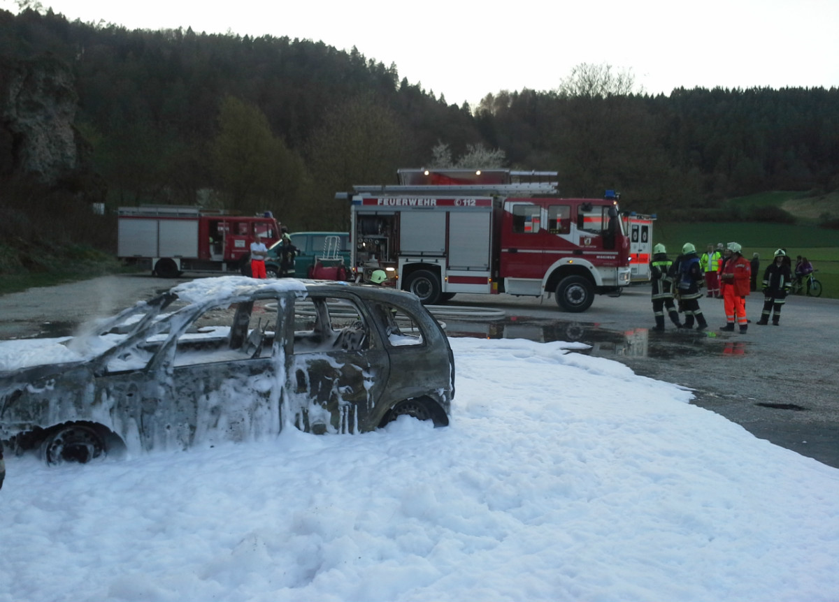 „PKW-Brand – Person in Gefahr – Alarm für die Feuerwehren Tüchersfeld, Pottenstein und Waischenfeld!“ Mit dieser Alarmmeldung wurde der Frühlingsabend des 19.04.2015 für viele ehrenamtliche Einsatzkräfte von Feuerwehr und Rettungsdienst um kurz nach 19:00 Uhr beendet. Bereits auf der Anfahrt zur Einsatzstelle wurden die anrückenden Kräfte informiert, dass der PKW bereits in Vollbrand steht und über einen Gasantrieb verfügt.