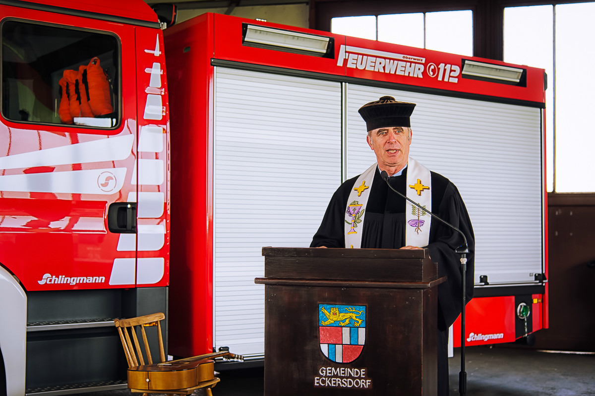 Pfarrer Reinhard Schübel spendete mit Gebet und Gesang den kirchlichen Segen. Mittels einer alttestamentarischen Überlieferung spannte er den Bogen auf die Anforderungen an den modernen Einsatzdienst der Feuerwehr und erinnerte daran, dass die innere Motivation der Feuerwehrleute stets von besonderer Bedeutung sei.
