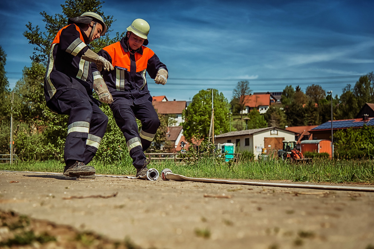 Dienstbücher der Feuerwehrjugend in beträchtlicher Anzahl: insgesamt 143 Teilnehmer, aufgeteilt in 43 Staffeln, maßen Können, Geschicklichkeit und Wissen in sieben Disziplinen. Auch eine Gastmannschaft aus Königsfeld (Lkr. Bamberg) war zum kameradschaftlichen Wettstreit angetreten.