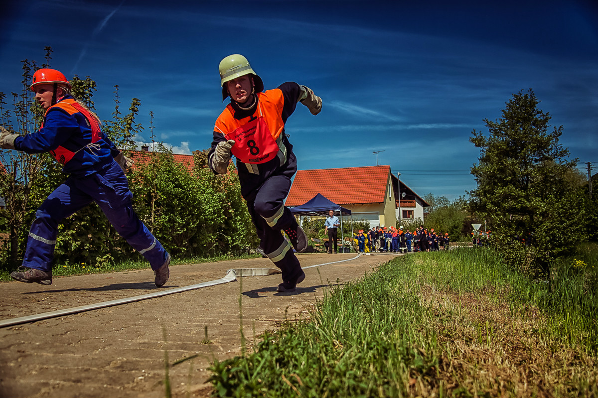 Dienstbücher der Feuerwehrjugend in beträchtlicher Anzahl: insgesamt 143 Teilnehmer, aufgeteilt in 43 Staffeln, maßen Können, Geschicklichkeit und Wissen in sieben Disziplinen. Auch eine Gastmannschaft aus Königsfeld (Lkr. Bamberg) war zum kameradschaftlichen Wettstreit angetreten.