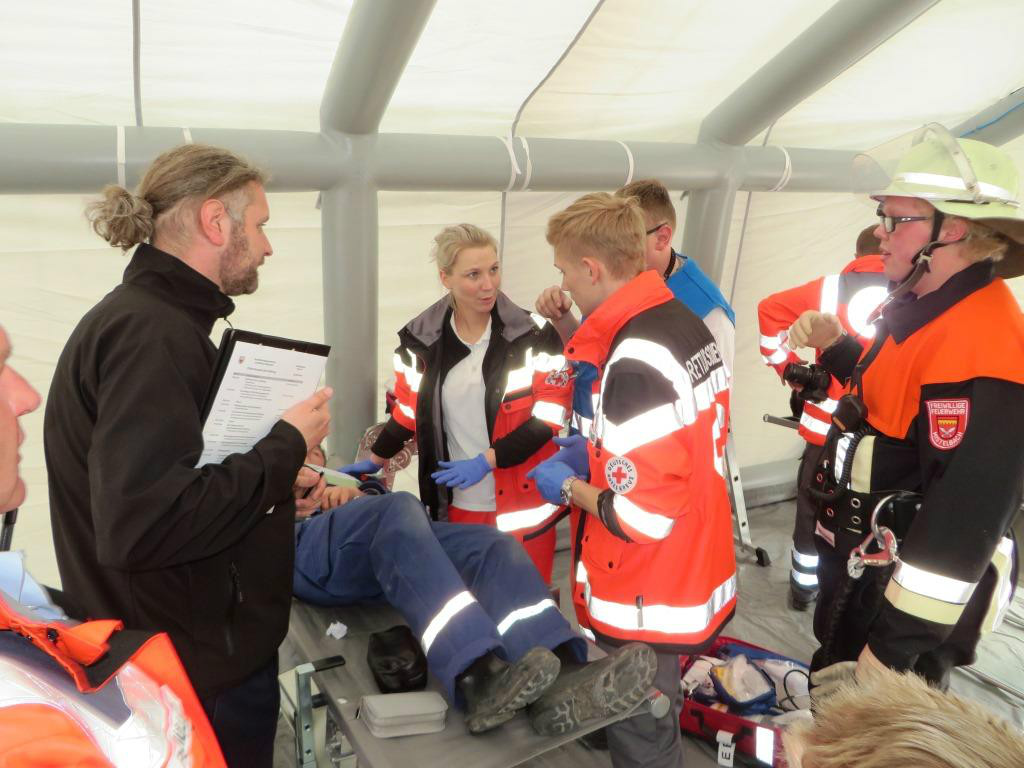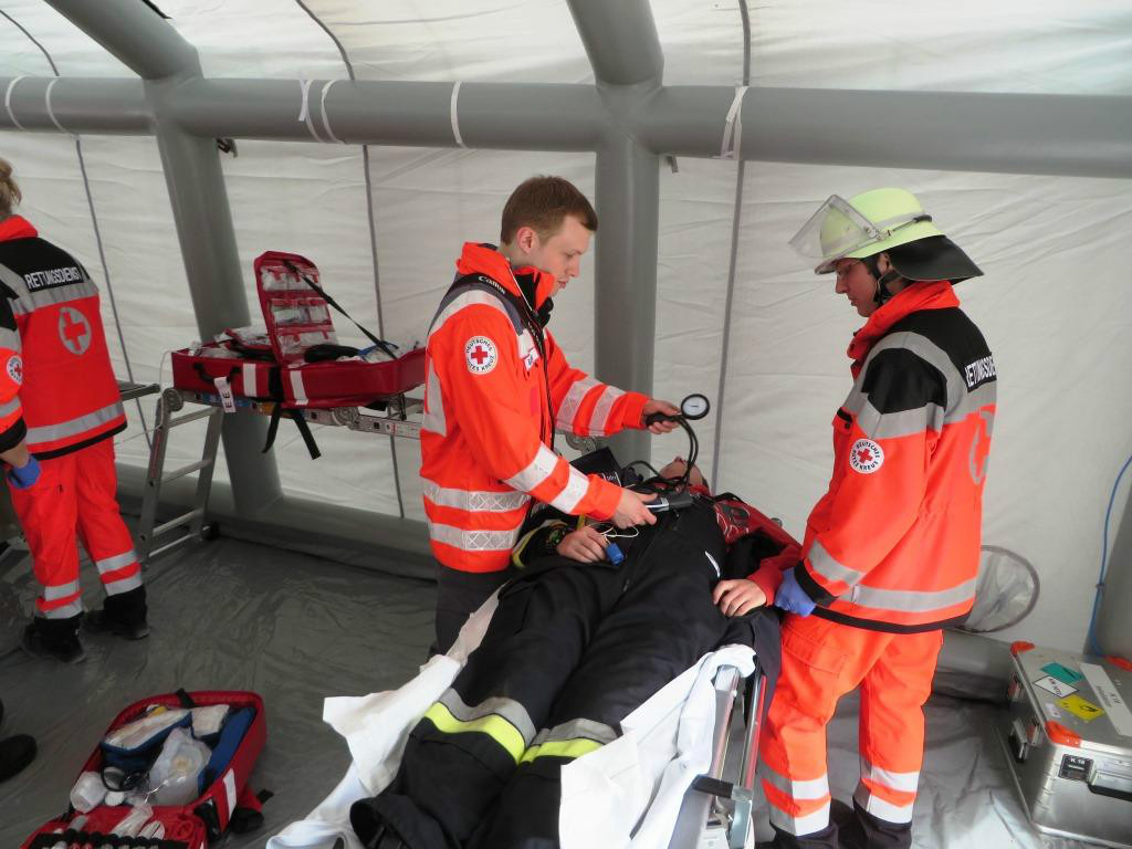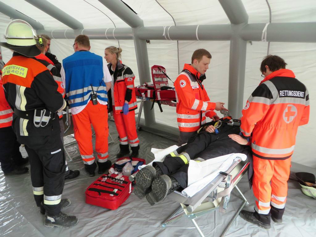 Hand in Hand erfolgte die Abarbeitung des Unfallgeschehens zwischen Feuerwehr, Rettungsdienst und Notarzt, bis letztendlich eine Übergabe der Verletzten an den Behandlungsplatz des BRK im schnellaufblasbaren Behandlungszelt erfolgte. Auch hier stellte man fest, wie sinnvoll, zweckmäßig und notwendig der Gerätewagen des BRK ist.