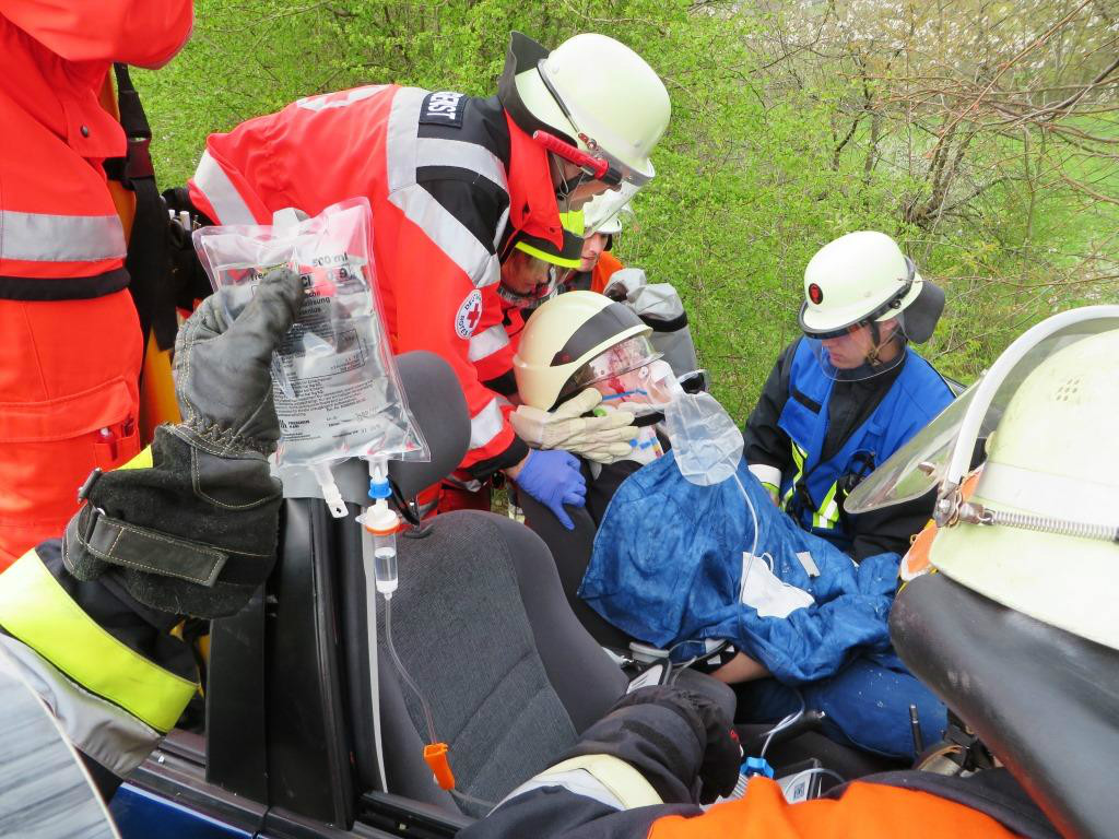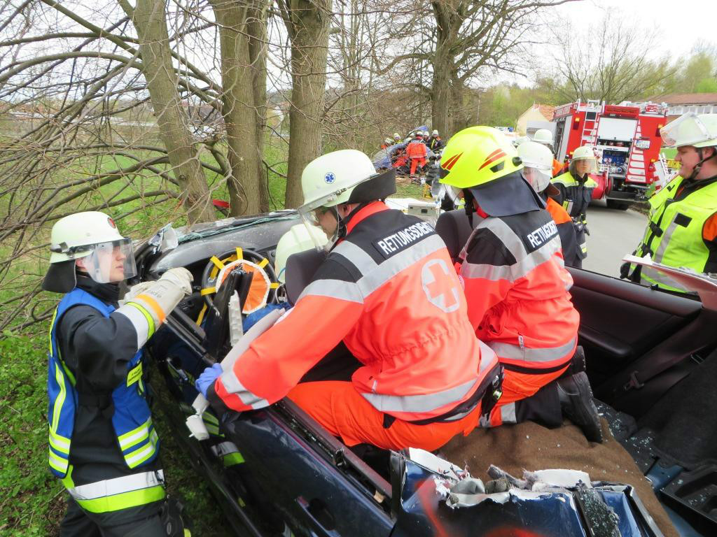 Im zweiten Szenario wurde ein Verkehrsunfall zweier Pkw mit eingeklemmter Person simuliert. Auch hier galt der schonenden Rettung der verunglückten Personen aus dem Fahrzeug ein besonderer Augenmerk.