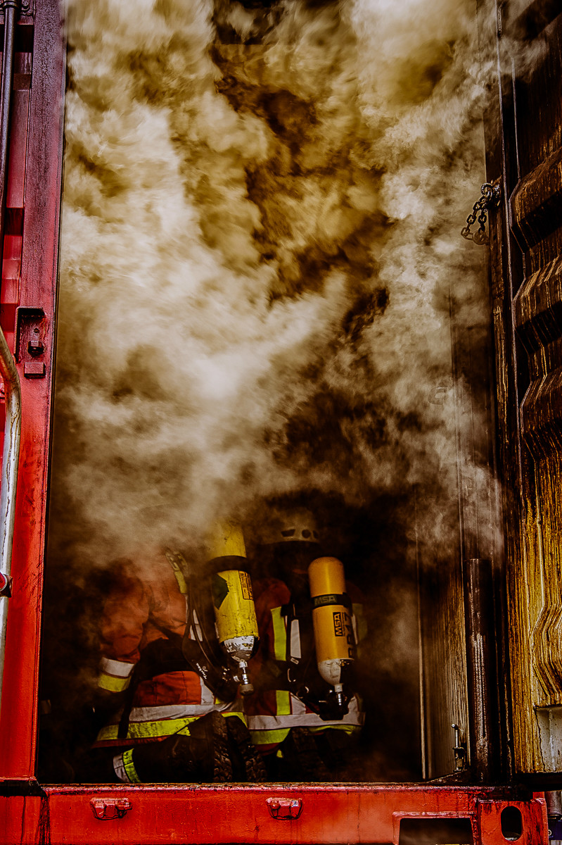 Im Container selbst werden an Decke und Wänden hängende Spanplatten, die als „Möbelersatz“ dienen, entzündet, was schließlich zu Temperaturen bis zu etwa 800 Grad Celsius führt und den acht Atemschutzgeräteträgern bei ihrem Durchgang ordentlich einheizte. Ein Vorgehen in knieender Körperhaltung war daher dringend anzuraten. Nach dieser Initialzündung wird die noch offene Containertür geschlossen, was bewirkt, dass kein Sauerstoff mehr zugeführt wird, der Rauch aber auch nicht mehr abziehen kann. Eine sogenannte unvollständige Verbrennung entsteht. Während dieser Phase ist die Sicht der einzelnen Teilnehmer wegen des Brandrauches praktisch bei „Null“. Daraufhin wird die Containertür wieder geöffnet, Sauerstoff strömt ein und das Feuer wird schlagartig größer. In der Rauchschicht über den Helmen der Teilnehmer bilden sich kleinere Flammenzungen (sogenannte „tanzende Engel“), die den Beginn der eigentlichen Rauchdurchzündung markieren. Mittels Hohlstrahlrohr konnten die Teilnehmer dann ihre Löschtechnik verbessern. Ein voll ausgerüsteter Sicherungstrupp überwachte den Durchlauf.