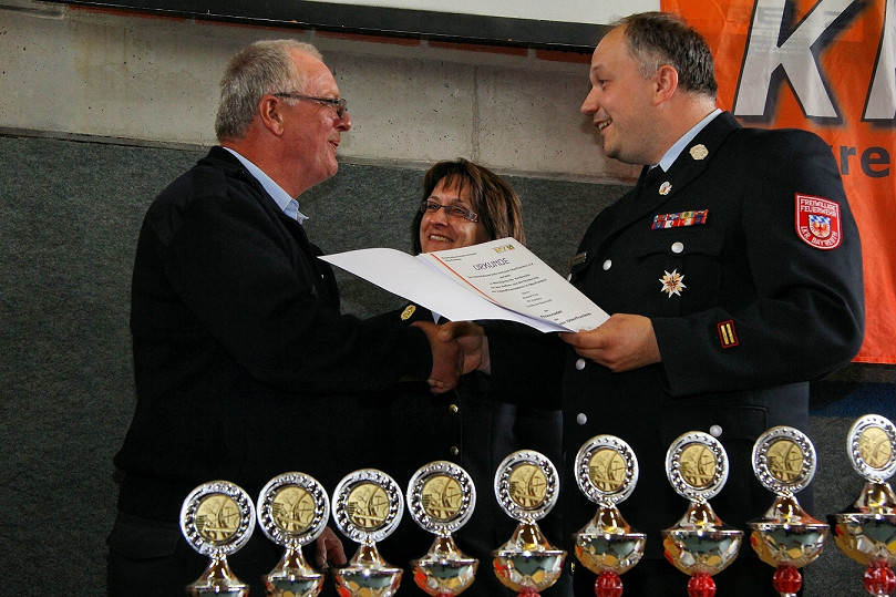 In seiner Laudatio dankte Bezirksjugendfeuerwehrwart  KBM  Stefan Steger dem sichtlich überraschten Rudi Fick für sein langjähriges und unermüdliches Arbeiten mit und für die Jugendfeuerwehren und als Schiedsrichter im Landkreis Bayreuth und im Bezirk Oberfranken.