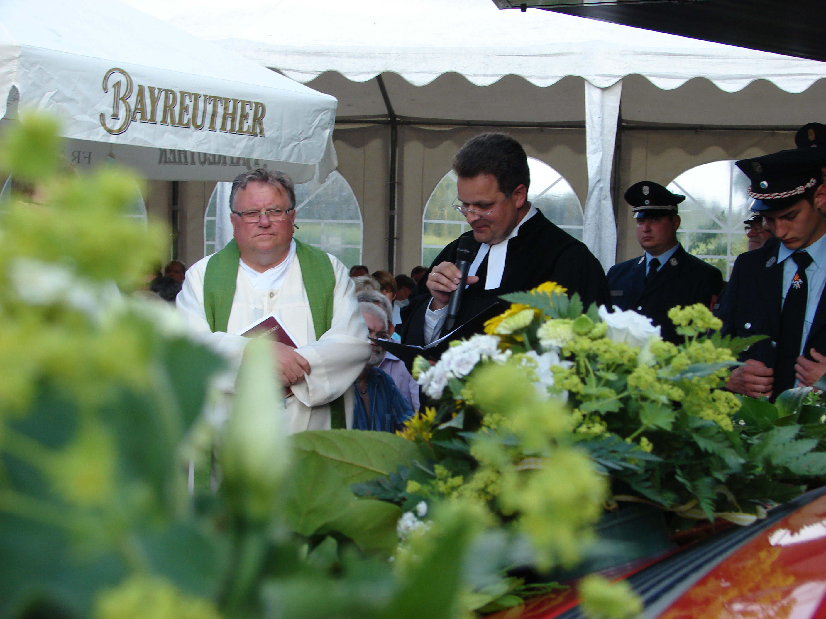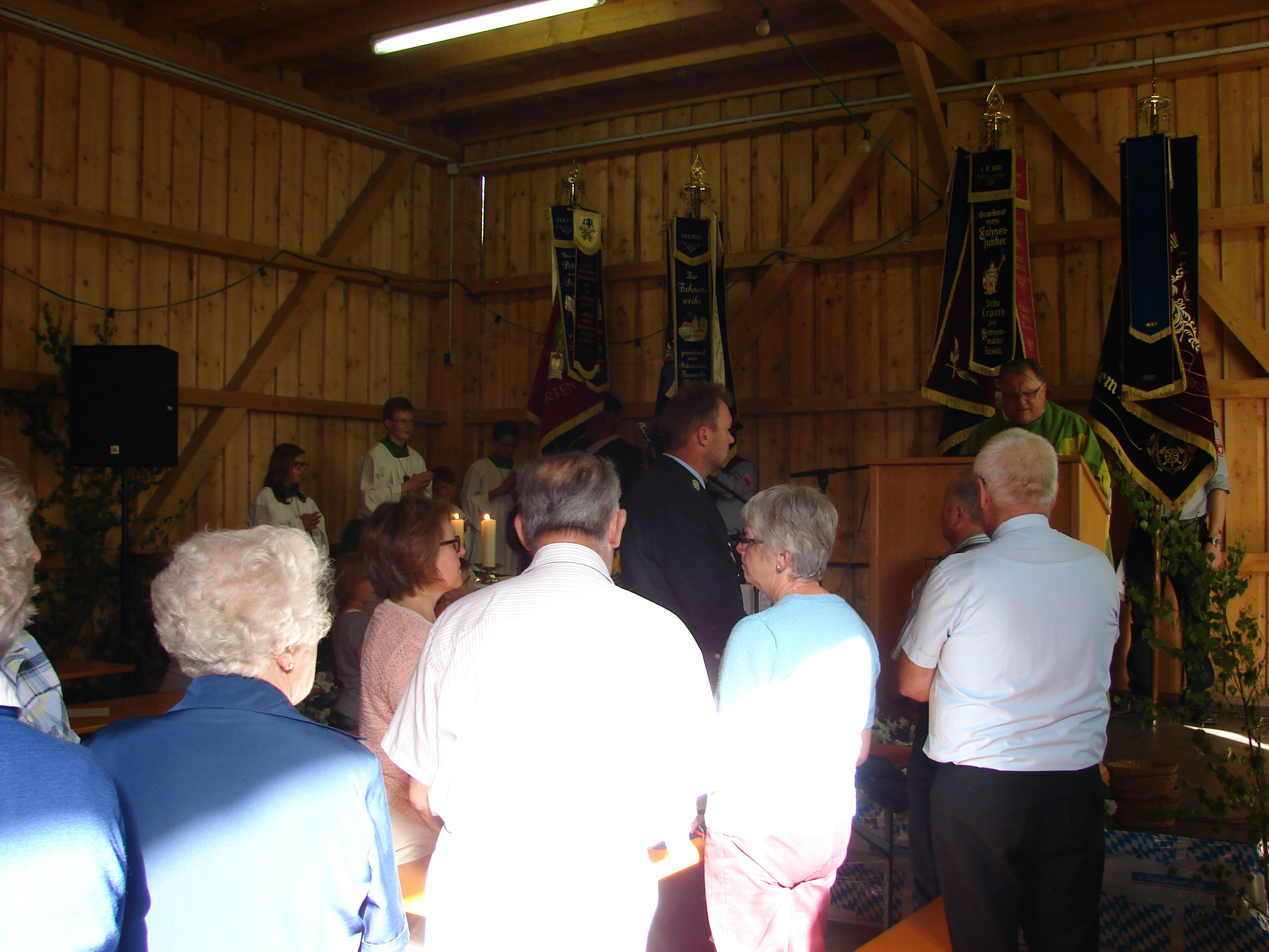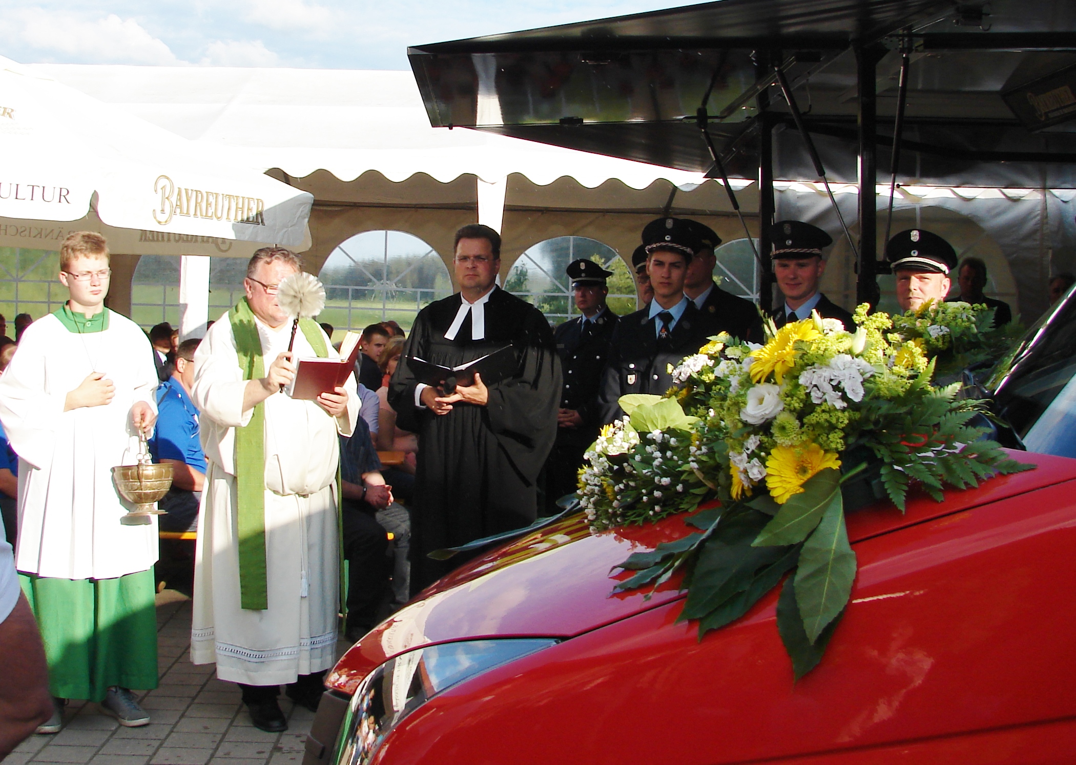 In der Festhalle fand unter der Leitung von Herrn Pfarrer Forster ein Vorabendgottesdienst statt. Die anschließende Segnung des Fahrzeuges wurde zusammen mit dem evang. Pfarrer Günter Daum durchgeführt. Beide Pfarrer betonten die besonderer Tätigkeit der Feuerwehren und stellten das Fahrzeug und die gesamte Mannschaft unter den Schutz Gottes.