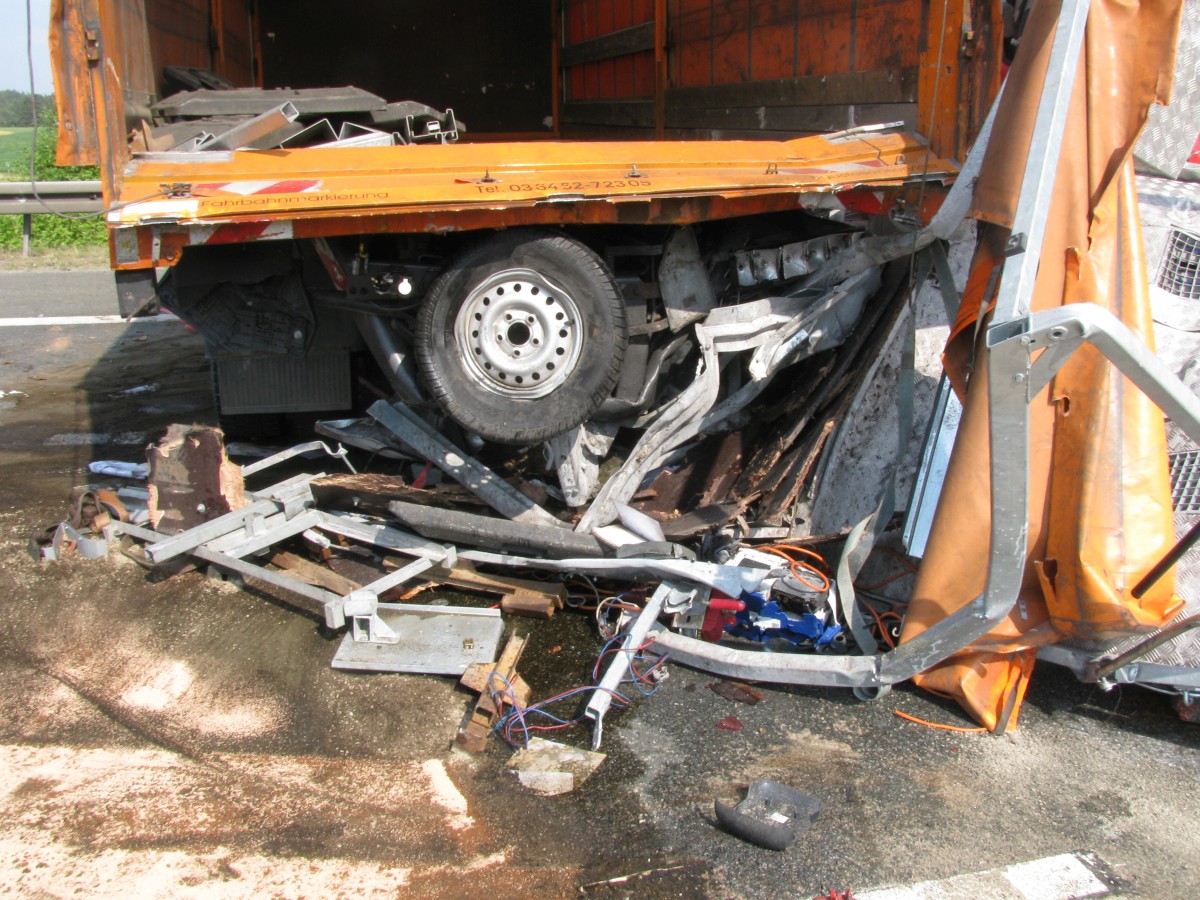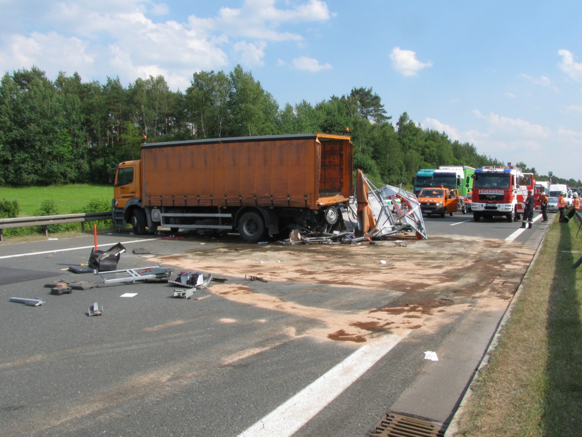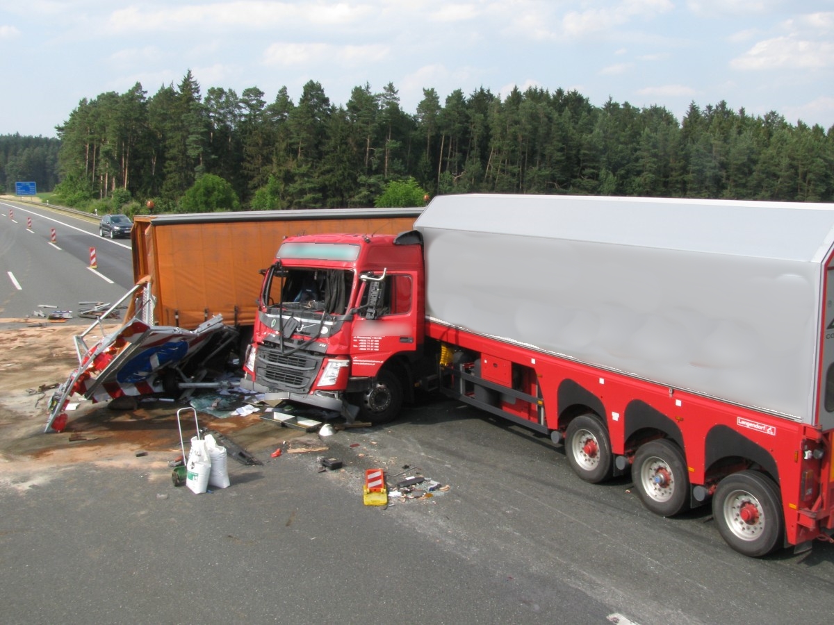 Zu einem LKW-Unfall wurden am 07.07.2015 kurz vor 16 Uhr die Feuerwehren aus Ottenhof-Bernheck, Pegnitz und Plech auf die Autobahn A9 alarmiert. Zwischen den Anschlussstellen Plech und Weidensees war ein Lastkraftwagen in einen Warnleitanhänger gekracht. Dieser sollte eine gerade eingerichtete Baustelle absichern. Der LKW-Fahrer verletzte sich dabei zum Glück nur leicht, so dass für die Freiwillige Feuerwehr Pegnitz bereits auf der Anfahrt „Alarm Stopp“ gegeben werden konnte. Die Arbeit der Feuerwehr beschränkte sich bei dem Einsatz auf die Aufnahme der auslaufenden Betriebsstoffe und die Reinigung der Fahrbahn.