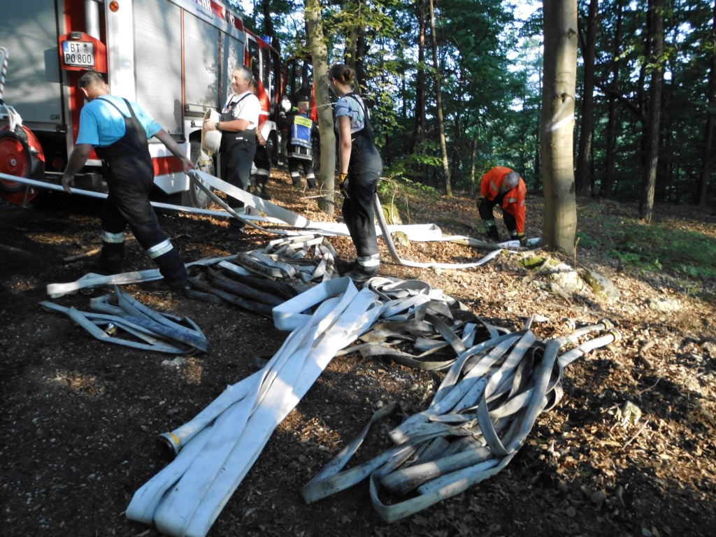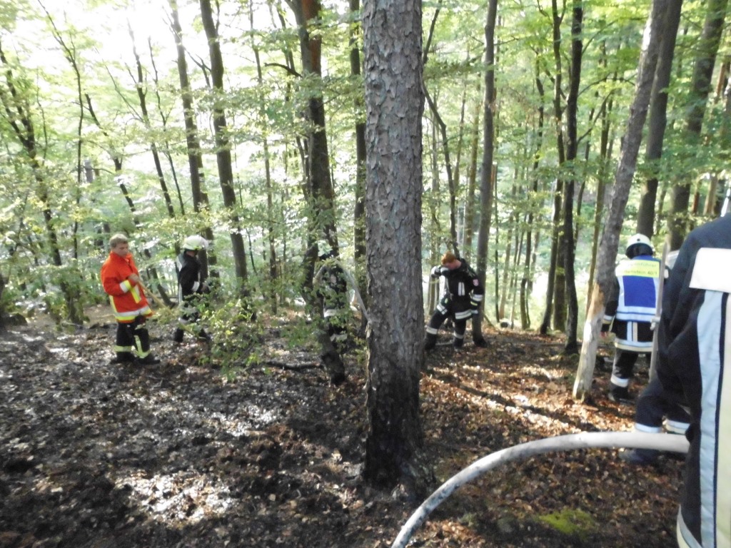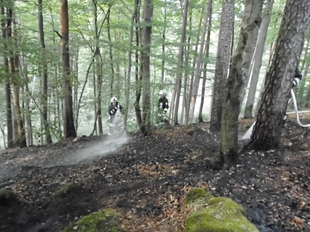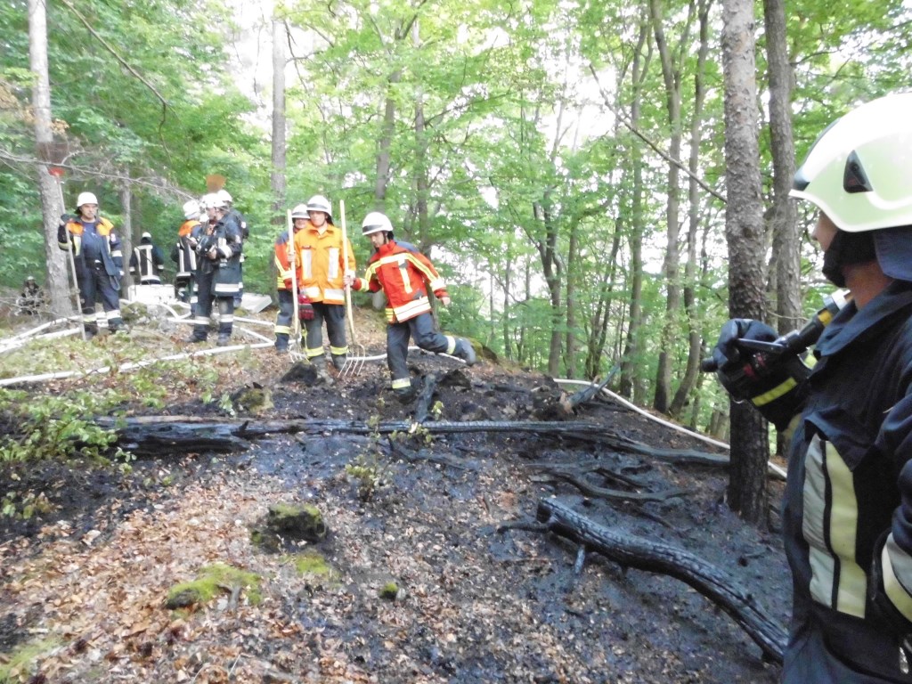 Am frühen Abend des 06.08.2015 kurz nach 17:00 Uhr wurde die Feuerwehr Pottenstein zum Erkunden einer Rauchentwicklung im Staatsforst „Prüll“ oberhalb des Püttlachtals im Bereich „Pöppelloch“ alarmiert. Bei einem der zur Zeit täglichen Kontrollflüge hatte der Luftbeobachter Kater Bayreuth Land 15/1 einen Brand in schwer zugänglichem Gelände gemeldet. Durch die Unterstützung aus der Luft konnte die abgelegene Einsatzstelle zügig erreicht und von den Führungskräften der Feuerwehr Pottenstein, unterstützt von KBI Adolf Mendel und KBM Siegfried Stiefler, erkundet werden. Dabei wurde festgestellt, dass sich in dem Bereich mittlerweile ein Waldbrand auf einer Fläche von ca. 200 m² entwickelt hatte. Daraufhin wurde von der Einsatzleitung die sofortige Nachalarmierung von wasserführenden Fahrzeugen veranlasst. Die ILS Bayreuth / Kulmbach alarmierte die Feuerwehren Kirchenbirkig, Pegnitz und Gößweinstein aus dem Nachbarlandkreis Forchheim. Die Einsatzkräfte begannen umgehend mit der Brandbekämpfung und nahmen hierfür mehrere C-Leitungen vor. Um das Löschwasser an die Brandstelle zu befördern, musste außerdem vom Pottensteiner HLF 20 eine mehrere hundert Meter lange Schlauchleitung erstellt werden. Mit den beiden Tanklöschfahrzeugen der Feuerwehr Pegnitz wurde ein „Pendelverkehr“ eingerichtet. Um Glutnester im Waldboden ablöschen zu können, musste dieser mühsam mit Dunghacken „aufgerissen“ werden. Bei Temperaturen weit über 30 ° Celsius war dies für die Einsatzkräfte eine sehr hohe körperliche Belastung. Zum Lokalisieren der Glutnester wurden zwei Wärmebildkameras eingesetzt. Der Rettungsdienst und die Polizei waren ebenfalls vor Ort. An dieser Stelle möchten wir ein herzliches Dankeschön an unsere „Luftuntersützung“ richten. Außerdem noch einmal unser dringender Appell, aufgrund der Trockenheit äußerste Vorsicht in unseren Wäldern und Waldgebieten walten zu lassen. Bitte denken Sie auch daran, Waldwege nicht zuzuparken, damit die Zufahrtswege für die Feuerwehren frei bleiben !