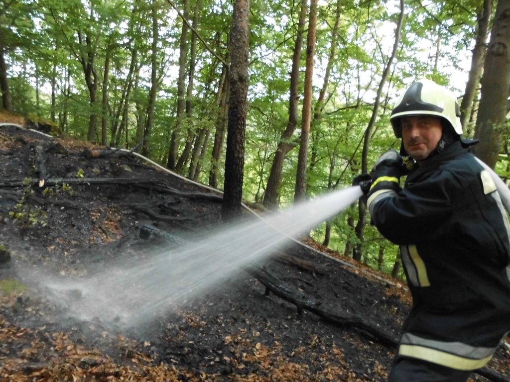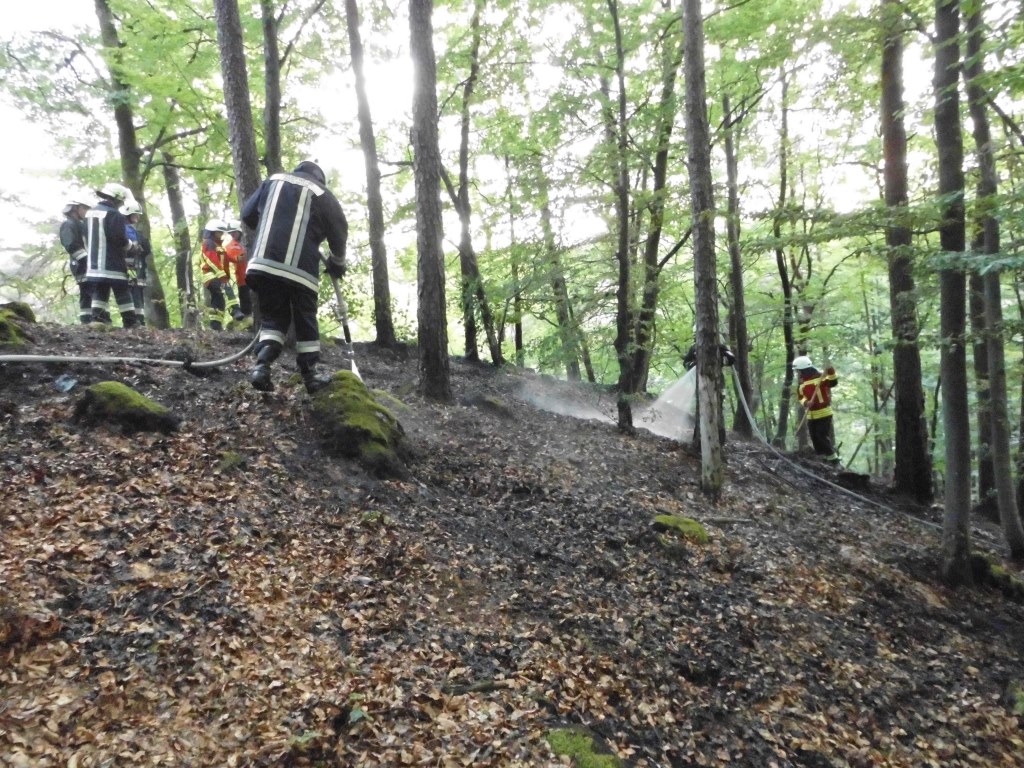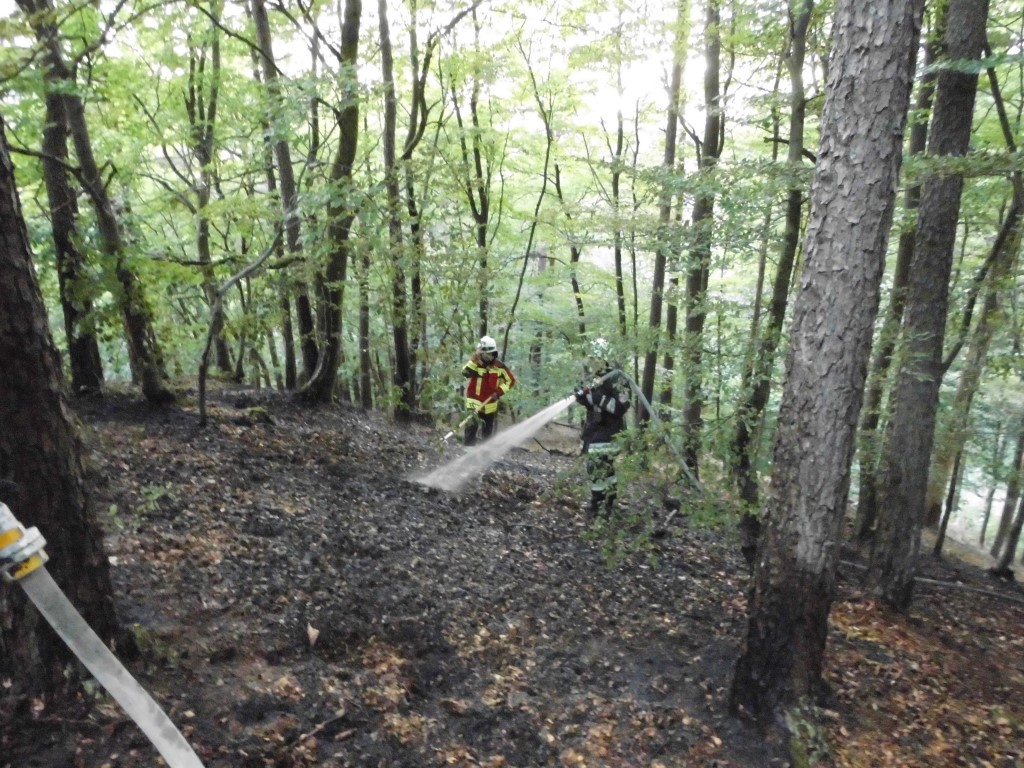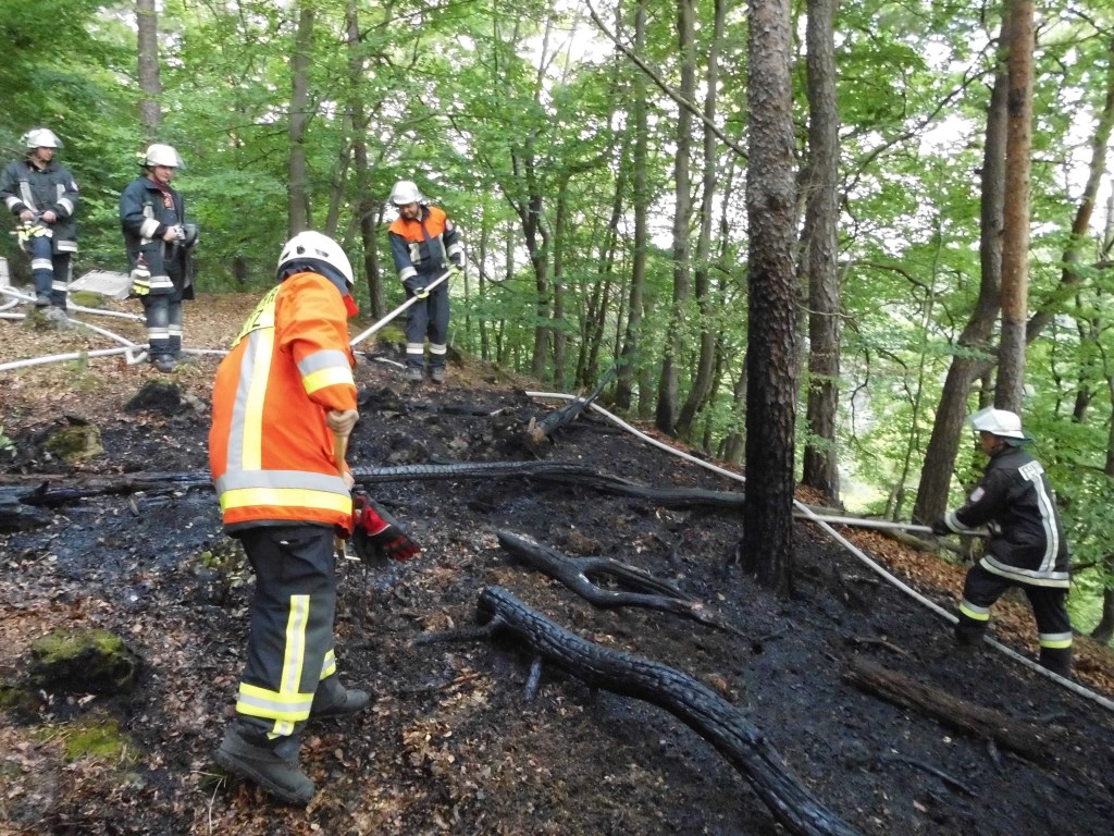 Am frühen Abend des 06.08.2015 kurz nach 17:00 Uhr wurde die Feuerwehr Pottenstein zum Erkunden einer Rauchentwicklung im Staatsforst „Prüll“ oberhalb des Püttlachtals im Bereich „Pöppelloch“ alarmiert. Bei einem der zur Zeit täglichen Kontrollflüge hatte der Luftbeobachter Kater Bayreuth Land 15/1 einen Brand in schwer zugänglichem Gelände gemeldet. Durch die Unterstützung aus der Luft konnte die abgelegene Einsatzstelle zügig erreicht und von den Führungskräften der Feuerwehr Pottenstein, unterstützt von KBI Adolf Mendel und KBM Siegfried Stiefler, erkundet werden. Dabei wurde festgestellt, dass sich in dem Bereich mittlerweile ein Waldbrand auf einer Fläche von ca. 200 m² entwickelt hatte. Daraufhin wurde von der Einsatzleitung die sofortige Nachalarmierung von wasserführenden Fahrzeugen veranlasst. Die ILS Bayreuth / Kulmbach alarmierte die Feuerwehren Kirchenbirkig, Pegnitz und Gößweinstein aus dem Nachbarlandkreis Forchheim. Die Einsatzkräfte begannen umgehend mit der Brandbekämpfung und nahmen hierfür mehrere C-Leitungen vor. Um das Löschwasser an die Brandstelle zu befördern, musste außerdem vom Pottensteiner HLF 20 eine mehrere hundert Meter lange Schlauchleitung erstellt werden. Mit den beiden Tanklöschfahrzeugen der Feuerwehr Pegnitz wurde ein „Pendelverkehr“ eingerichtet. Um Glutnester im Waldboden ablöschen zu können, musste dieser mühsam mit Dunghacken „aufgerissen“ werden. Bei Temperaturen weit über 30 ° Celsius war dies für die Einsatzkräfte eine sehr hohe körperliche Belastung. Zum Lokalisieren der Glutnester wurden zwei Wärmebildkameras eingesetzt. Der Rettungsdienst und die Polizei waren ebenfalls vor Ort. An dieser Stelle möchten wir ein herzliches Dankeschön an unsere „Luftuntersützung“ richten. Außerdem noch einmal unser dringender Appell, aufgrund der Trockenheit äußerste Vorsicht in unseren Wäldern und Waldgebieten walten zu lassen. Bitte denken Sie auch daran, Waldwege nicht zuzuparken, damit die Zufahrtswege für die Feuerwehren frei bleiben !