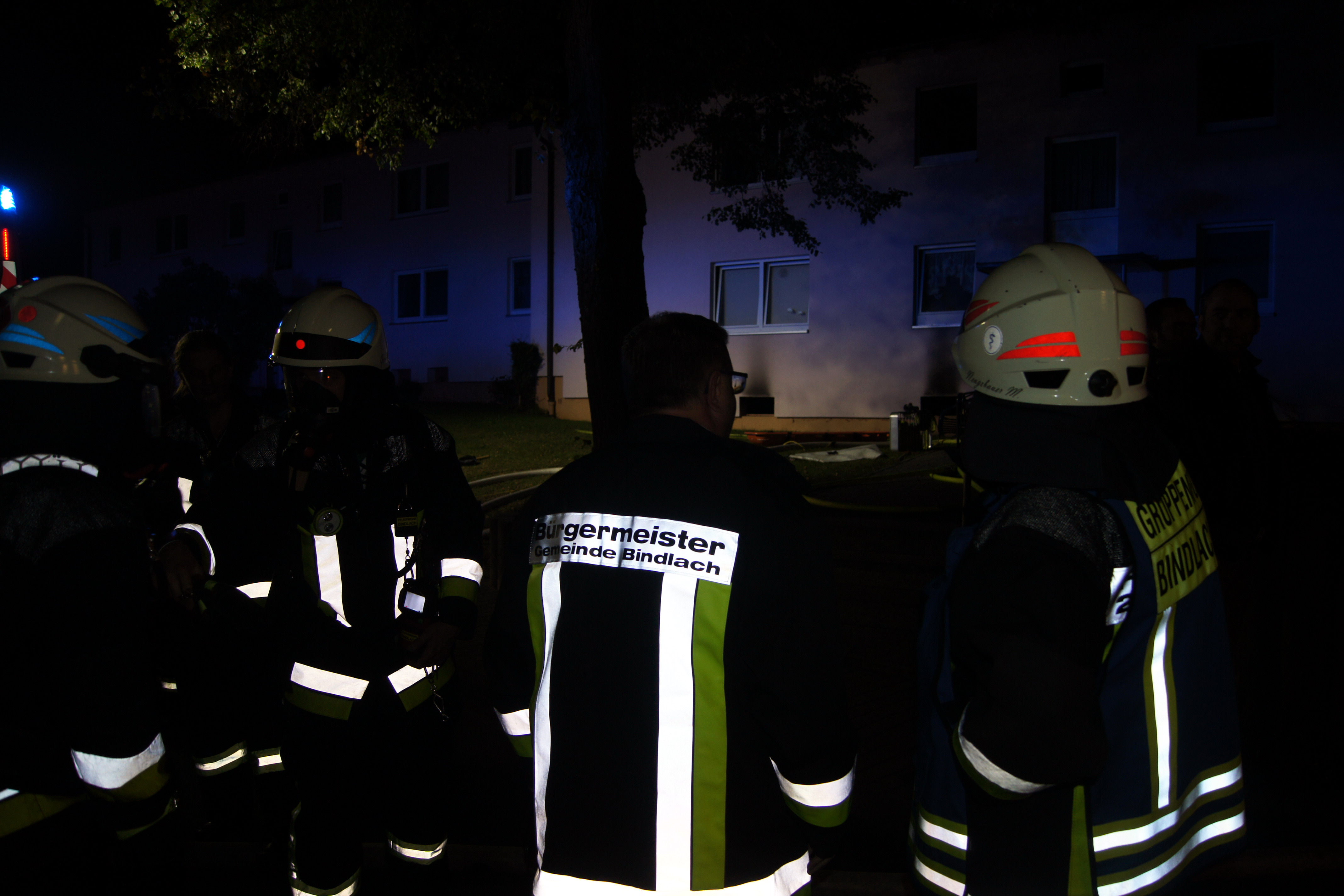 Die ebenfalls alarmierten Feuerwehren der Ständigen Wache Bayreuth und Crottendorf konnten nach kurzer Zeit die Einsatzstelle verlassen, für die Feuerwehr Bindlach endete der Einsatz erst nach über drei Stunden. Neben Rettungsdienst und Polizei machte sich Bürgermeister Gerald Kolb ein Bild von der Lage vor Ort. Die Bewohner konnten vorerst nicht in ihre Wohnungen zurückkehren. Feuerwehrleute holten den besorgten Mietern unter Atemschutz wichtige persönliche Gegenstände wie Medikamente und Kleidung aus den verrußten Wohnungen, ehe das Haus versperrt wurde.