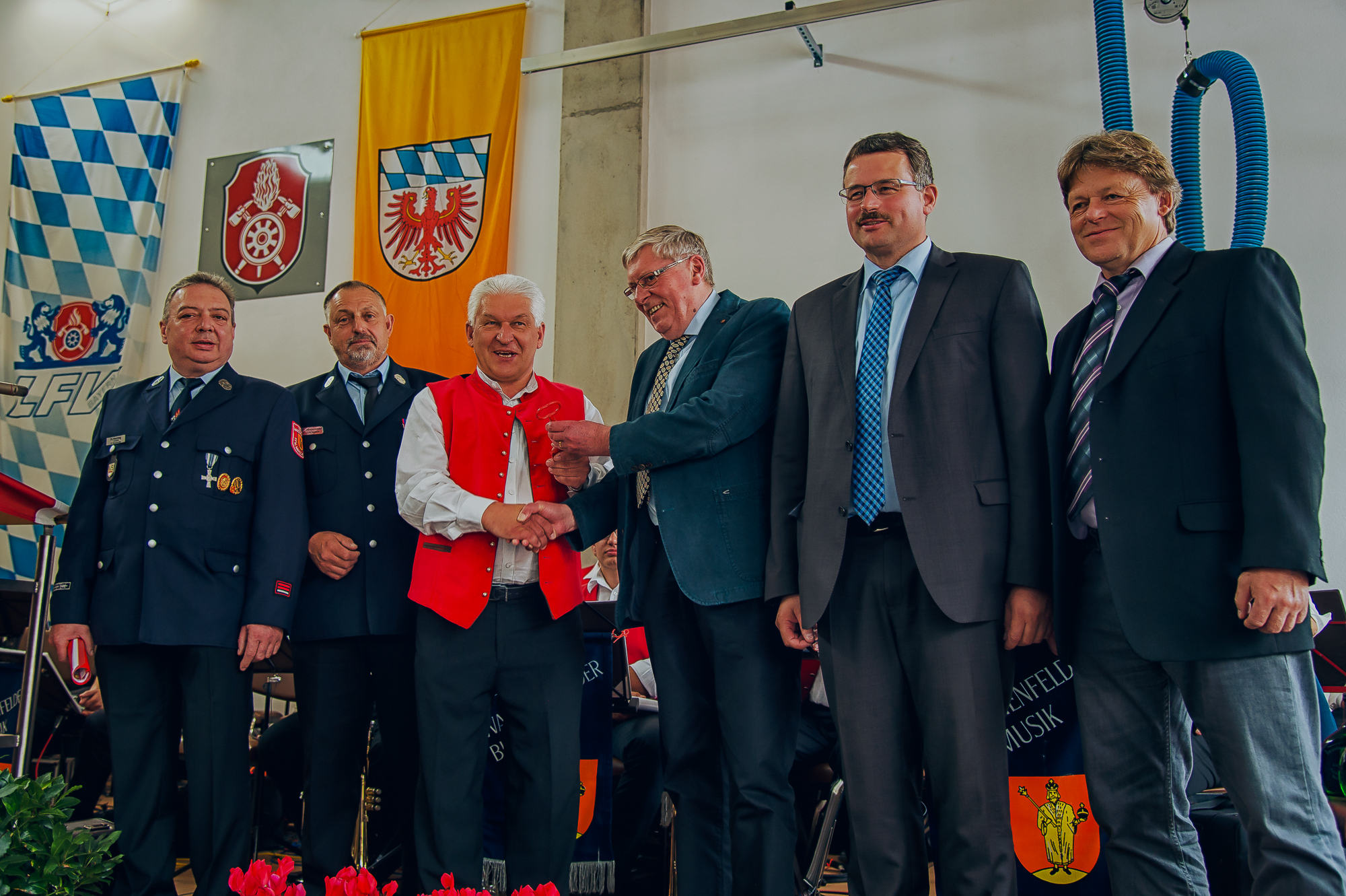 Architekt Hartmut Schmidt bot einen Überblick über die Bauzeit und die Räumlichkeiten des neuen Gebäudes. Symbolisch übergab er den Schlüssel des Feuerwehrhauses an den Bürgermeister und seine beiden Stellvertretern, welche diesen an die Waischenfelder Feuerwehrführung weiterreichten.