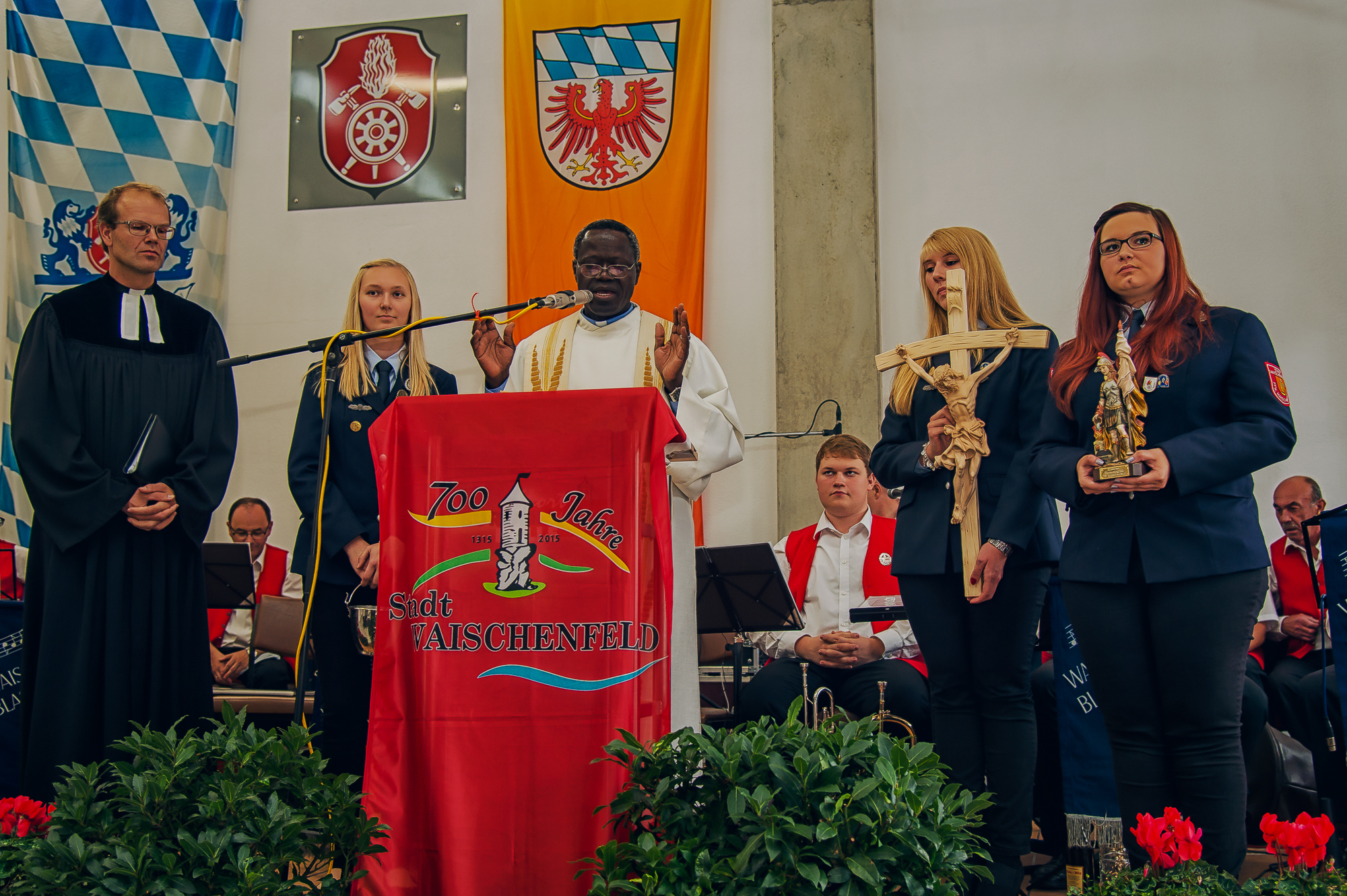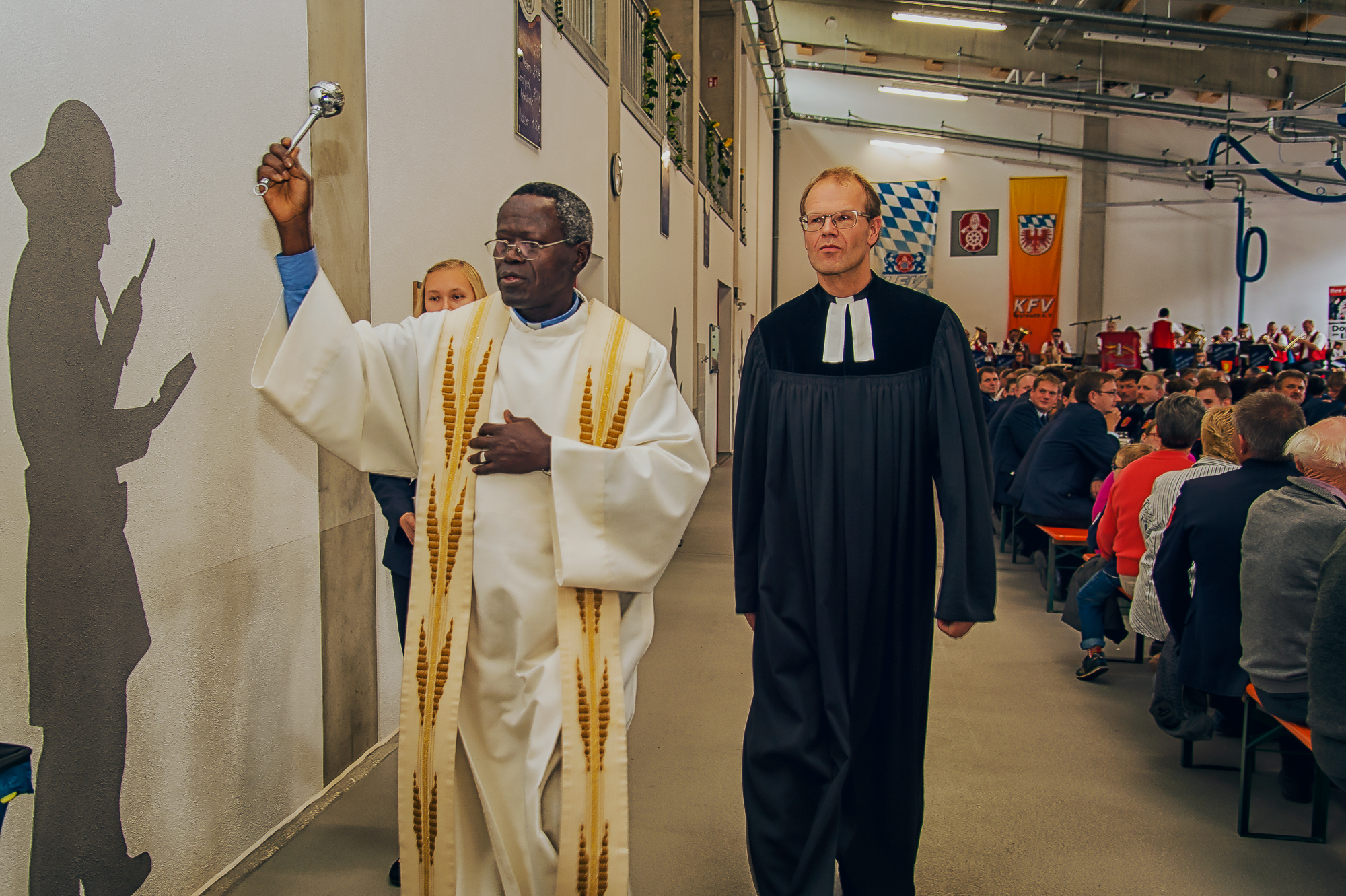 In einer würdigen Zeremonie weihten Abbé Patrice Mor Faye und Pfarrer Dr. Peter Zeh das Gebäude. Mit einer Lesung aus dem Lukasevangelium, gemeinsamen Gebeten und Fürbitten erinnerten sie daran, dass der Wahlspruch der Feuerwehren „Gott zur Ehr, dem Nächsten zur Wehr“ dem Liebesgebot Jesu entspreche und der helfende Samariter das Leitbild aller Rettungsorganisationen darstelle.