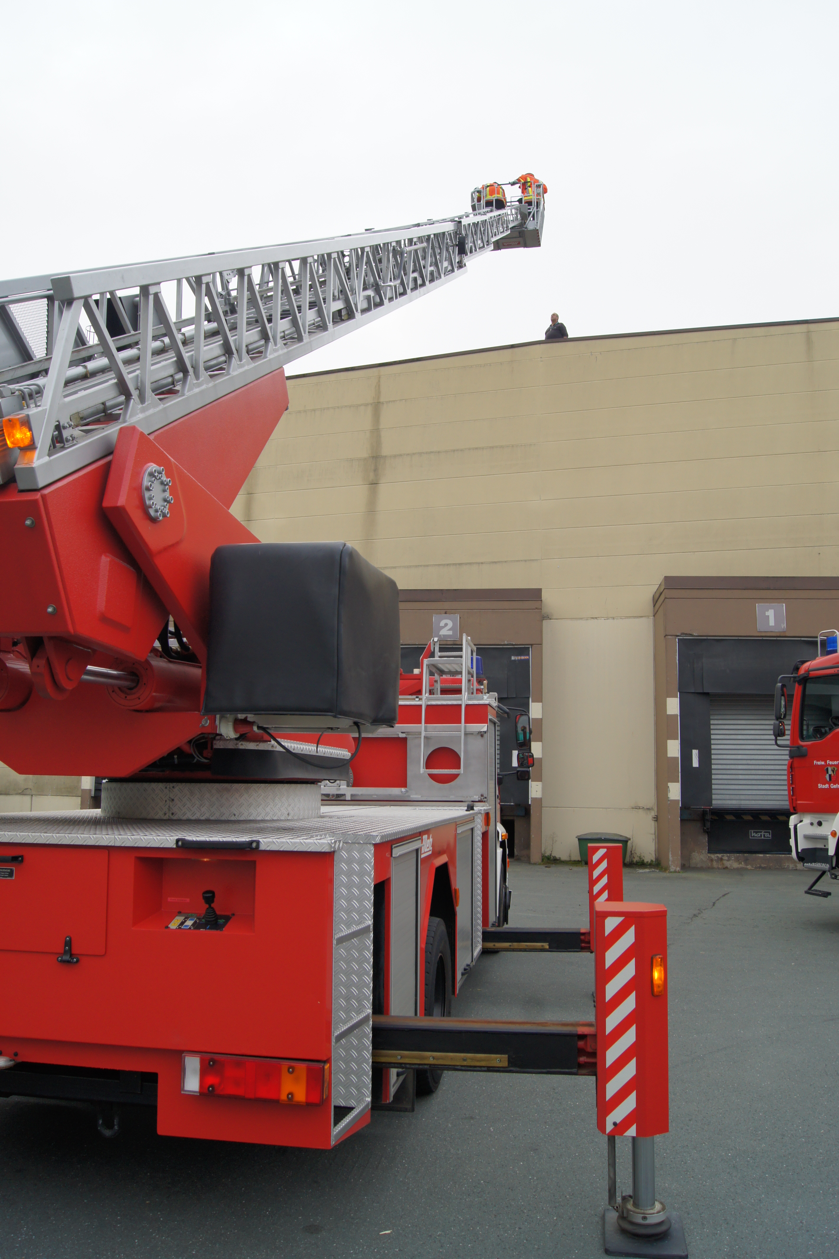 Abschnitt 1: Menschenrettung aus Labor und Dach, zugleich Abschirmung der eigenen Kräfte, Wasserentnahme aus Hydranten und Tanklöschfahrzeug