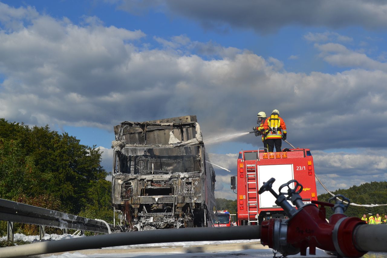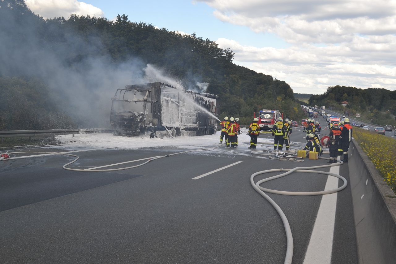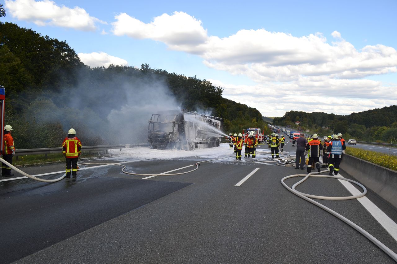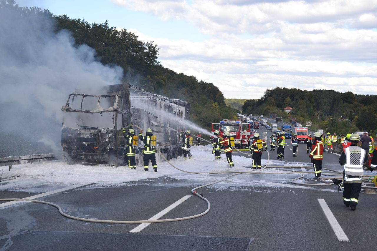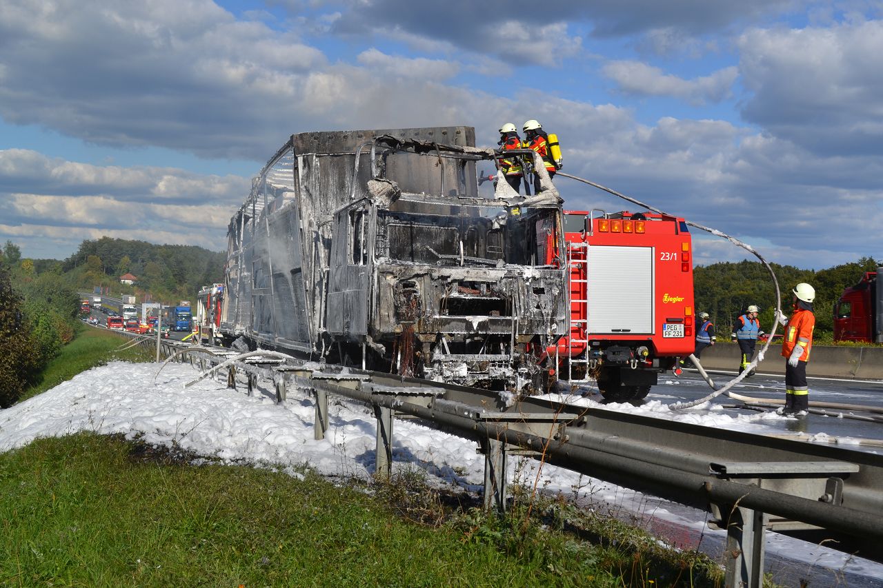 Kurz nach 14.30 Uhr war ein 44-jähriger Pole mit seinem Sattelzug auf der Autobahn in Richtung Nürnberg unterwegs. Kurz vor der Anschlussstelle Hormersdorf qualmte es plötzlich im Führerhaus der Zugmaschine und der Fahrer konnte seinen Lastwagen gerade noch rechtzeitig auf dem Standstreifen zum Stehen bringen. Rasch griffen Flammen von der Sattelzugmaschine auf das gesamte Fahrzeug über. Sofort eilten mehrerer Streifenbesatzungen und Feuerwehrkräfte zu dem Brandort. Trotz des schnellen Einsatzes der Feuerwehren brannte der komplette Sattelzug einschließlich der Ladung, die aus 24 Tonnen Holzbrettern bestand, vollständig aus. Der Lastwagenfahrer kam mit dem Schrecken davon. Nach bisherigem Ermittlungsstand dürfte ein technischer Defekt im Motorraum ursächlich für den Brand gewesen sein. Der Gesamtschaden wird auf zirka 75.000 Euro beziffert. Aufgrund der Lösch- und Bergungsarbeiten musste die Autobahn längere Zeit total gesperrt werden und es bildete sich ein Rückstau von zeitweise bis zu zehn Kilometern. Die Bergungs- und Reinigungsmaßnahmen dauerten bis in die Nacht. Vor Ort waren die Feuerwehren aus Pegnitz, Schnaittach, Ottenhof, Hormersdorf und Plech. Das Technische Hilfswerk Pegnitz und die Autobahnmeisterei Trockau waren ebenfalls im Einsatz.
