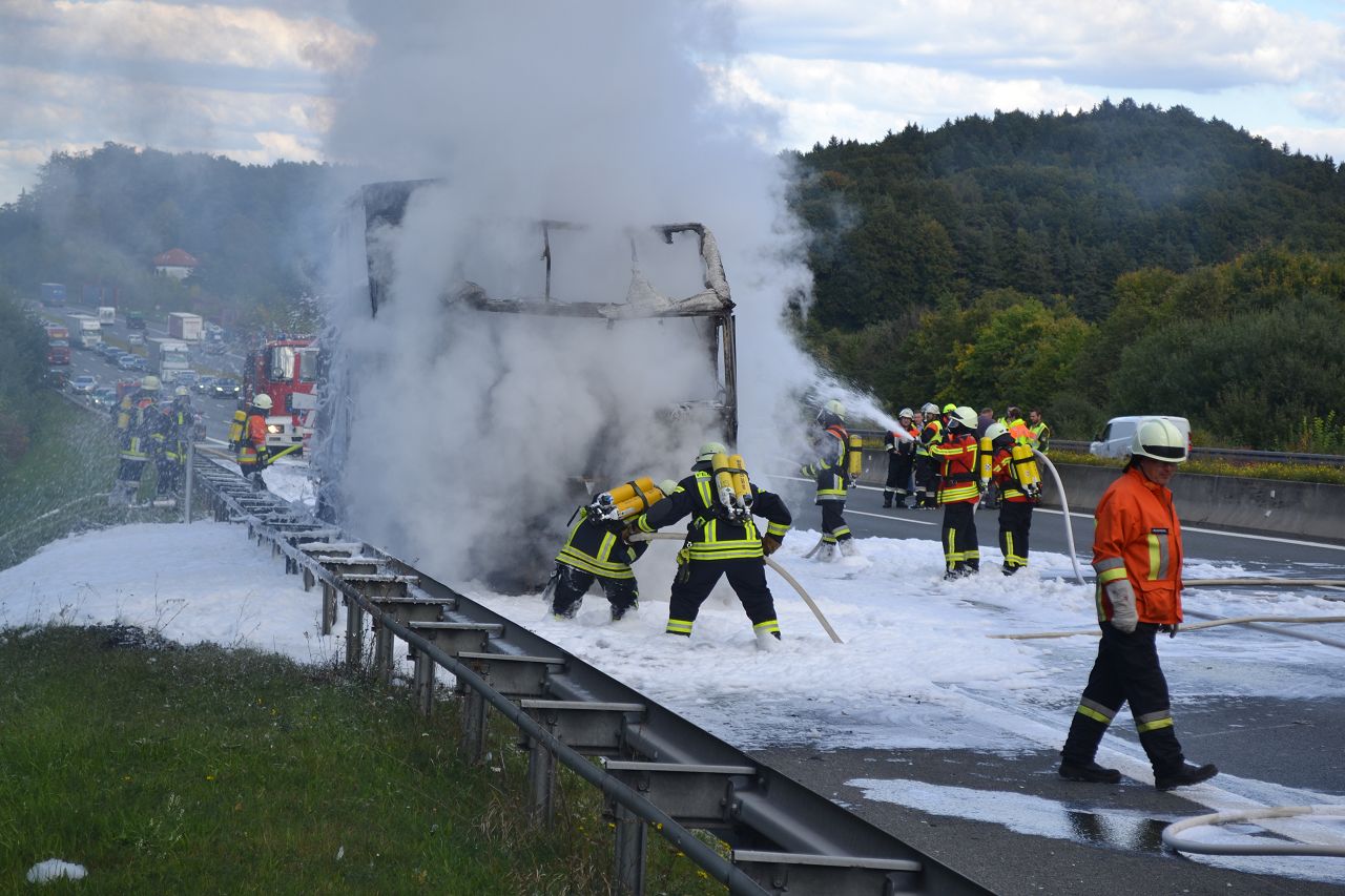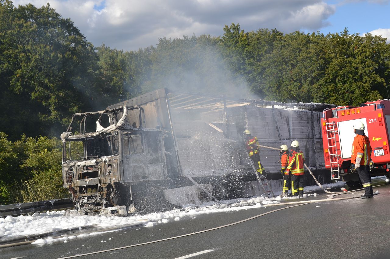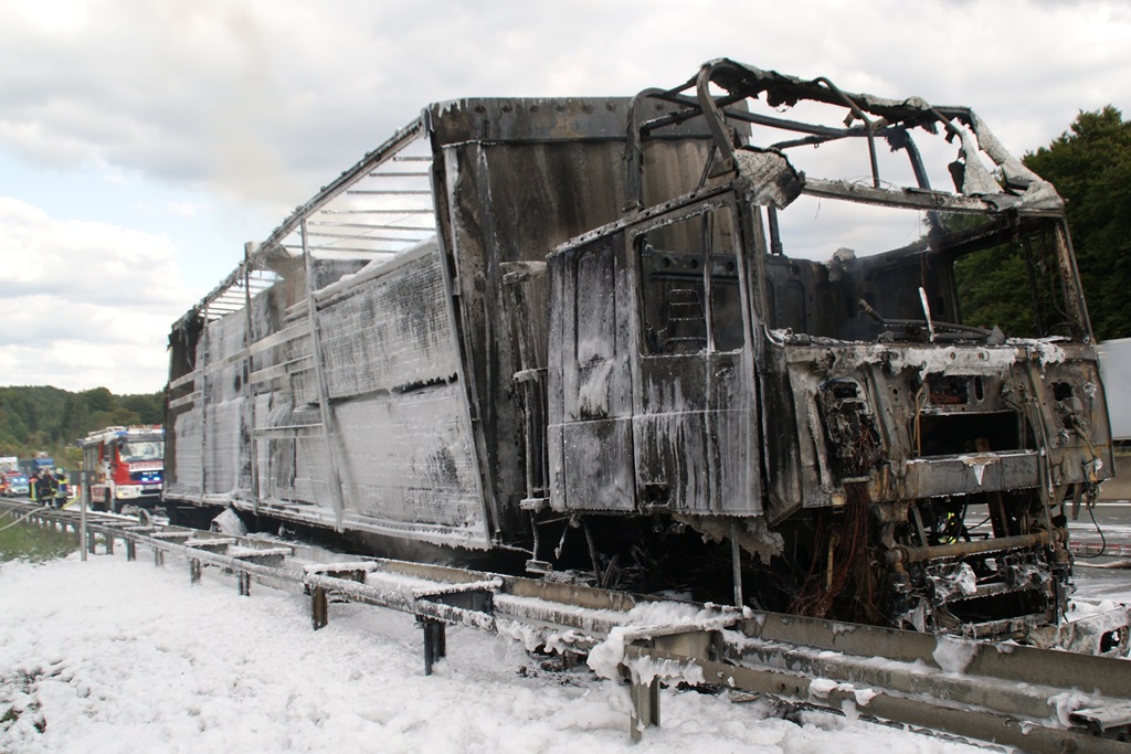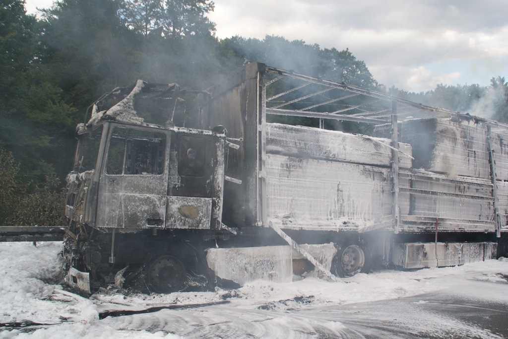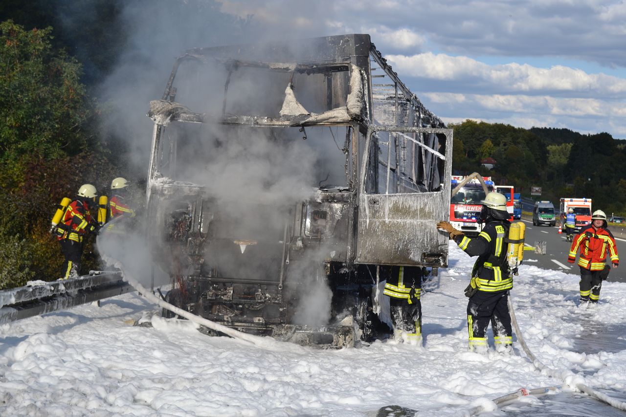 Kurz nach 14.30 Uhr war ein 44-jähriger Pole mit seinem Sattelzug auf der Autobahn in Richtung Nürnberg unterwegs. Kurz vor der Anschlussstelle Hormersdorf qualmte es plötzlich im Führerhaus der Zugmaschine und der Fahrer konnte seinen Lastwagen gerade noch rechtzeitig auf dem Standstreifen zum Stehen bringen. Rasch griffen Flammen von der Sattelzugmaschine auf das gesamte Fahrzeug über. Sofort eilten mehrerer Streifenbesatzungen und Feuerwehrkräfte zu dem Brandort. Trotz des schnellen Einsatzes der Feuerwehren brannte der komplette Sattelzug einschließlich der Ladung, die aus 24 Tonnen Holzbrettern bestand, vollständig aus. Der Lastwagenfahrer kam mit dem Schrecken davon. Nach bisherigem Ermittlungsstand dürfte ein technischer Defekt im Motorraum ursächlich für den Brand gewesen sein. Der Gesamtschaden wird auf zirka 75.000 Euro beziffert. Aufgrund der Lösch- und Bergungsarbeiten musste die Autobahn längere Zeit total gesperrt werden und es bildete sich ein Rückstau von zeitweise bis zu zehn Kilometern. Die Bergungs- und Reinigungsmaßnahmen dauerten bis in die Nacht. Vor Ort waren die Feuerwehren aus Pegnitz, Schnaittach, Ottenhof, Hormersdorf und Plech. Das Technische Hilfswerk Pegnitz und die Autobahnmeisterei Trockau waren ebenfalls im Einsatz.
