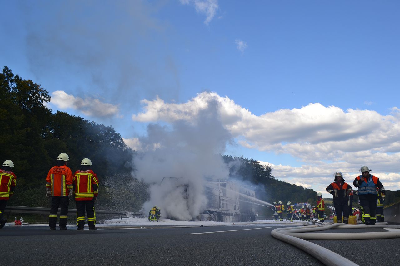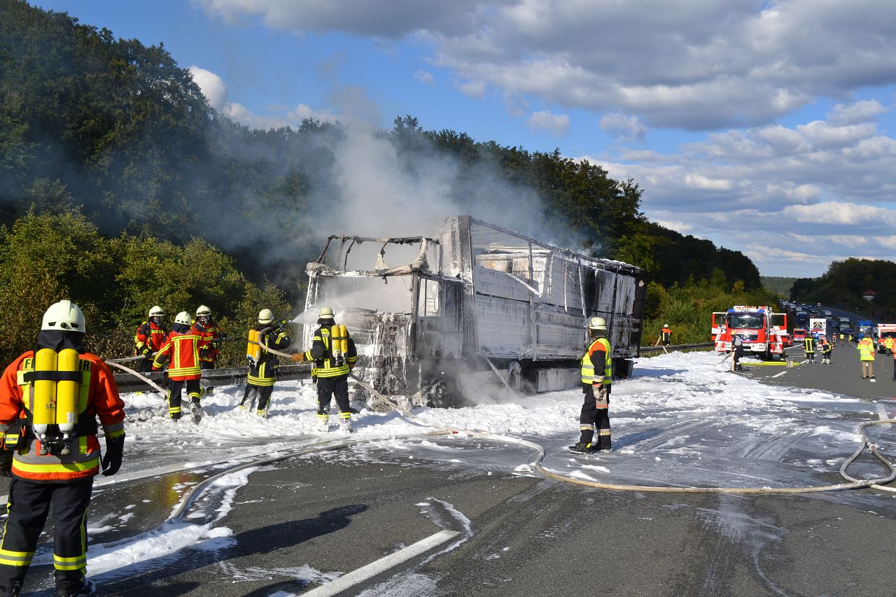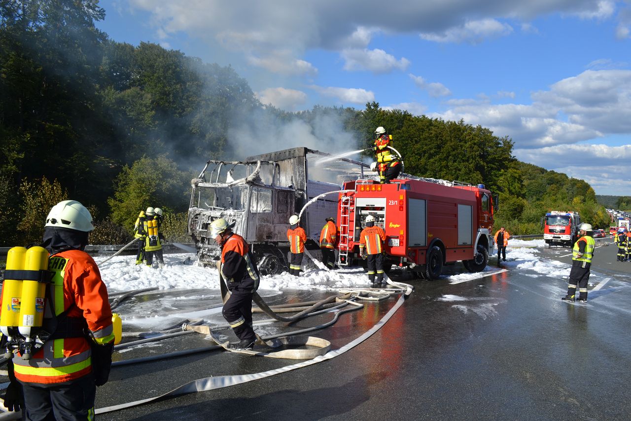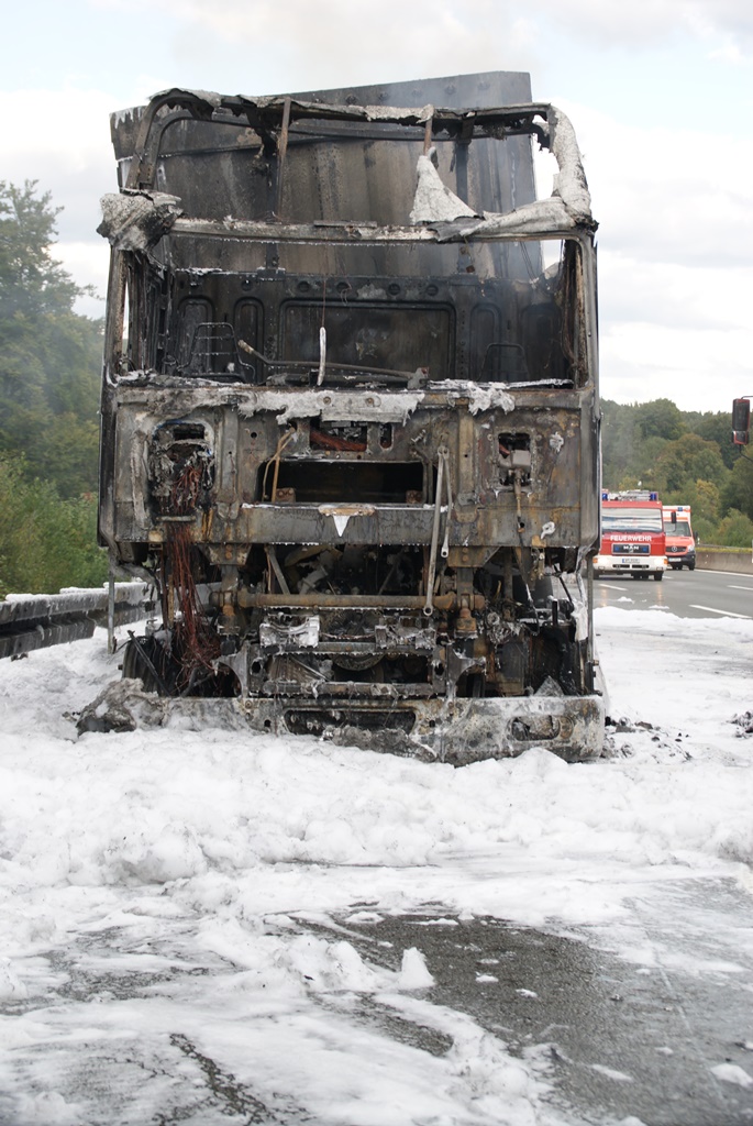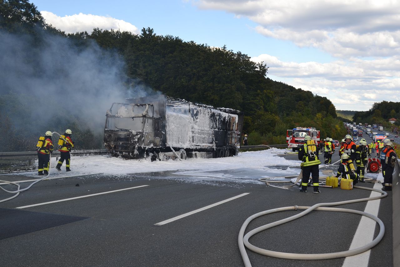 Kurz nach 14.30 Uhr war ein 44-jähriger Pole mit seinem Sattelzug auf der Autobahn in Richtung Nürnberg unterwegs. Kurz vor der Anschlussstelle Hormersdorf qualmte es plötzlich im Führerhaus der Zugmaschine und der Fahrer konnte seinen Lastwagen gerade noch rechtzeitig auf dem Standstreifen zum Stehen bringen. Rasch griffen Flammen von der Sattelzugmaschine auf das gesamte Fahrzeug über. Sofort eilten mehrerer Streifenbesatzungen und Feuerwehrkräfte zu dem Brandort. Trotz des schnellen Einsatzes der Feuerwehren brannte der komplette Sattelzug einschließlich der Ladung, die aus 24 Tonnen Holzbrettern bestand, vollständig aus. Der Lastwagenfahrer kam mit dem Schrecken davon. Nach bisherigem Ermittlungsstand dürfte ein technischer Defekt im Motorraum ursächlich für den Brand gewesen sein. Der Gesamtschaden wird auf zirka 75.000 Euro beziffert. Aufgrund der Lösch- und Bergungsarbeiten musste die Autobahn längere Zeit total gesperrt werden und es bildete sich ein Rückstau von zeitweise bis zu zehn Kilometern. Die Bergungs- und Reinigungsmaßnahmen dauerten bis in die Nacht. Vor Ort waren die Feuerwehren aus Pegnitz, Schnaittach, Ottenhof, Hormersdorf und Plech. Das Technische Hilfswerk Pegnitz und die Autobahnmeisterei Trockau waren ebenfalls im Einsatz.