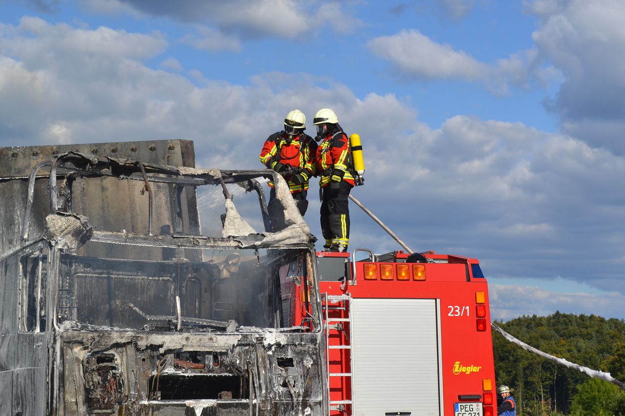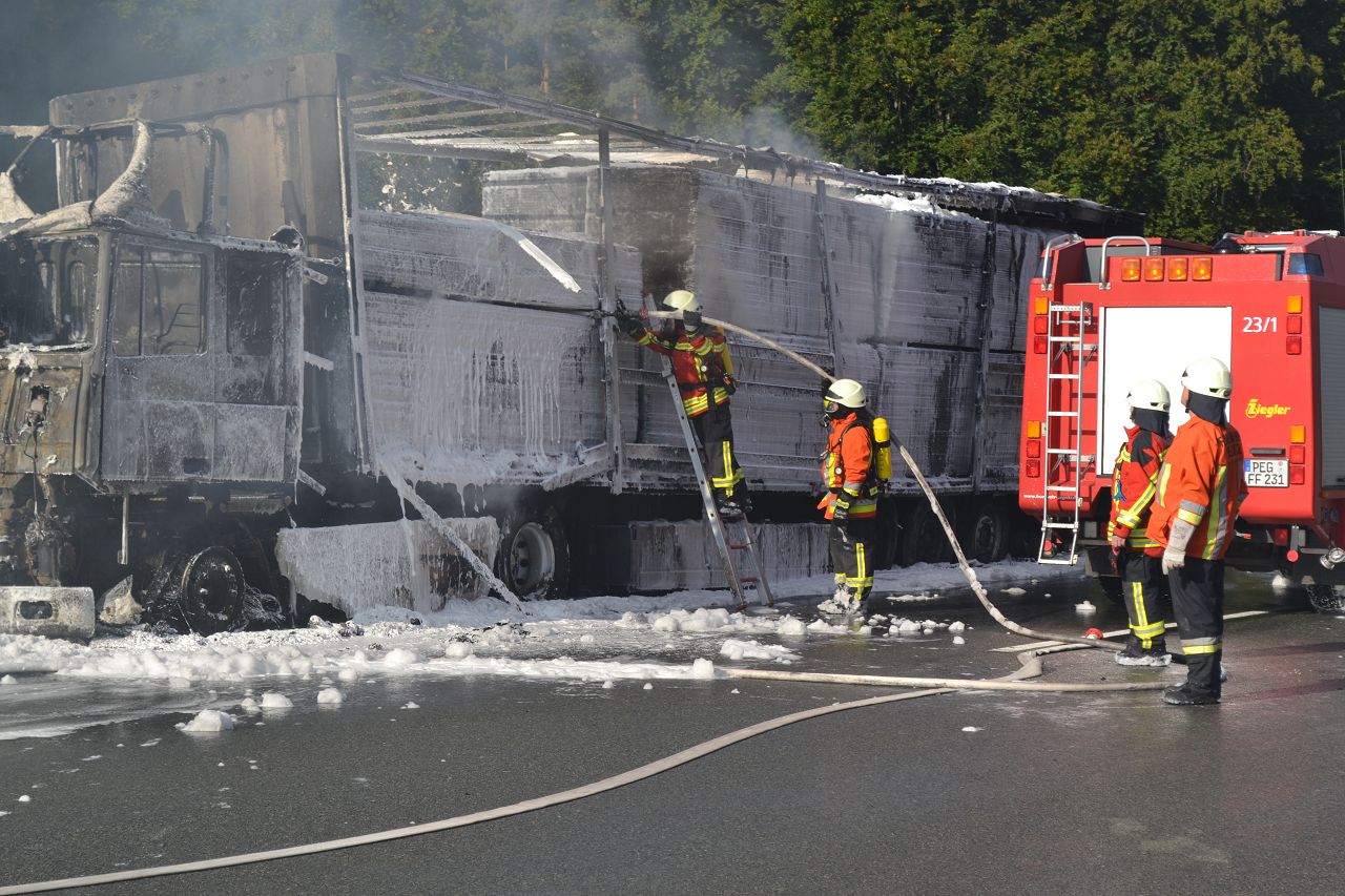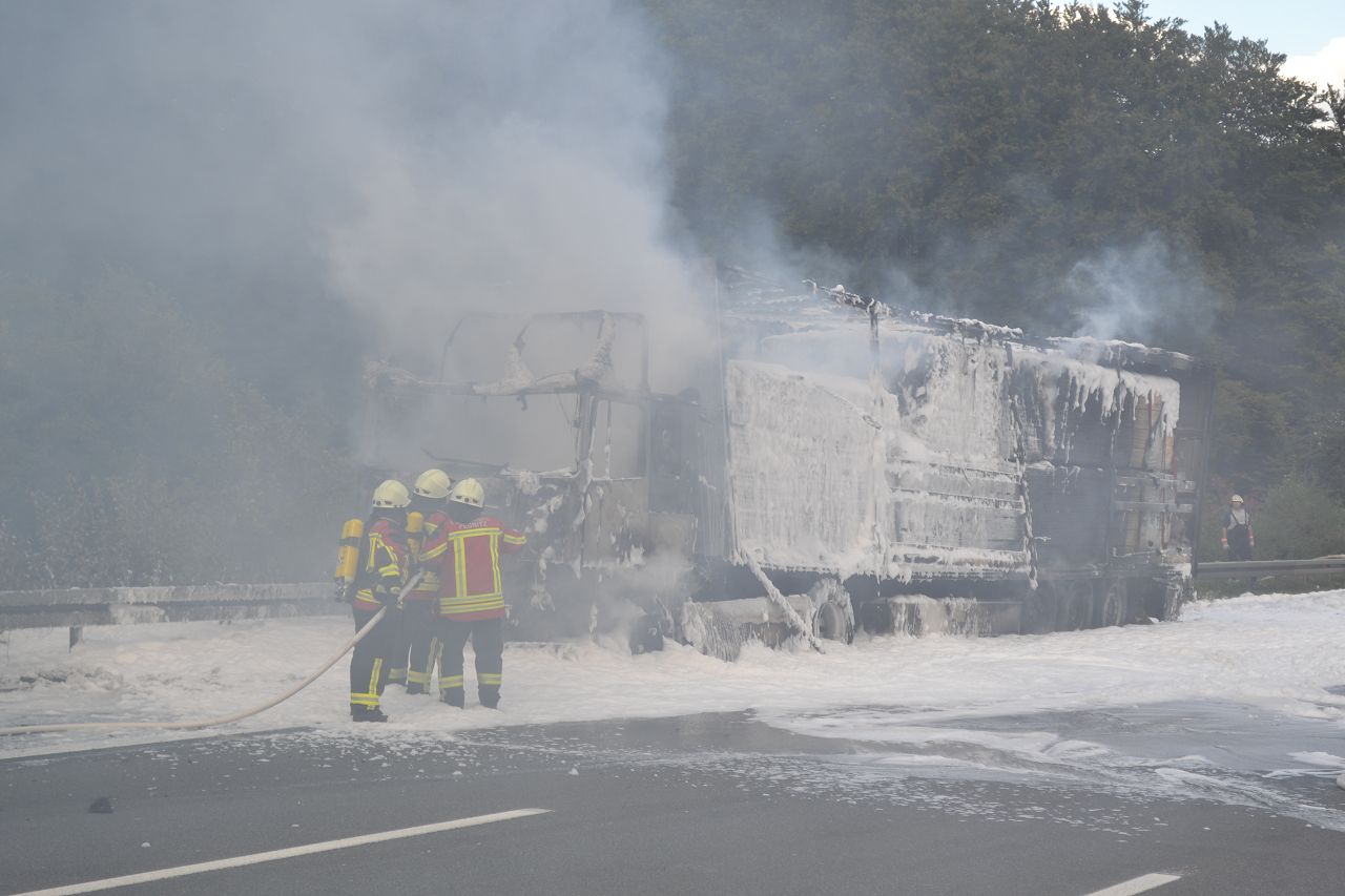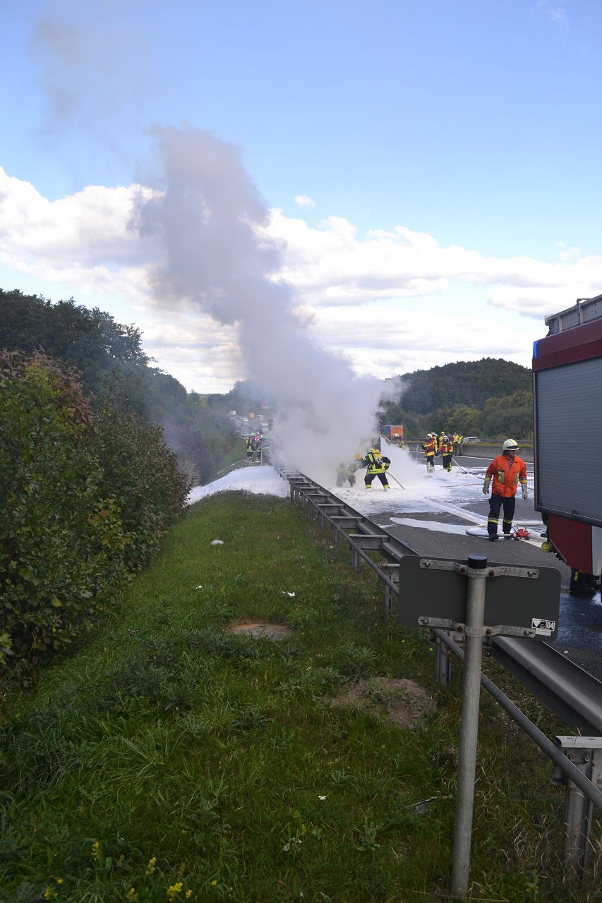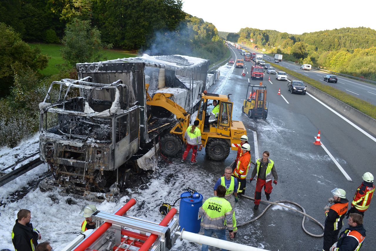 Kurz nach 14.30 Uhr war ein 44-jähriger Pole mit seinem Sattelzug auf der Autobahn in Richtung Nürnberg unterwegs. Kurz vor der Anschlussstelle Hormersdorf qualmte es plötzlich im Führerhaus der Zugmaschine und der Fahrer konnte seinen Lastwagen gerade noch rechtzeitig auf dem Standstreifen zum Stehen bringen. Rasch griffen Flammen von der Sattelzugmaschine auf das gesamte Fahrzeug über. Sofort eilten mehrerer Streifenbesatzungen und Feuerwehrkräfte zu dem Brandort. Trotz des schnellen Einsatzes der Feuerwehren brannte der komplette Sattelzug einschließlich der Ladung, die aus 24 Tonnen Holzbrettern bestand, vollständig aus. Der Lastwagenfahrer kam mit dem Schrecken davon. Nach bisherigem Ermittlungsstand dürfte ein technischer Defekt im Motorraum ursächlich für den Brand gewesen sein. Der Gesamtschaden wird auf zirka 75.000 Euro beziffert. Aufgrund der Lösch- und Bergungsarbeiten musste die Autobahn längere Zeit total gesperrt werden und es bildete sich ein Rückstau von zeitweise bis zu zehn Kilometern. Die Bergungs- und Reinigungsmaßnahmen dauerten bis in die Nacht. Vor Ort waren die Feuerwehren aus Pegnitz, Schnaittach, Ottenhof, Hormersdorf und Plech. Das Technische Hilfswerk Pegnitz und die Autobahnmeisterei Trockau waren ebenfalls im Einsatz.
