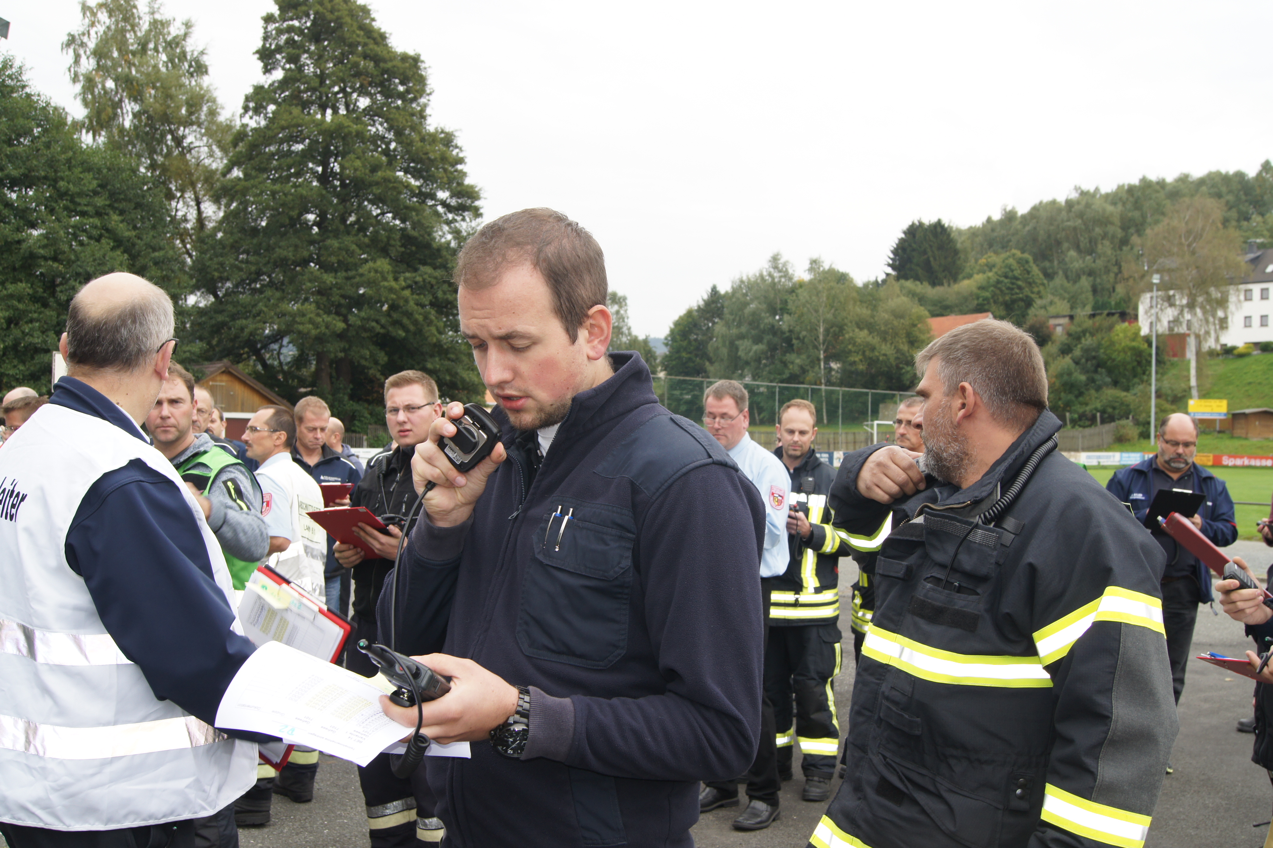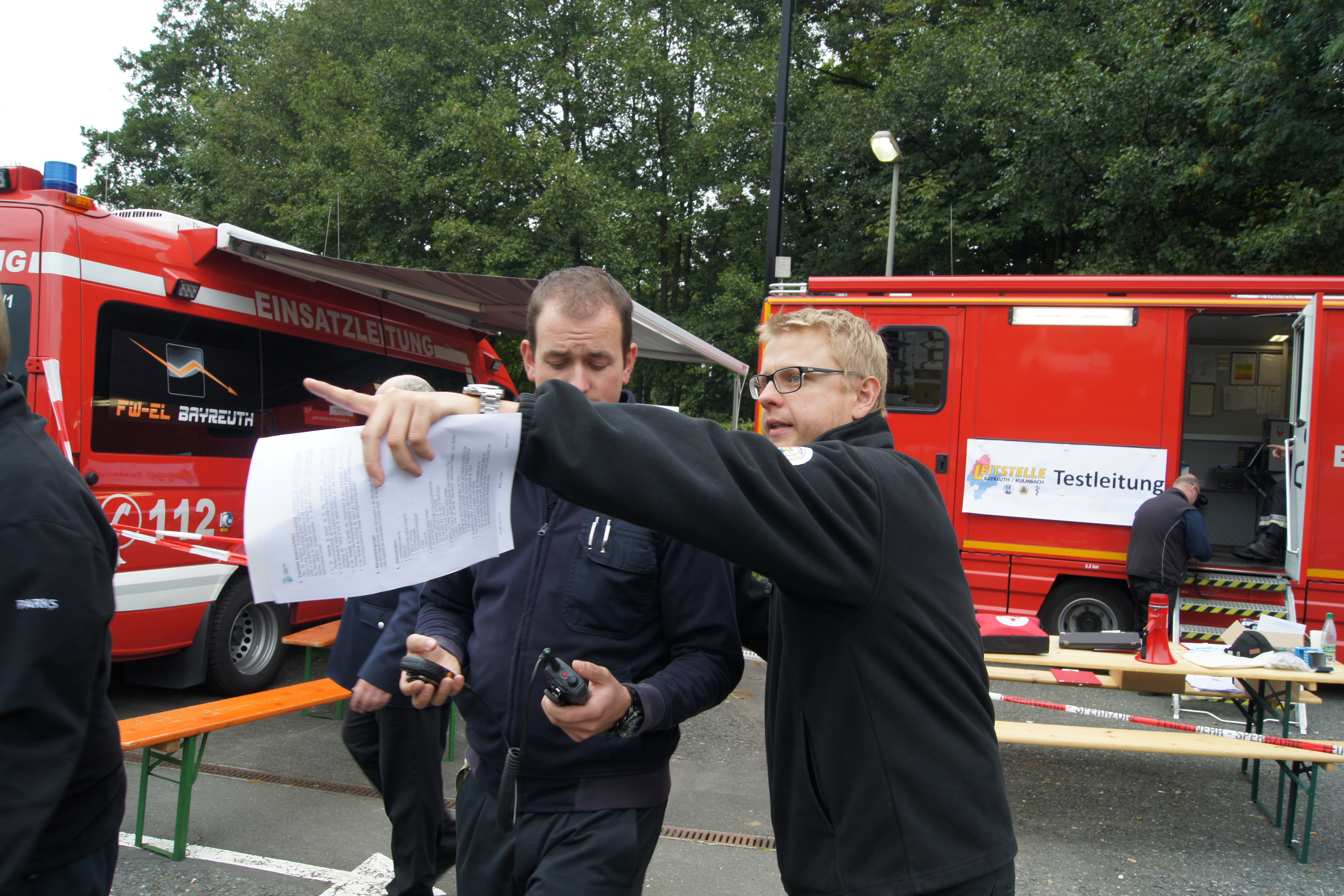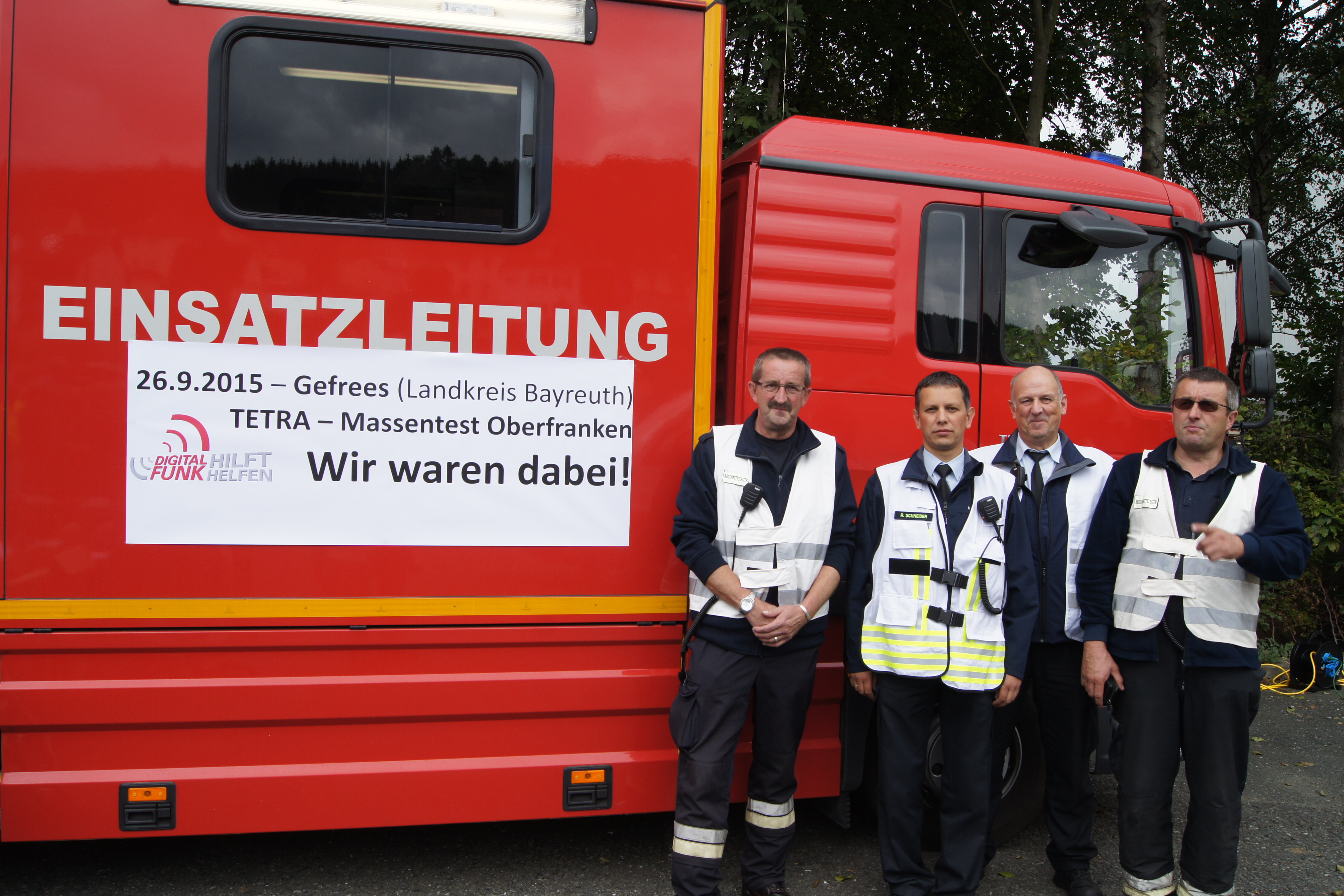 Rund 250 Einsatzkräfte verschiedener Hilfsorganisationen und Sicherheitsbehörden aus ganz Oberfranken sind am Samstag, den 26.09.2015 am Festplatz in Gefrees zusammen gekommen, um das neue Digitalfunknetz intensiv zu testen. Der so genannte Massentest war der einzige für ganz Oberfranken. Dabei wurden die Belastbarkeit und die Leistungsfähigkeit des Netzes getestet. Hierfür produzierten 57 Einsatzfahrzeuge auf der nahegelegenen BAB 9 zwischen den Anschlussstellen Bindlacher Berg und Hof-West ein außergewöhnliches Funkverkehrsaufkommen. Begleitet wurde der Test von Mitarbeitern des Bayerischen Innenministeriums, die unter anderem mit einem speziellen Messfahrzeug die Fahrten zwischen den Anschlussstellen begleiteten.