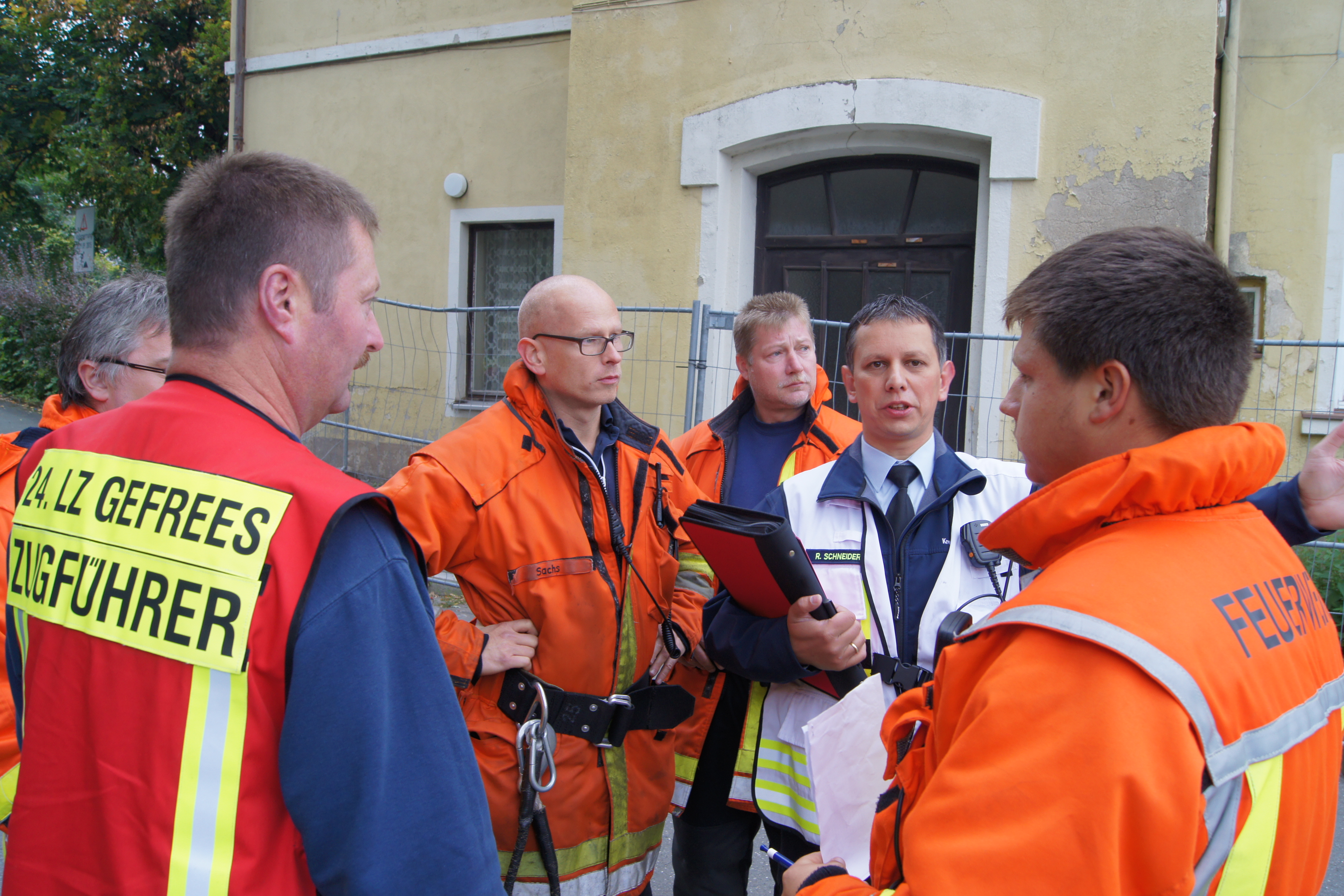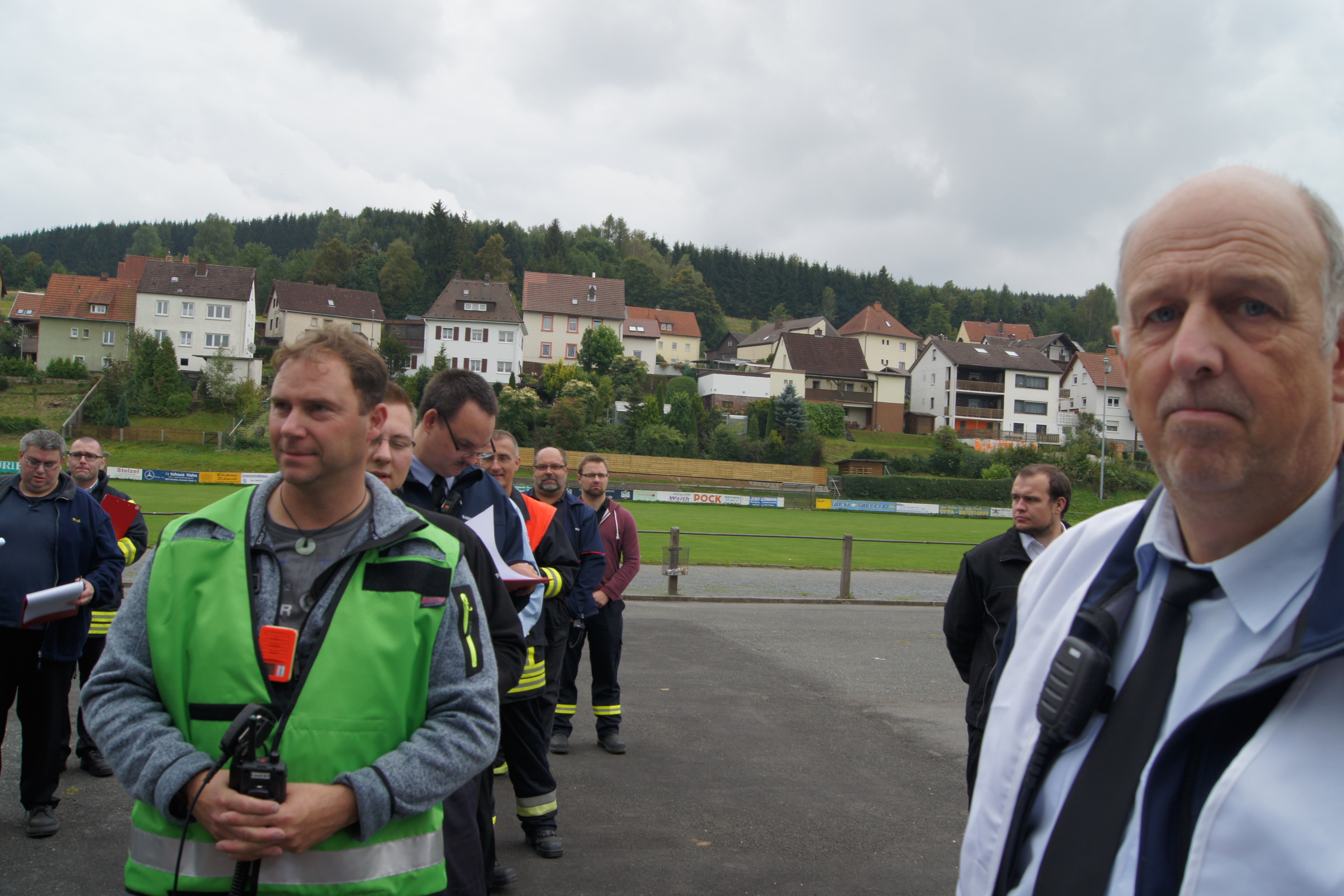 Bürgermeister Harald Schlegel, Landrat Hermann Hübner, Feuerwehrführungskräfte und Vertreter verschiedenster Behörden machten sich vor Ort ein Bild von dem umfangreichen Übungskomplex.