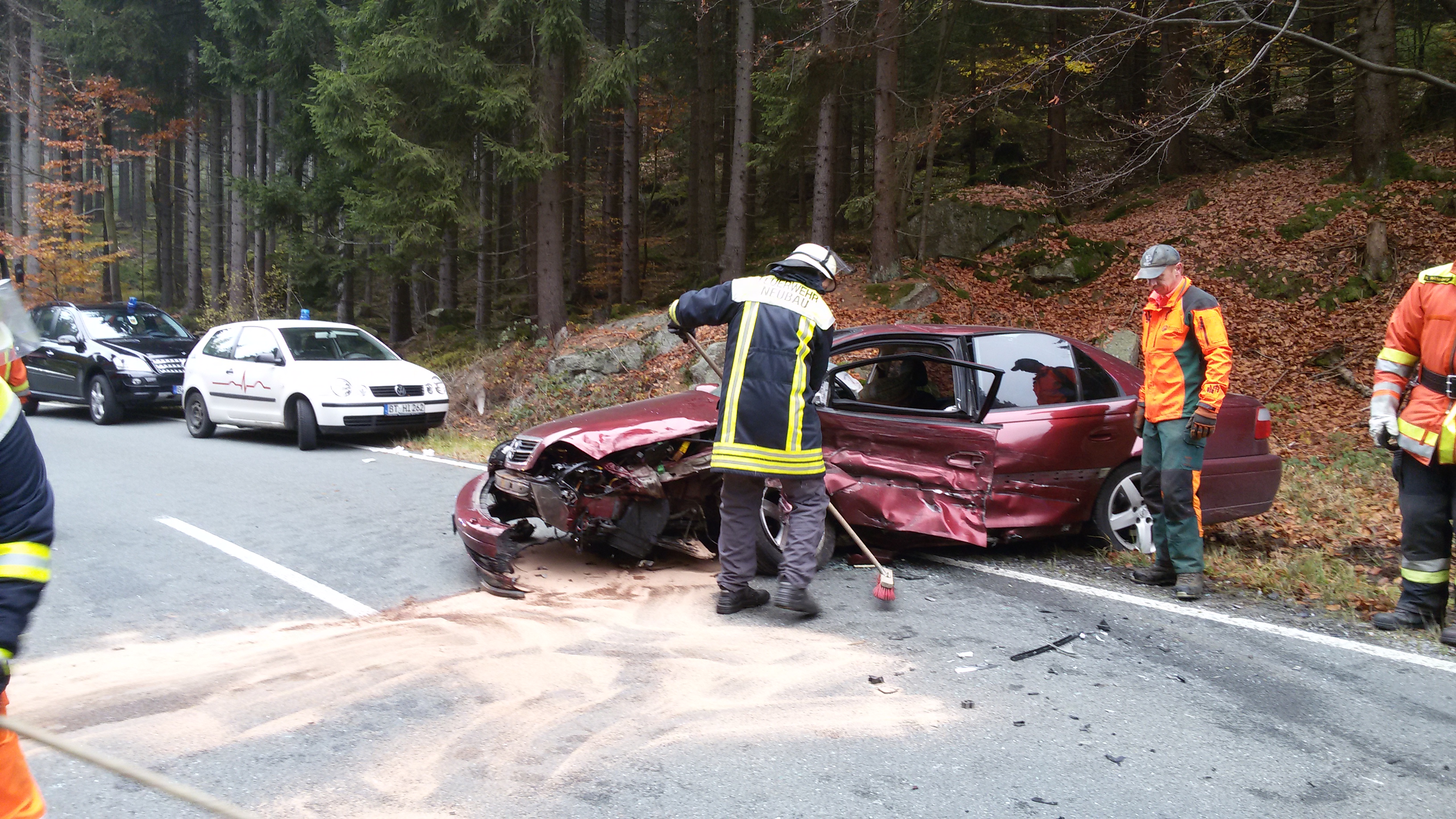 Zu einem schweren Verkehrsunfall wurden die Freiwilligen Feuerwehren Fichtelberg, Neubau und Tröstau am späten Vormittag des 29.10.2015 alarmiert. Auf der Staatsstraße 2181 zwischen Fichtelberg und der Bundesstraße B303 waren zwei PKW´s frontal zusammen gestoßen. Eine zunächst im Fahrzeug eingeklemmte Person konnte durch Ersthelfer über die Beifahrertür befreit und von den Helfern vor Ort Fichtelberg ( HvO ) bis zum Eintreffen des Rettungsdienstes versorgt werden. Eine zweite, leichter verletzte Person wurde ebenfalls dem Rettungsdienst übergeben.