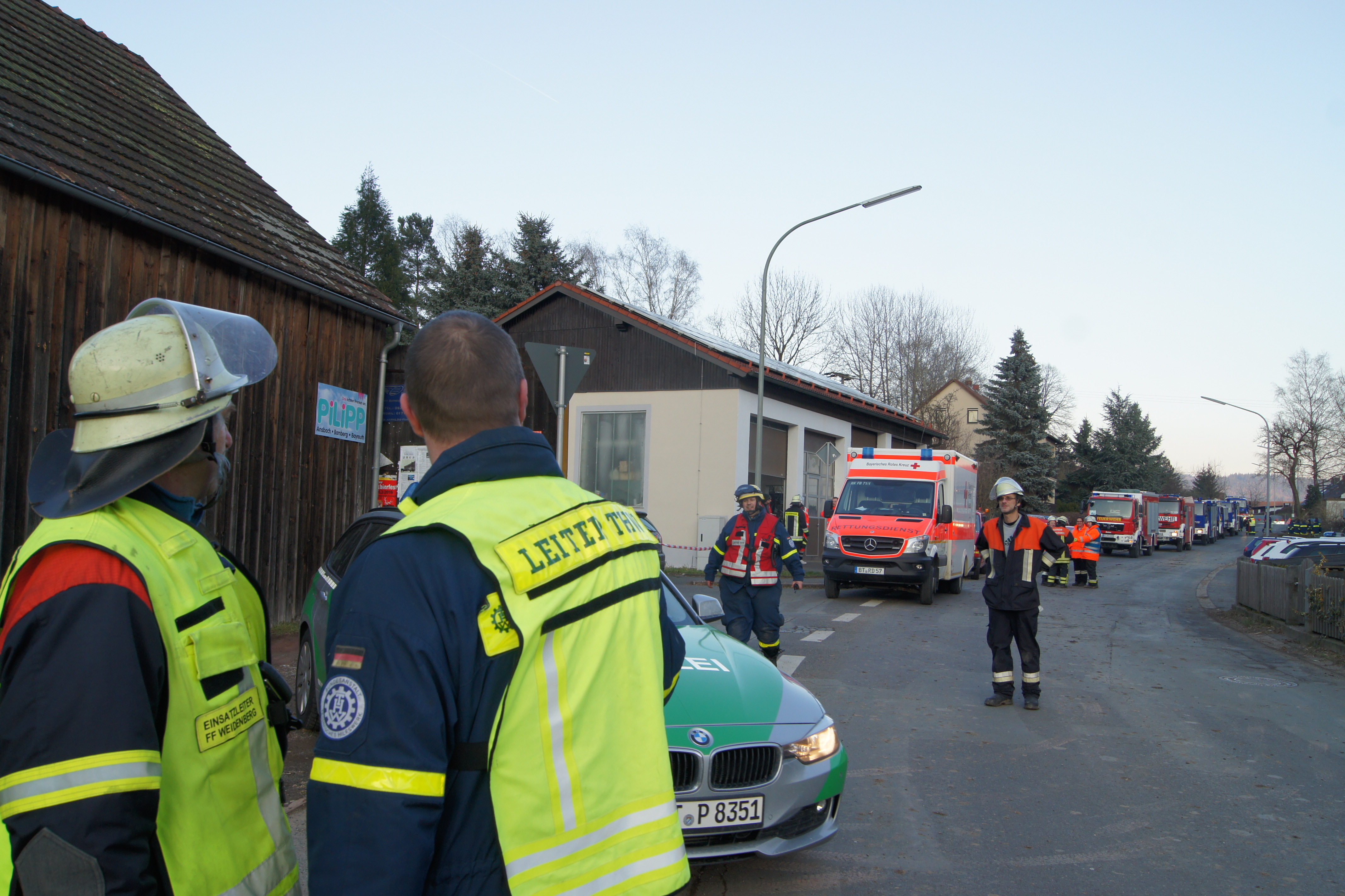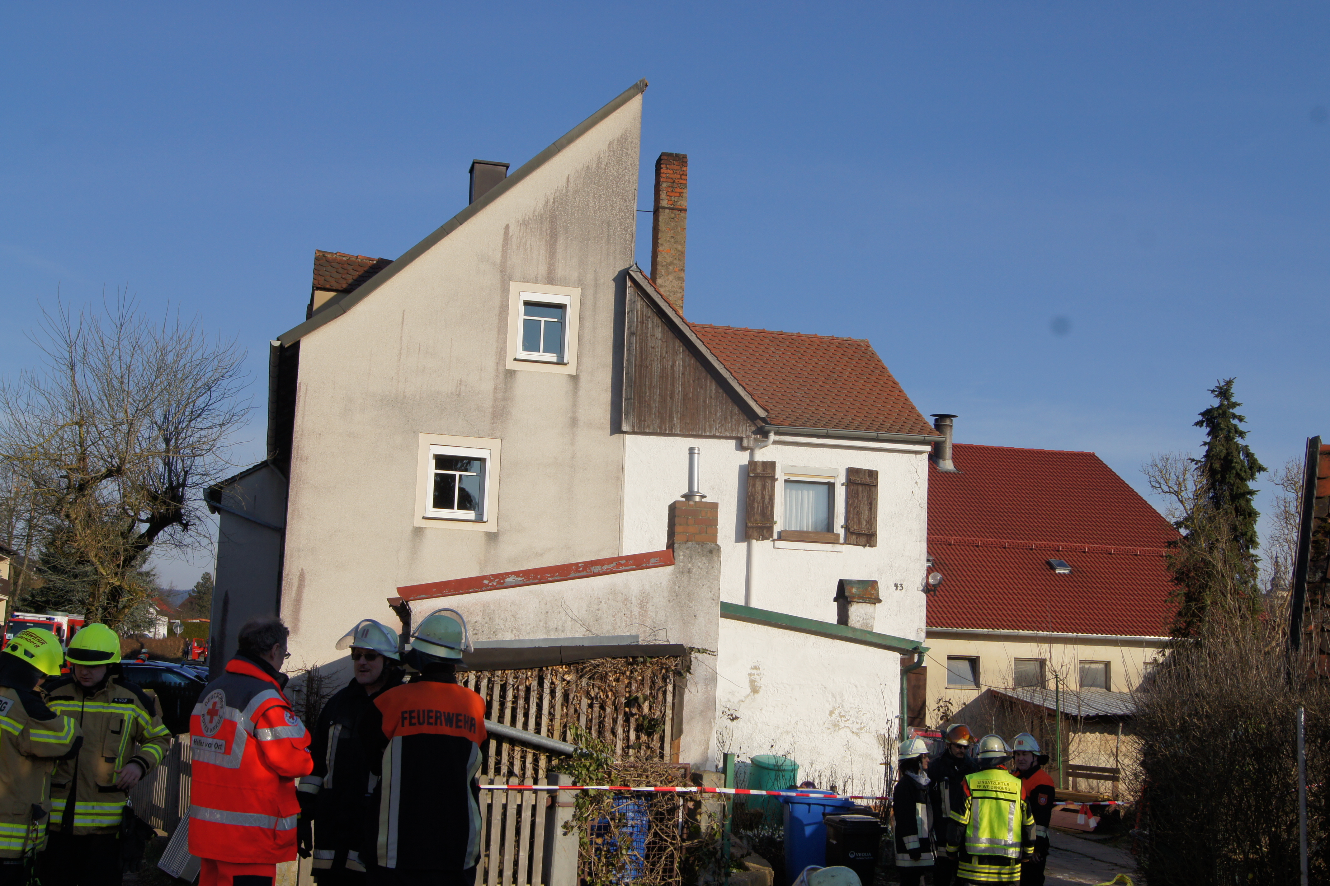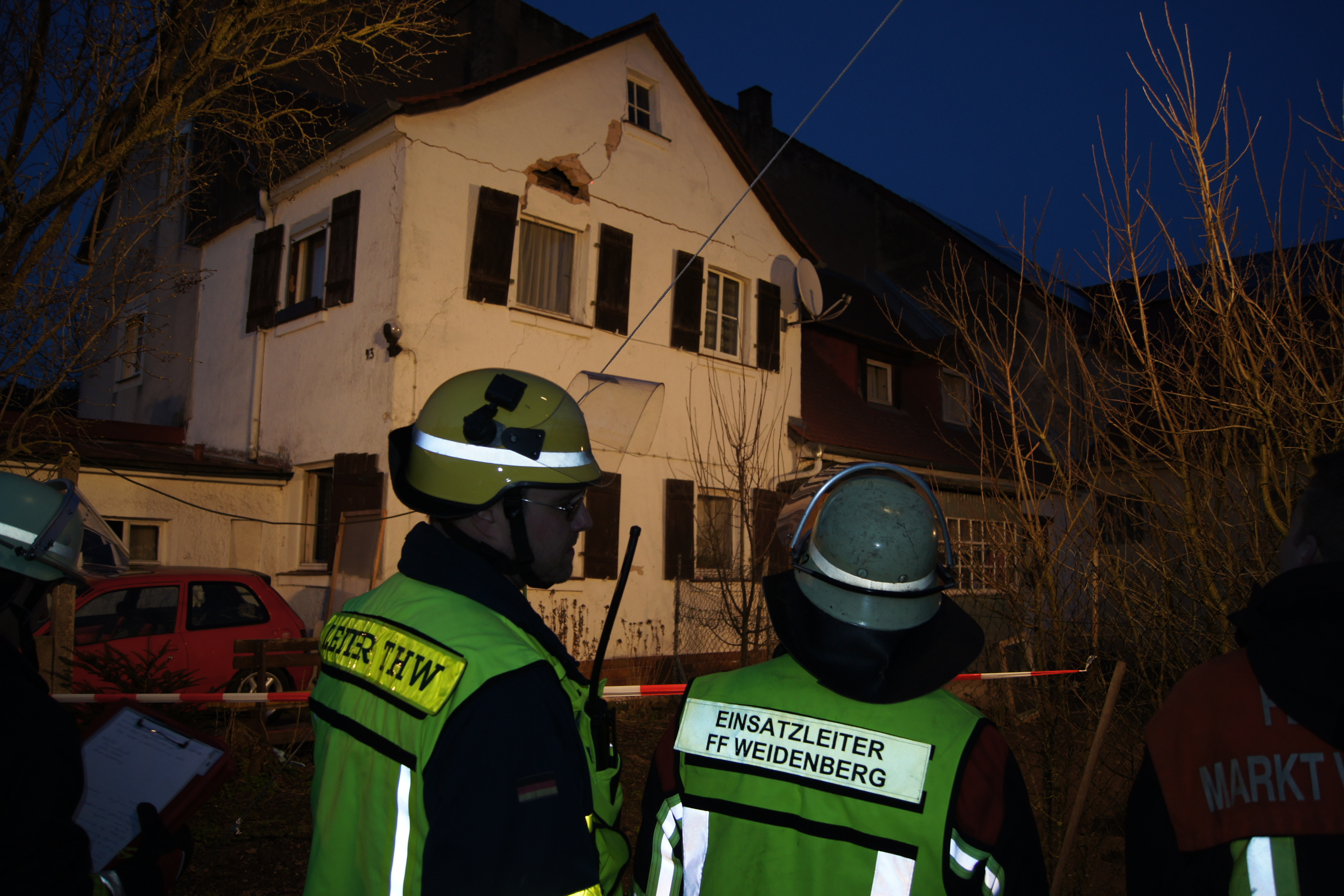 Ein äußerst aufwändiger Einsatz beschäftigte die Helfer von Feuerwehr, Technischem Hilfswerk und Bayerischen Roten Kreuz am Samstag, 27.02.2016. Kurz vor 15:00 Uhr wurden die Einheiten zu einem Wohnhaus in der Weidenberger Birkenstraße mit dem Alarmstichwort „Einsturz Haus / Gebäudeeinsturz“ alarmiert. Dem vorausgegangenen Notruf der Bewohner zufolge war es im Vorfeld zu einer folgenschweren Verpuffung bzw. Exploxion in dem Gebäude gekommen, bei dem eine Person leicht verletzt wurde.