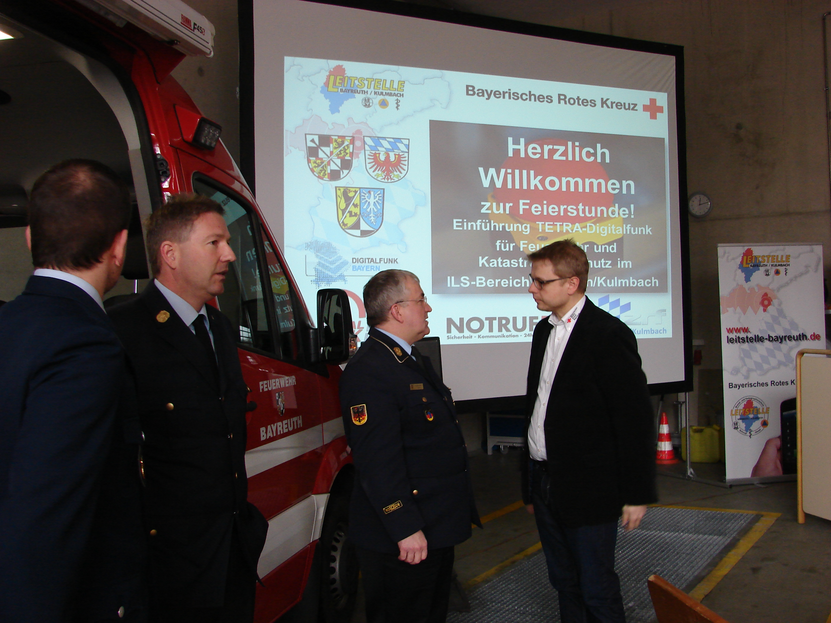 Seit dem frühen Mittwochmorgen des 02.03.2016 gehört der Leitstellenbereich Bayreuth/Kulmbach zu den wenigen in Bayern (neben Weilheim und Erdingen), in denen sowohl Polizei, Rettungsdienst und die Feuerwehren vollumfänglich den Digitalfunk nutzen. Mit der Vollinbetriebnahme des TETRA-BOS-Digitalfunks hat eines der aufwändigsten Projekte im Bereich der Feuerwehr und Rettungsdienst seinen vorläufigen Schlusspunkt erreicht. Für die erfolgreiche Einführung des Digitalfunkes mussten in der Vergangenheit 5000 Mitglieder aller Einsatzkräfte und Hilfsorganisationen geschult und alle Fahrzeuge dieser mit digitalen Geräten aufgerüstet werden. Im Bereich des Zweckverbandes Rettungsdienst und Feuerwehralarmierung (ZRF) Bayreuth-Kulmbach nutzen seit dem 02. März 2016, nach einem knapp sechswöchigen Probebetrieb des Rettungsdienstes, nun auch alle Feuerwehren und Katastrophenschutzeinheiten, mit weiteren 150 funkfähigen Fahrzeugen, den Digitalfunk.
