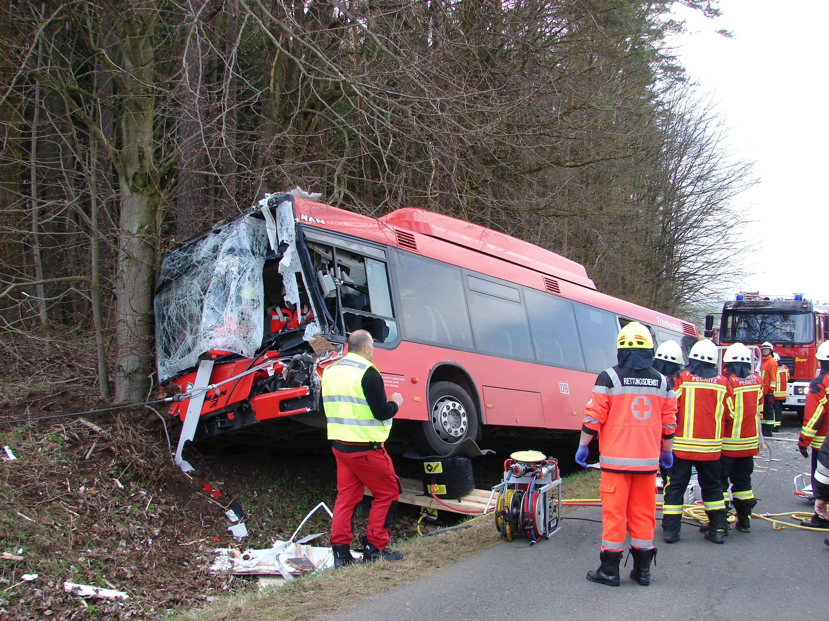 Somit galt das weitere Hauptaugenmerk der Rettung des eingeklemmten Busfahrers und der Sicherung der Fahrzeuge. Beim gasbetriebenen Bus wurde die Gasversorgung unterbrochen, um weitere Gefährdungen auszuschließen. Mittels Seilwinden wurden die verunglückten, teils absturzgefährdeten Großfahrzeuge gesichert.