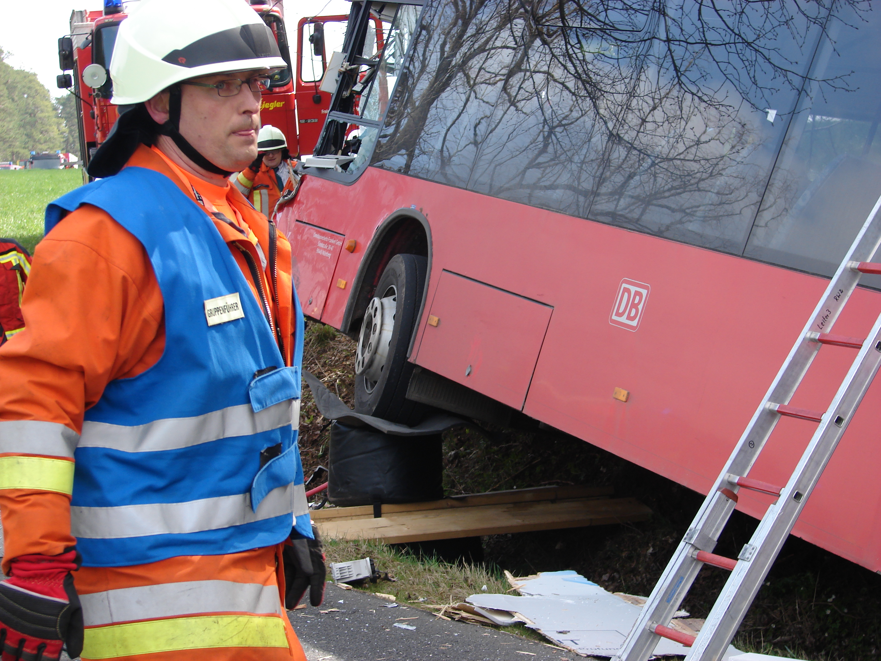 Die Alarmmeldung “ Verkehrsunfall: Reisebus gegen LKW, mehrere Personen eingeklemmt“ mit der weiteren Meldung, dass Schulkinder in dem verunglückten Bus sind, versetzt die Einsatzkräfte in höchste Anspannung. Einsatzleiter und Kommandant Roland Zahn spricht aus, was ehren- und hauptamtliche Helfer in dieser Situation besonders bewegt: „Bei Einsätzen mit möglicherweise vielen Verletzten, vor allem Kindern, erhöht sich die Anspannung um ein Vielfaches. Wir geben immer unser Bestes, der Druck bei derartigen Unglücken ist immens.“