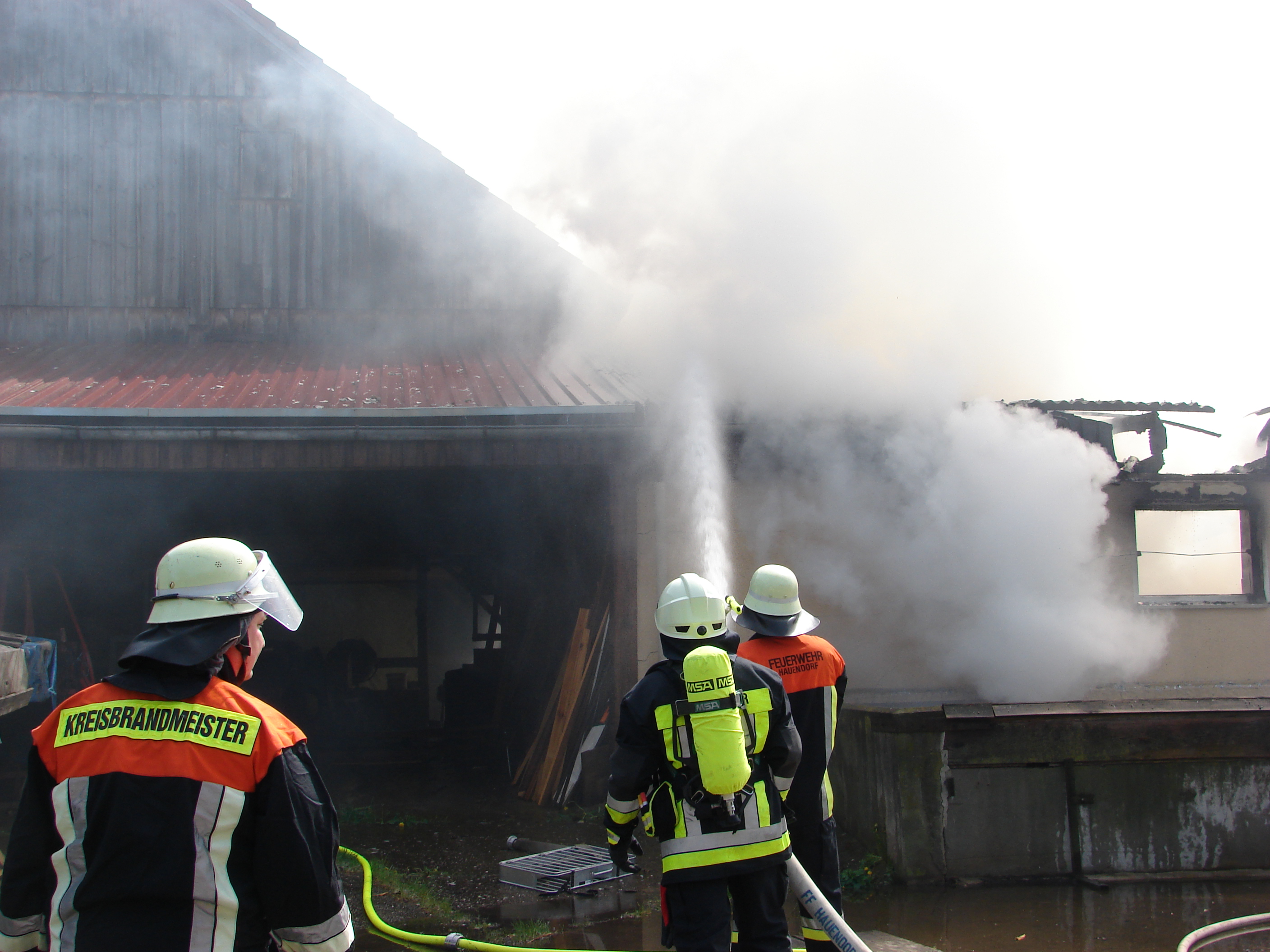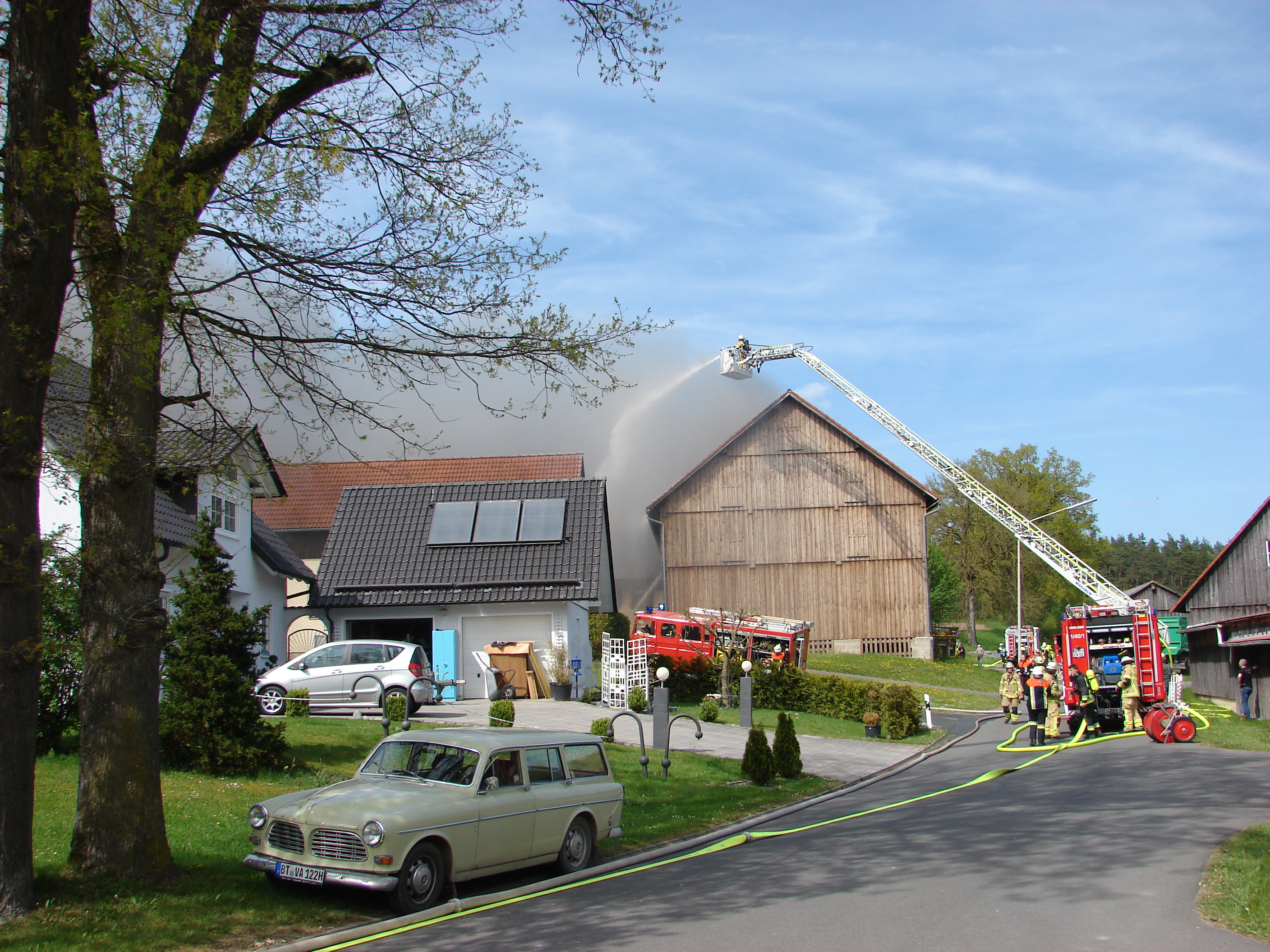 Bewohner eines ehemaligen landwirtschaftlichen Anwesen bemerkten den Brand gegen 14:45 Uhr und lösten den Alarm aus. Die ersten Einsatzkräfte aus Troschenreuth/Hauendorf fanden ein Stallgebäude, das zu einer Lagerhalle umfunktioniert wurde, in Vollbrand vor. Sie forderten zusätzliche Kräfte aus den umliegenden Wehren an. Zudem wurde die ständige Wache Bayreuth mit der Drehleiter zum Einsatzort dirigiert. Aus Seybothenreueth und Weidenberg wurden Tanklöschfahrzeuge nach Troschenreuth beordert.