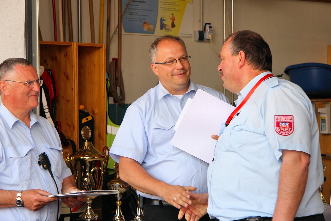 Im Rahmen des Jugendleistungsmarsches der Inspektion III in Körzendorf ehrte Bezirksjugendfeuerwehrwart Stefan Steger Kreisbrandmeister Werner Otto mit der Ehrennadel der Jugendfeuerwehren des Bezirkes Oberfranken.