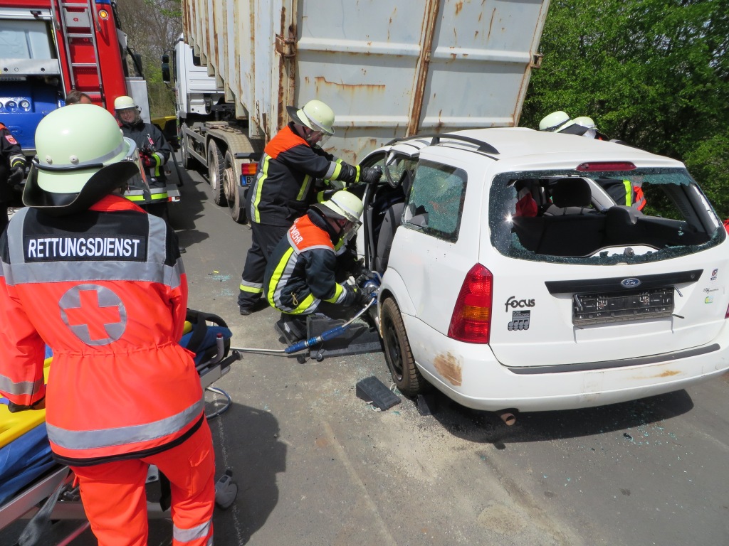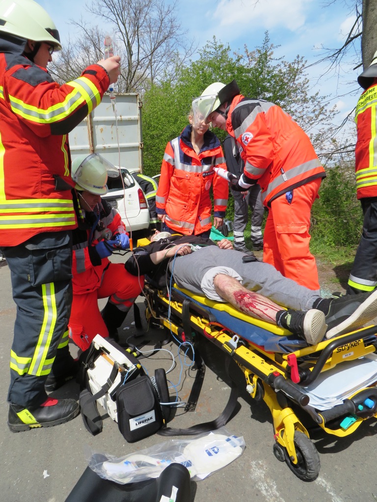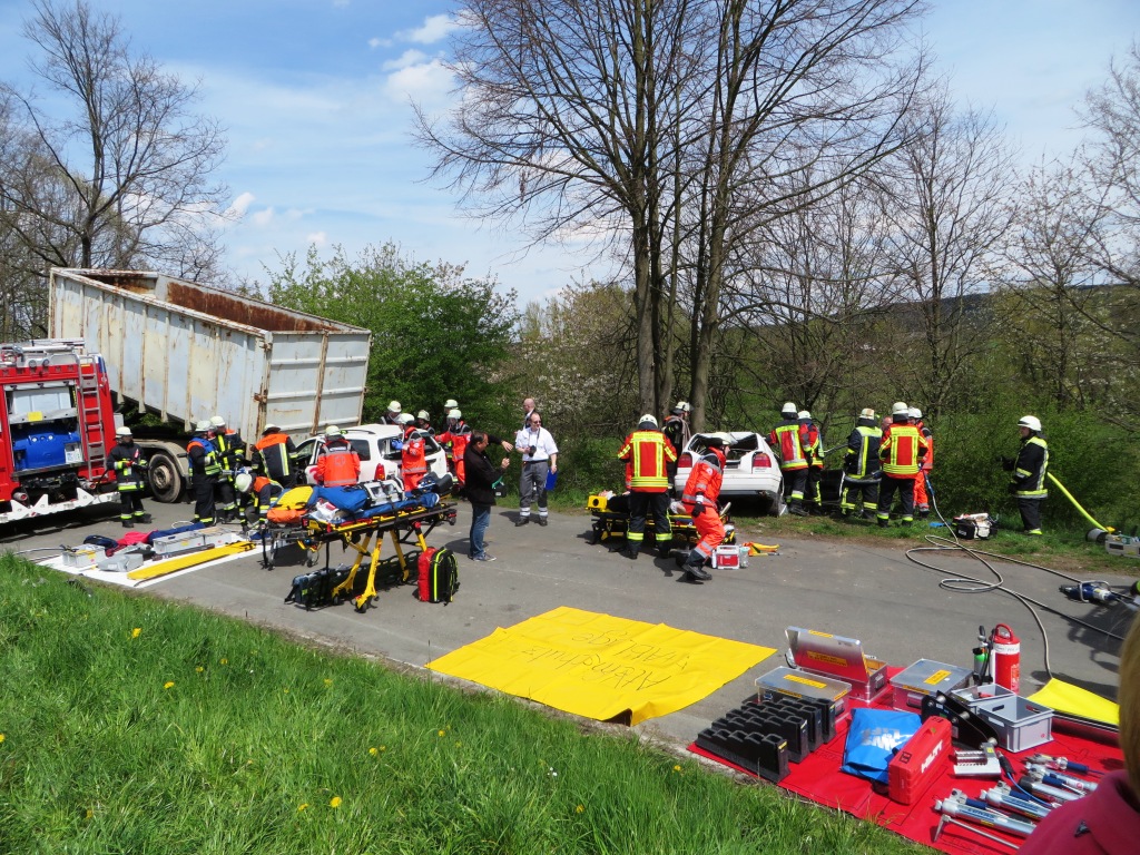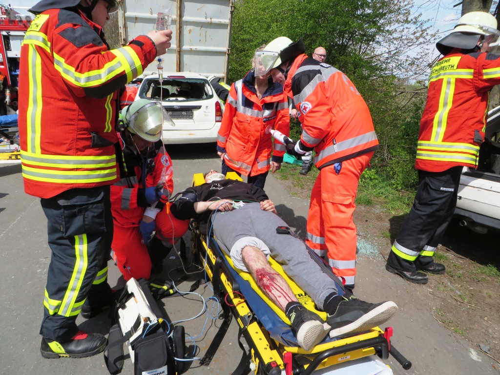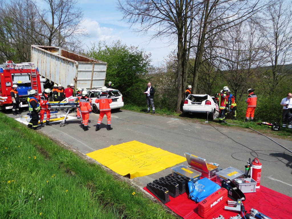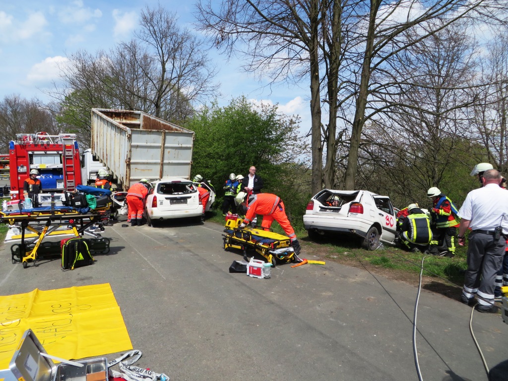 Nachfolgend einige Impressionen vom Szenario 1 „Zwei verunfallte PKW und LKW mit eingeklemmten Personen und insgesamt fünf Verletzten“: