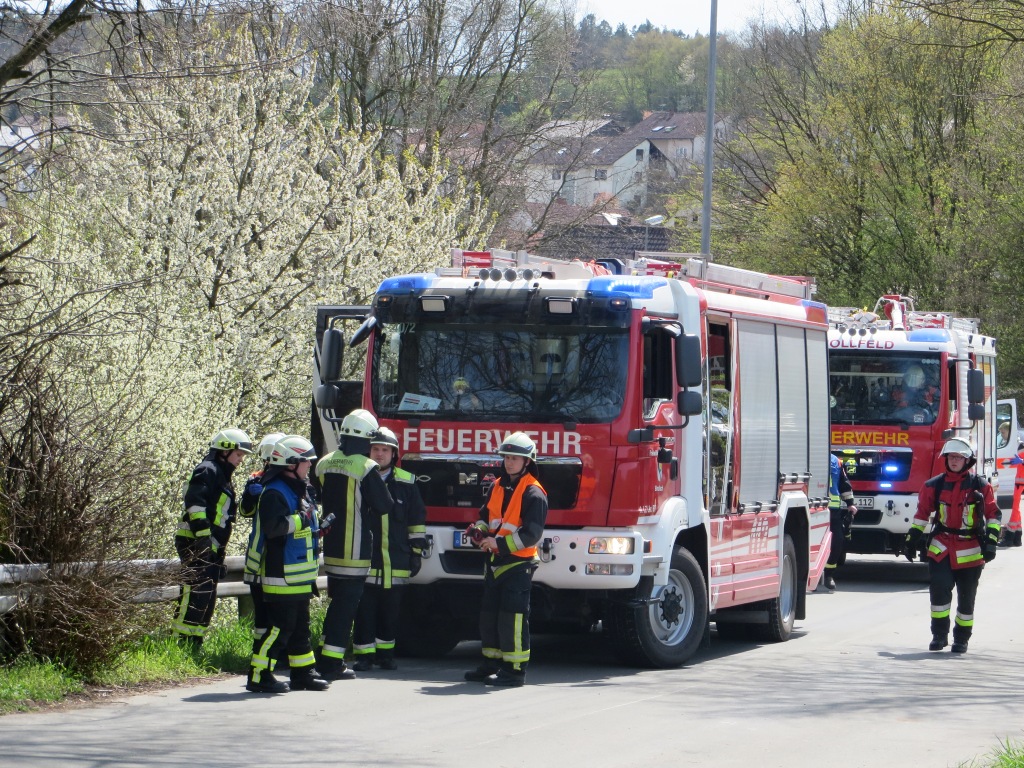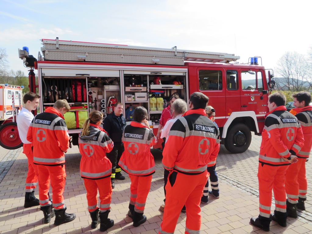 im Fokus der rund 45 Teilnehmer von Feuerwehr ( Bindlach, Creußen, Gesees, Hollfeld, Mistelbach, Neubau, Troschenreuth ) und Bayerischen Roten Kreuz stand, bildeten am Nachmittag zwei praktische Übungen die Kernpunkte.