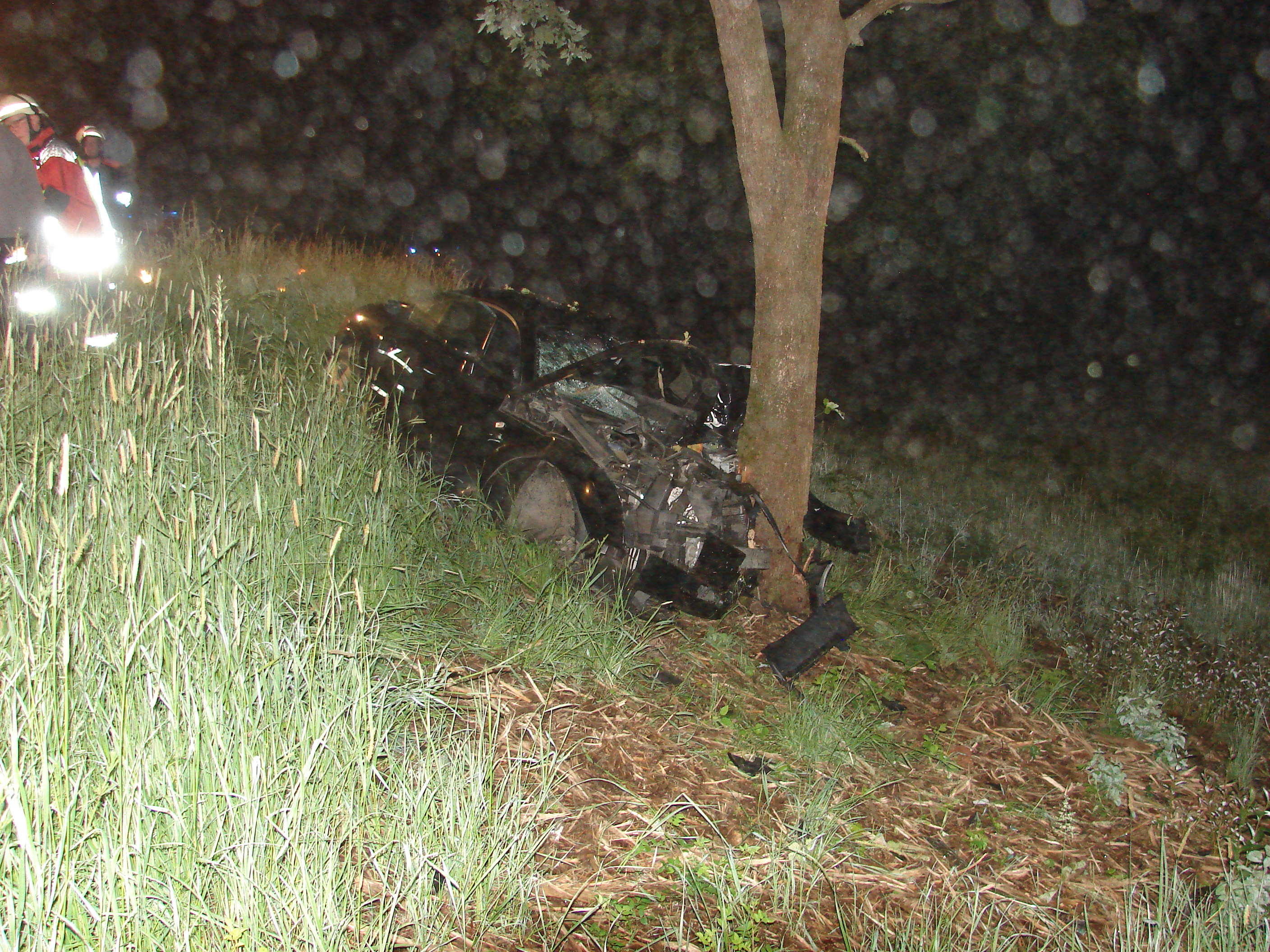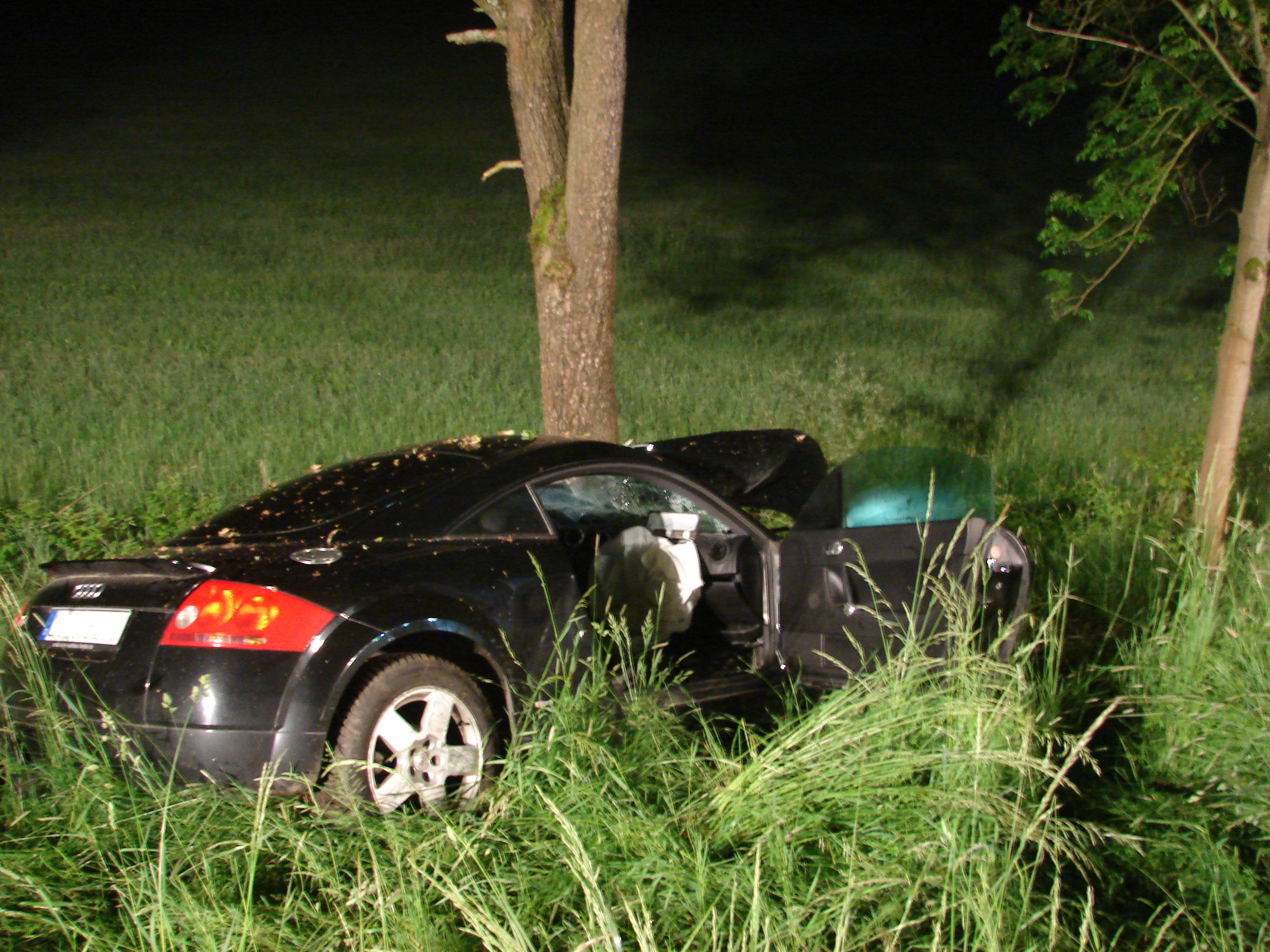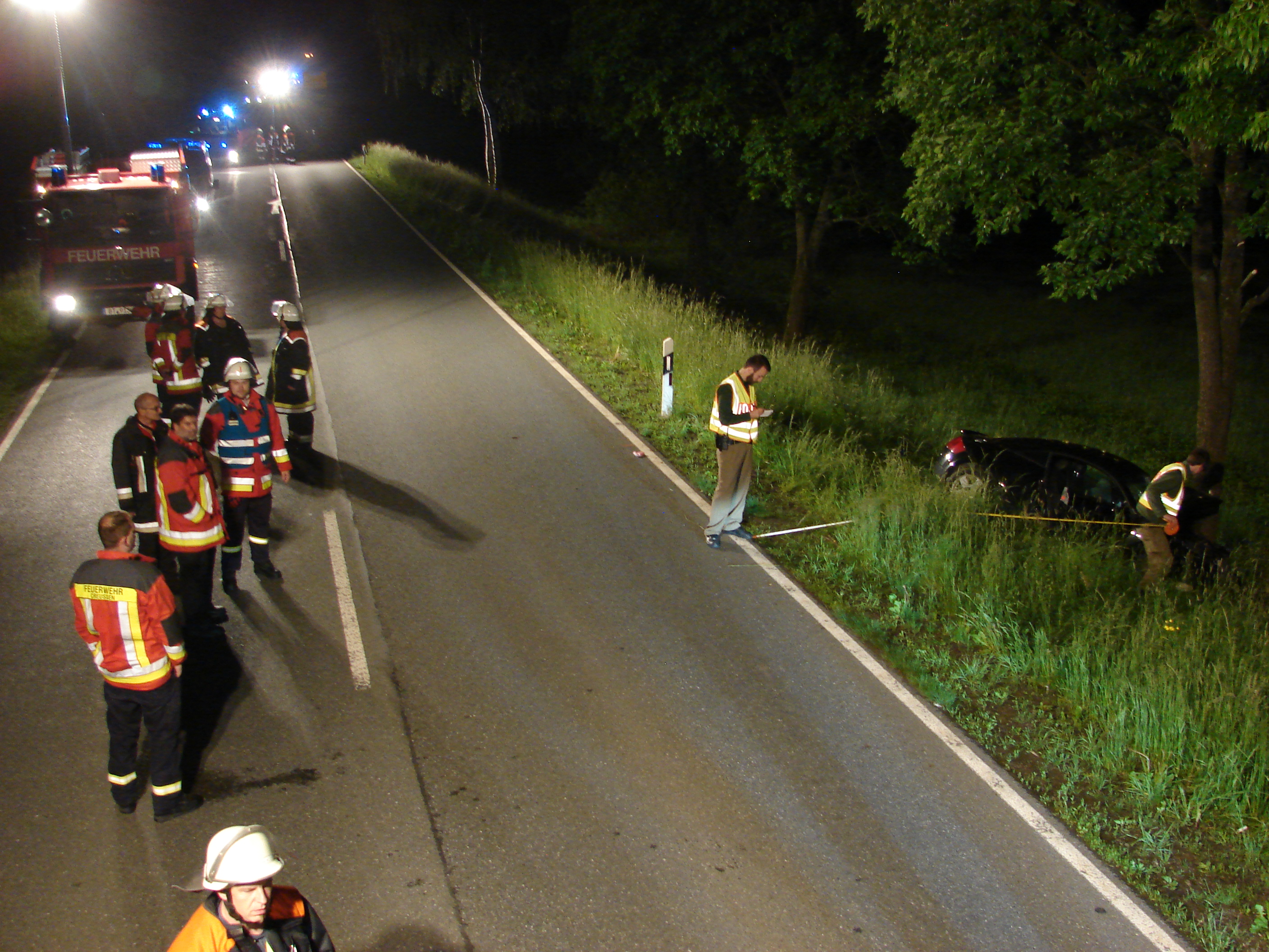 Ein Audi-Fahrer geriet aus bisher ungeklärten Gründen links von der Fahrbahn ab. Nach gut 100 Meter prallte er mit seinem TT auf der Fahrerseite frontal gegen einen Baum. Seine Beifahrerin konnte noch selbst den Notruf absetzen. Obwohl es in der Alarmierung hieß, dass eine Person eingeklemmt sei, konnte Kreisbrandmeister Uwe Jacobs Entwarnung geben. Beide Fahrzeuginsassen befreiten sich trotz ihrer Verletzungen eigenständig aus dem Auto. Die Verletzten wurden vom Notarzt und dem Rettungsdienst erst versorgt und anschließend in das Krankenhaus mit schweren Verletzungen eingeliefert.