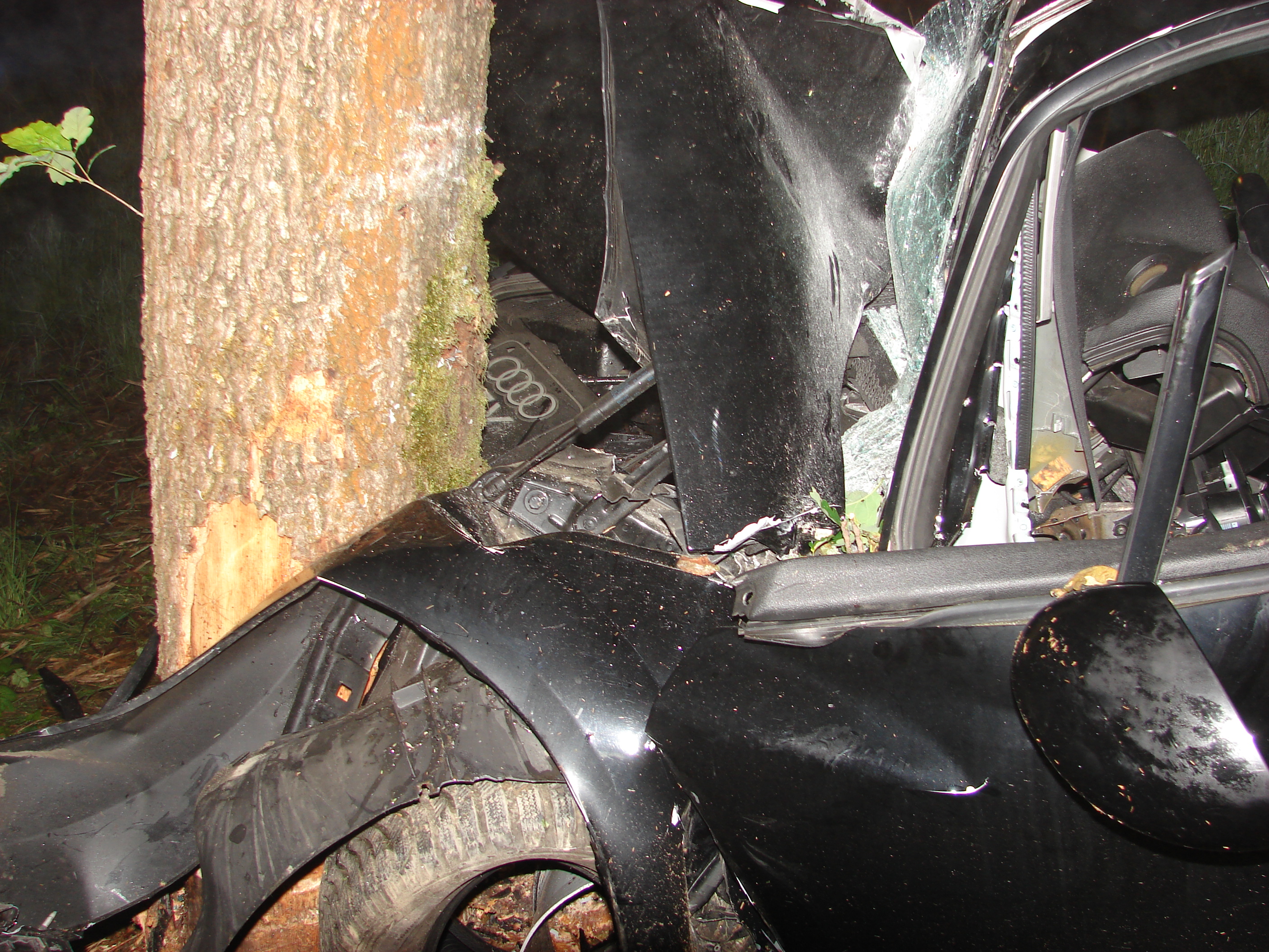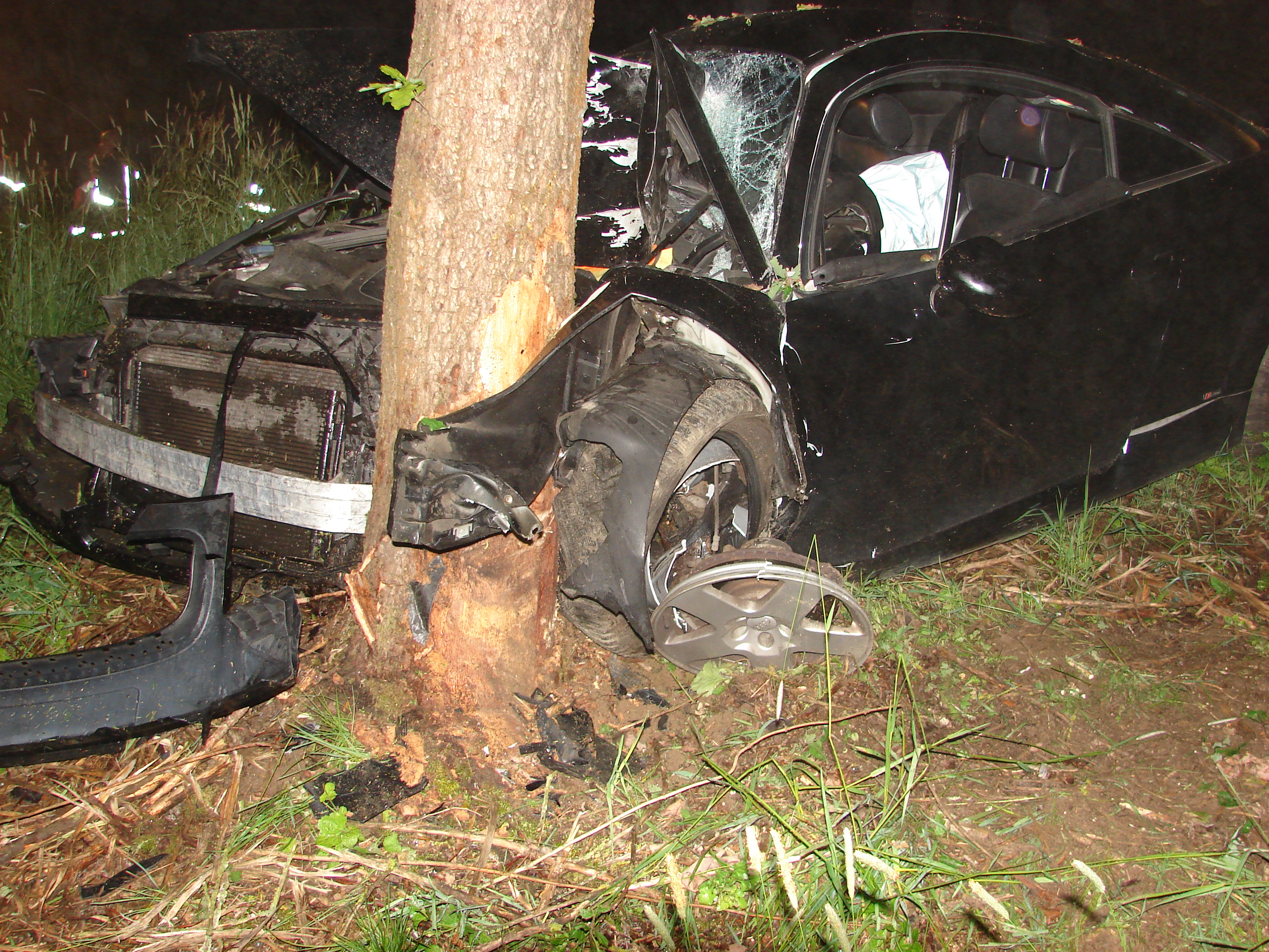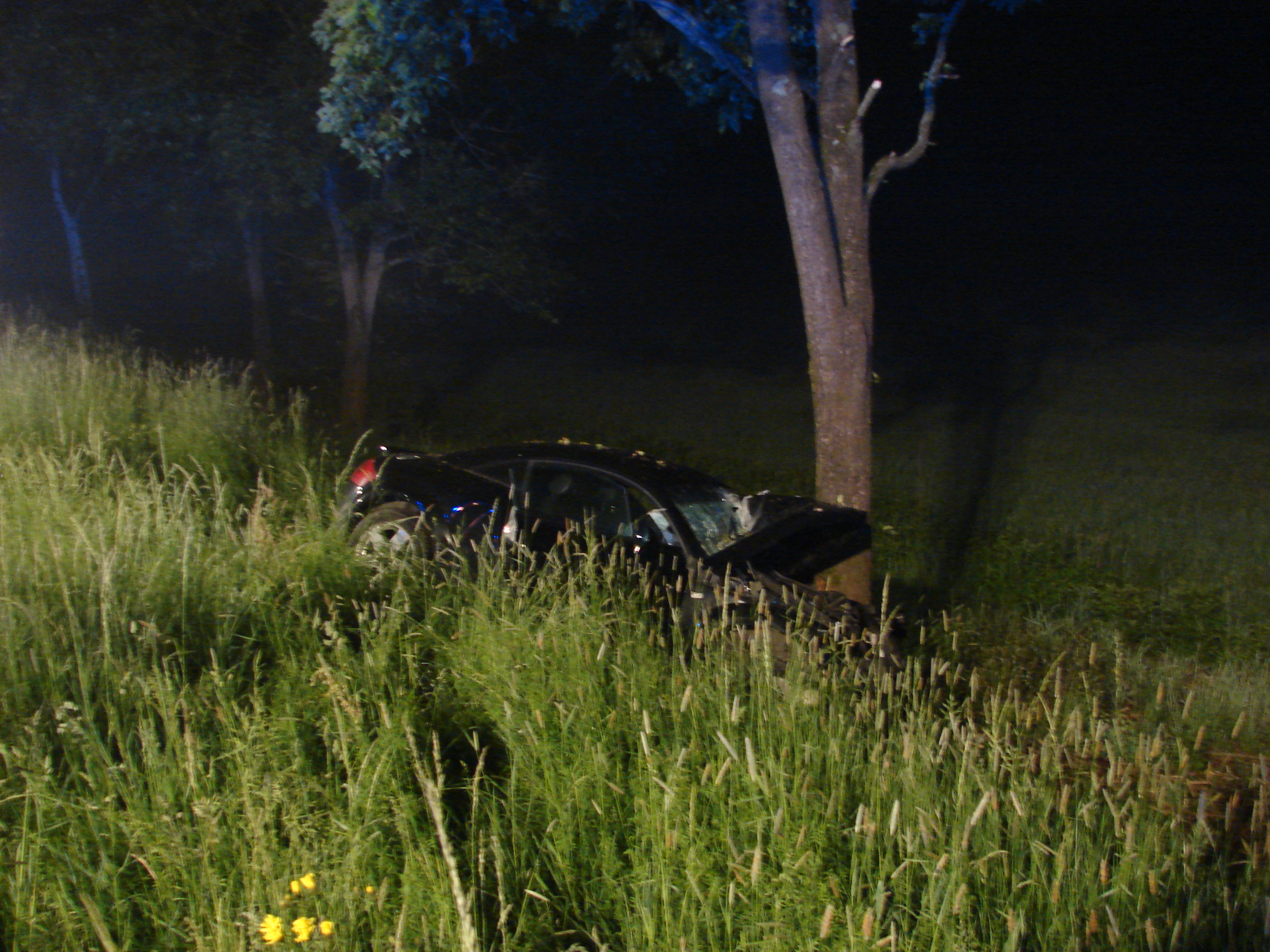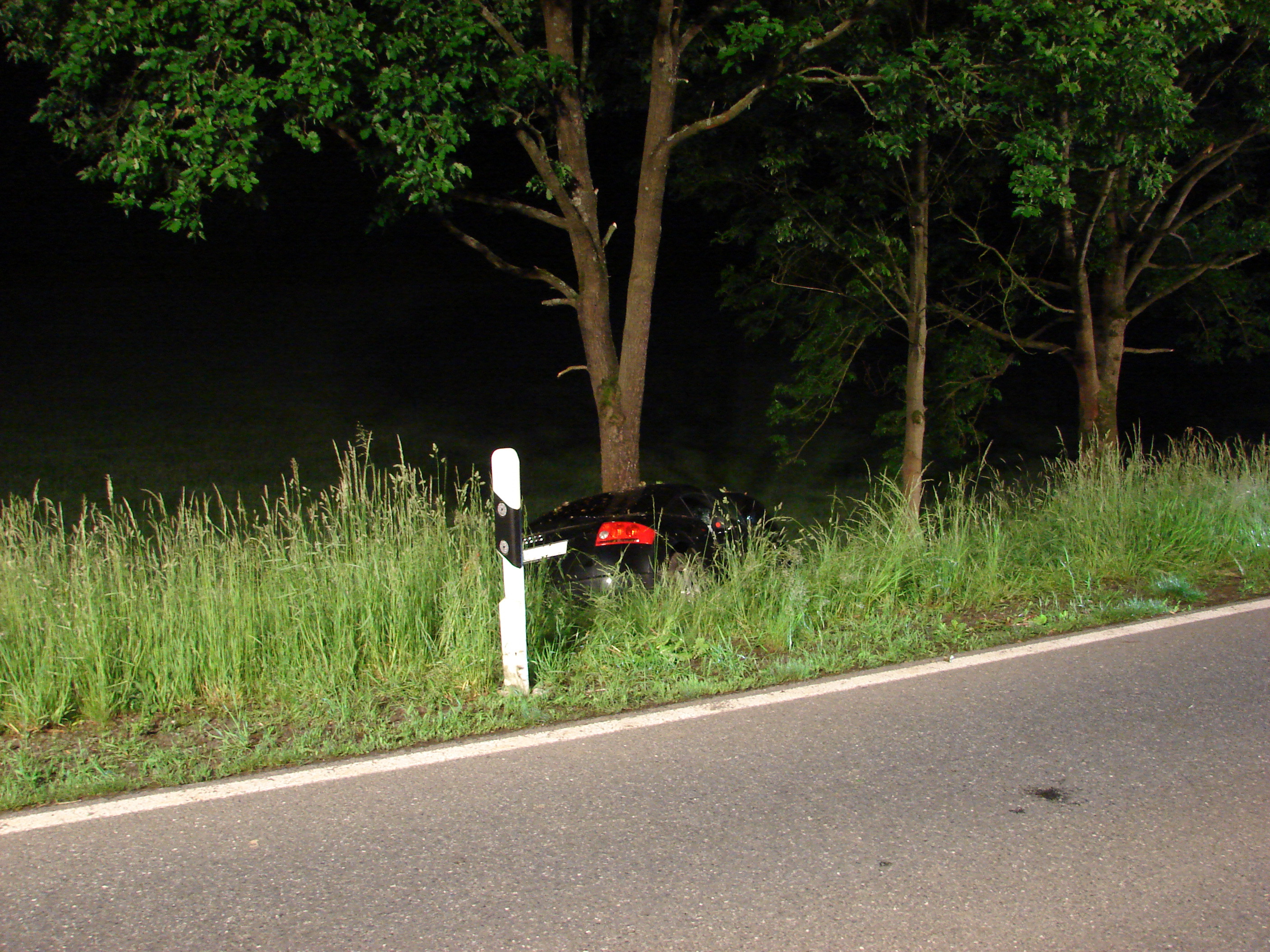 Ein Audi-Fahrer geriet aus bisher ungeklärten Gründen links von der Fahrbahn ab. Nach gut 100 Meter prallte er mit seinem TT auf der Fahrerseite frontal gegen einen Baum. Seine Beifahrerin konnte noch selbst den Notruf absetzen. Obwohl es in der Alarmierung hieß, dass eine Person eingeklemmt sei, konnte Kreisbrandmeister Uwe Jacobs Entwarnung geben. Beide Fahrzeuginsassen befreiten sich trotz ihrer Verletzungen eigenständig aus dem Auto. Die Verletzten wurden vom Notarzt und dem Rettungsdienst erst versorgt und anschließend in das Krankenhaus mit schweren Verletzungen eingeliefert.