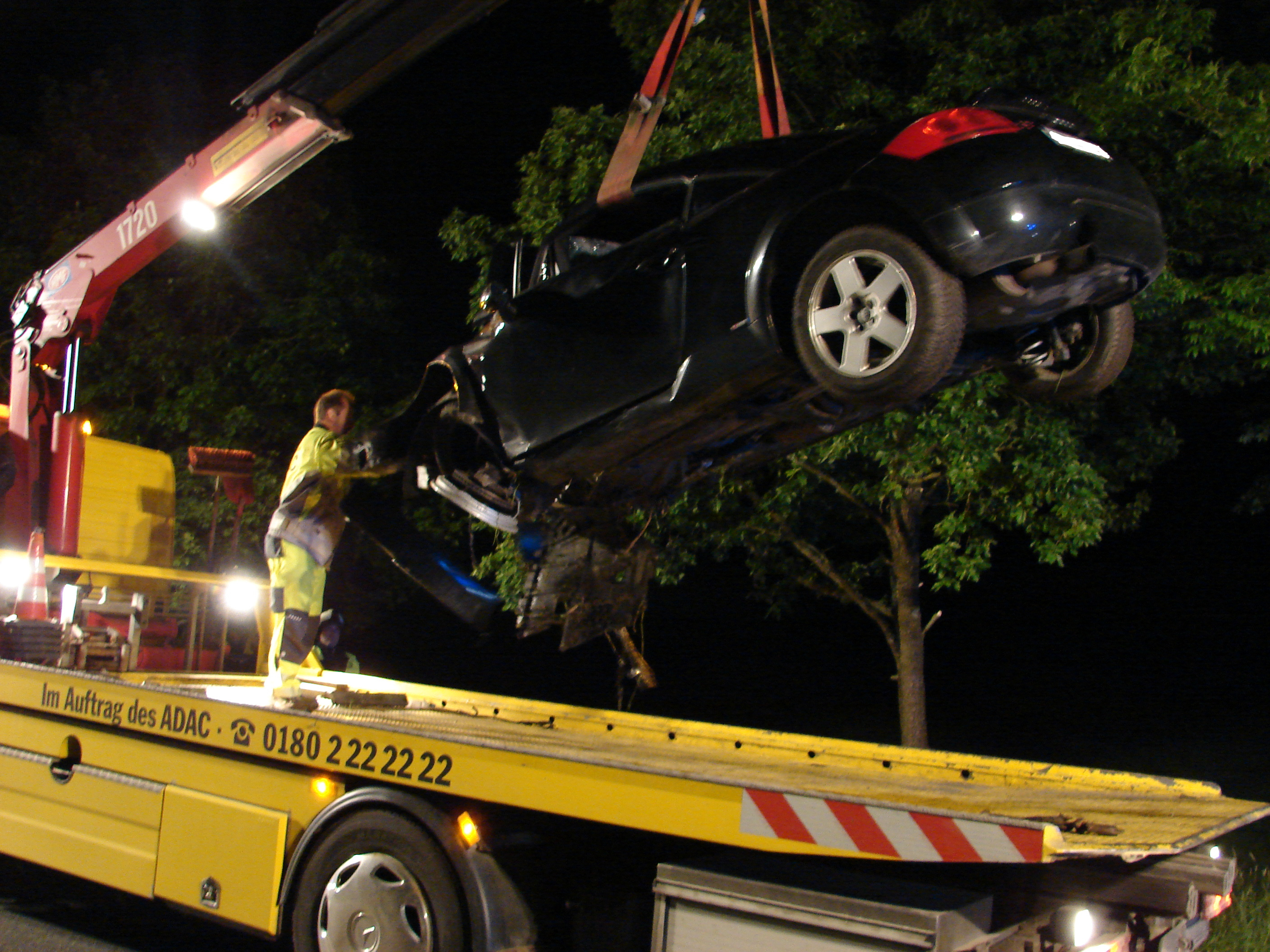 Ein Audi-Fahrer geriet aus bisher ungeklärten Gründen links von der Fahrbahn ab. Nach gut 100 Meter prallte er mit seinem TT auf der Fahrerseite frontal gegen einen Baum. Seine Beifahrerin konnte noch selbst den Notruf absetzen. Obwohl es in der Alarmierung hieß, dass eine Person eingeklemmt sei, konnte Kreisbrandmeister Uwe Jacobs Entwarnung geben. Beide Fahrzeuginsassen befreiten sich trotz ihrer Verletzungen eigenständig aus dem Auto. Die Verletzten wurden vom Notarzt und dem Rettungsdienst erst versorgt und anschließend in das Krankenhaus mit schweren Verletzungen eingeliefert.