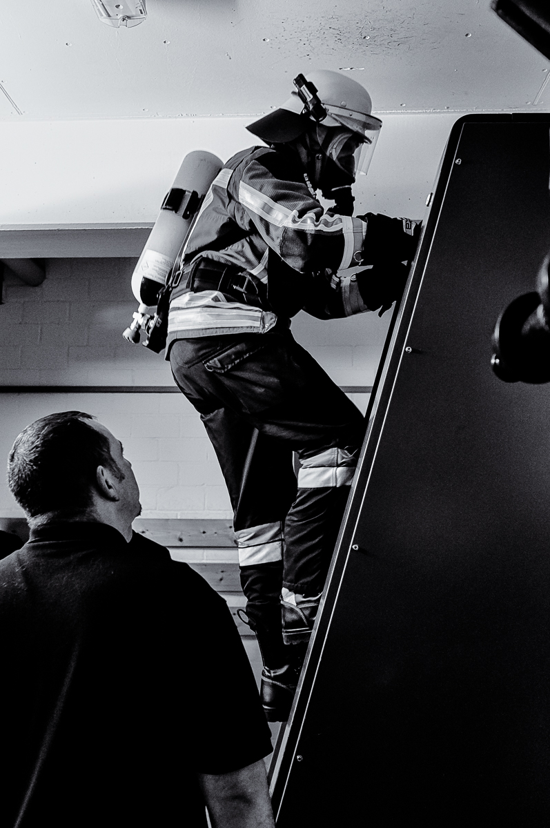 Fotografisch haben wir für diesen Bericht den Ausbildungsabschnitt in der Atemschutzübungsstrecke in der Feuerwache Bayreuth begleitet. Die in 2er-Teams vorgehenden Atemschutzgeräteträger müssen sich hier bei fast vollständiger Dunkelheit durch einen beengten Gitter-Parcours vorarbeiten und gemeinsam verschiedene Hindernisse und Barrieren überwinden. Außerdem sind weitere körperlich herausfordernde Aufgaben in Form von Endlosleiter-Steigen und Schlaghammer-Ziehen sowie ein flotter Marsch auf dem Laufband zu bewältigen.