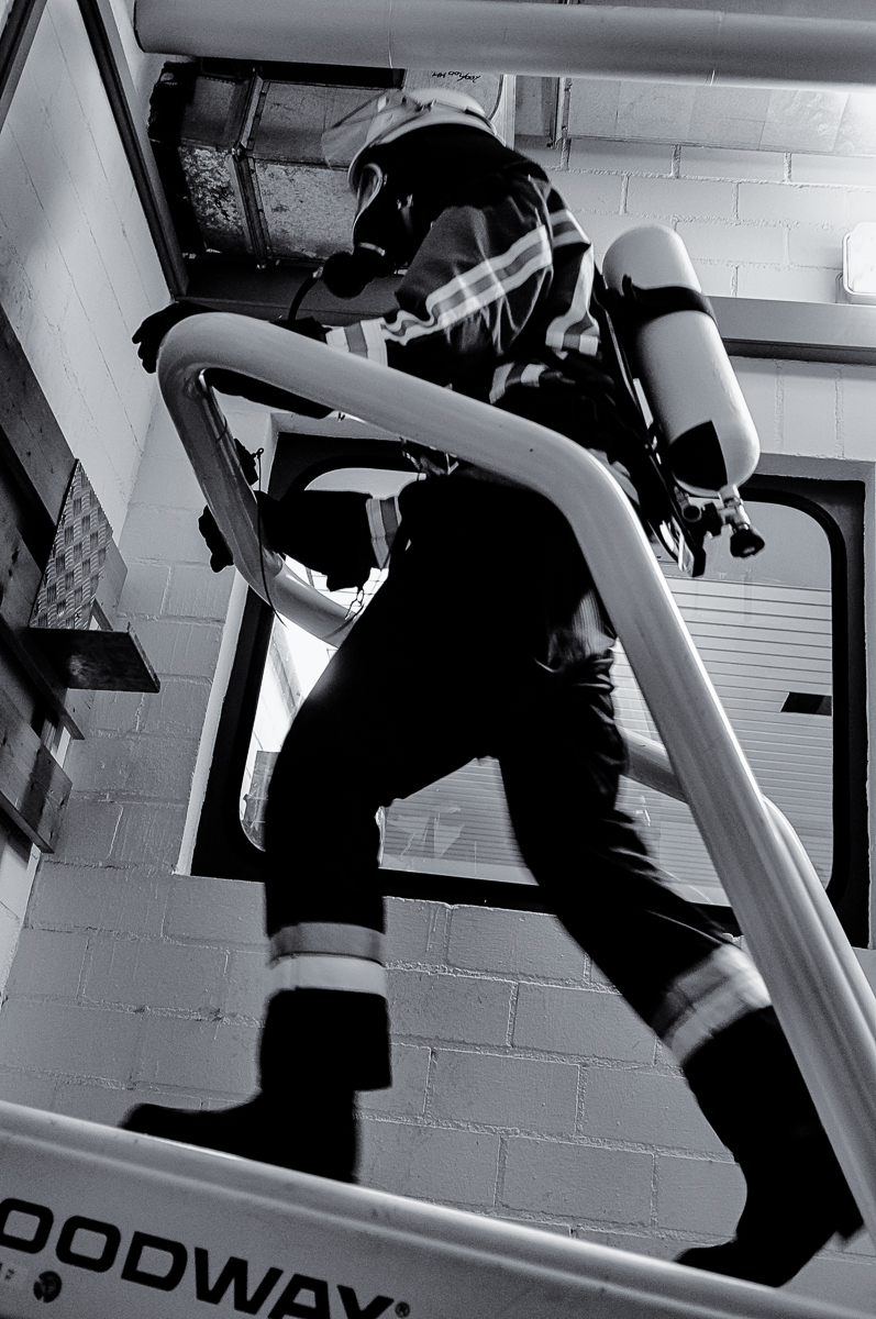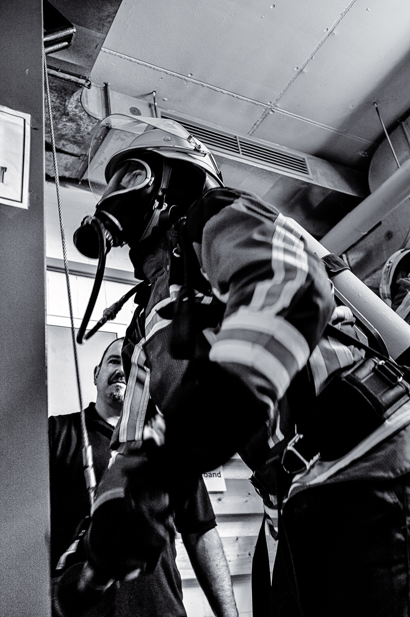Fotografisch haben wir für diesen Bericht den Ausbildungsabschnitt in der Atemschutzübungsstrecke in der Feuerwache Bayreuth begleitet. Die in 2er-Teams vorgehenden Atemschutzgeräteträger müssen sich hier bei fast vollständiger Dunkelheit durch einen beengten Gitter-Parcours vorarbeiten und gemeinsam verschiedene Hindernisse und Barrieren überwinden. Außerdem sind weitere körperlich herausfordernde Aufgaben in Form von Endlosleiter-Steigen und Schlaghammer-Ziehen sowie ein flotter Marsch auf dem Laufband zu bewältigen.