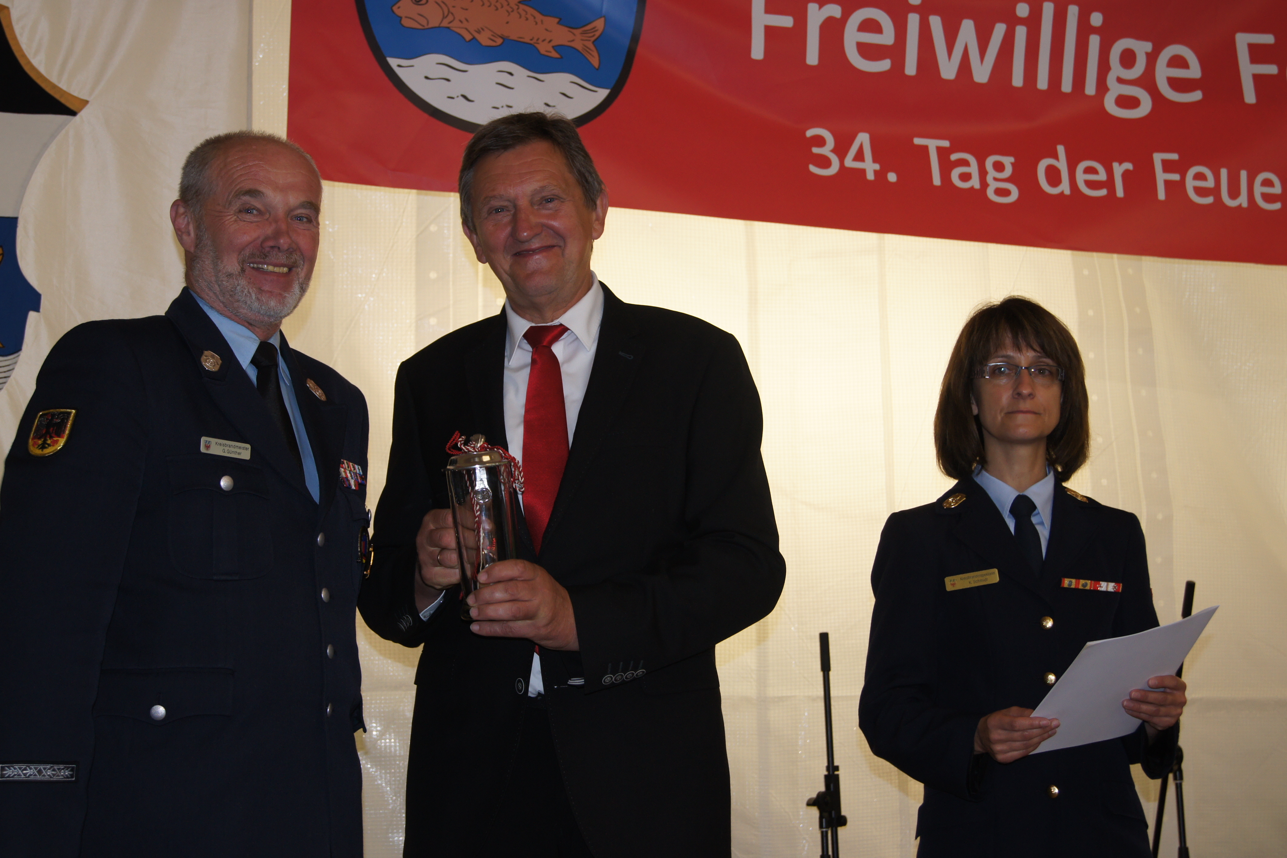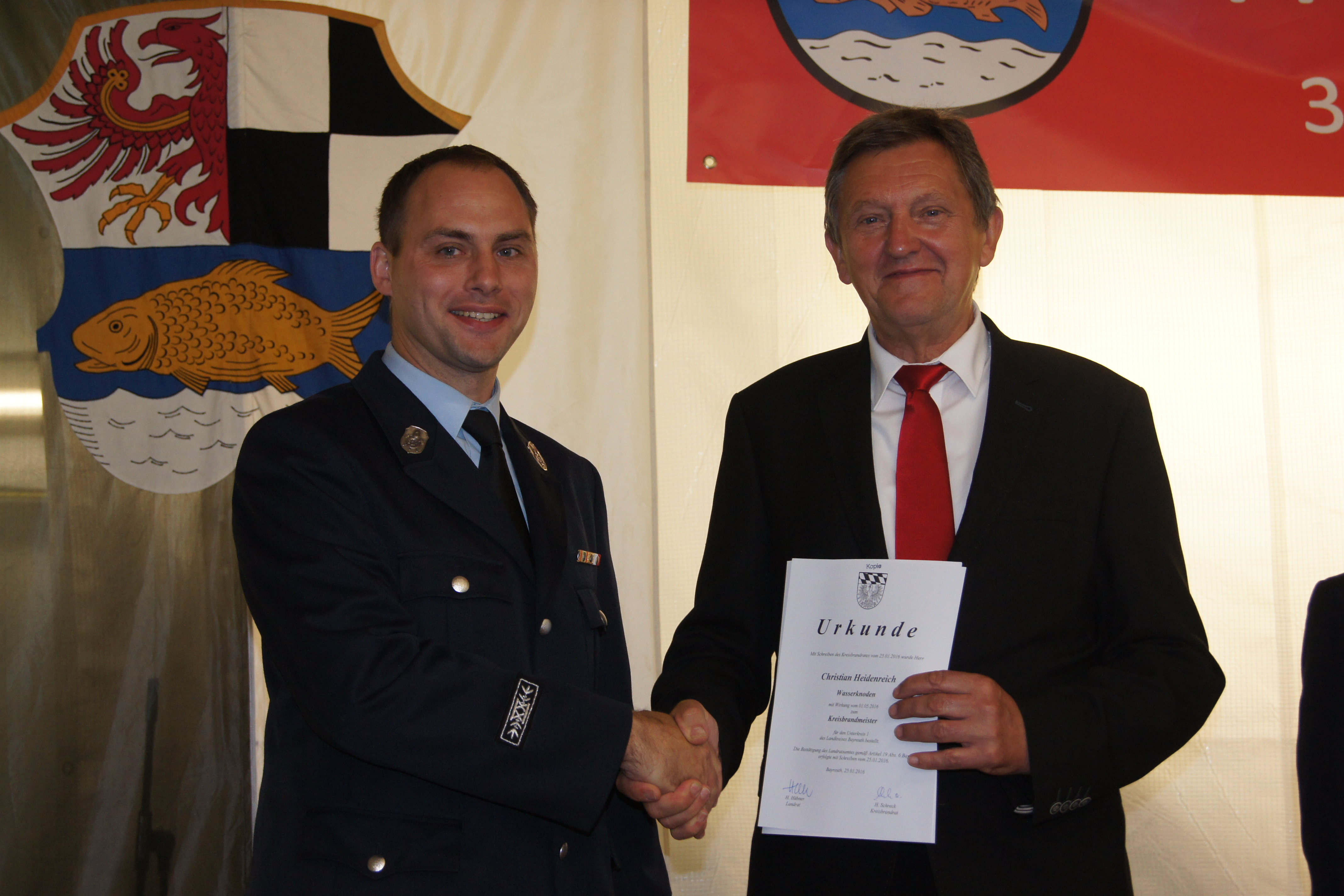 Auf einstimmigen Beschluss der Kreisbrandinspektion vom 03.05.2016 wurde Gerhard Günther anlässlich der Kommandantendienstversammlung zum Ehrenkreisbrandmeister ernannt. Günther trat 1972 in die Freiwillige Feuerwehr Münchberg ein und begleitete von 1986 – 2010 das Amt des stellvertretenden Kommandanten der Feuerwehr Streitau. 1991 wurde er zum Kreisbrandmeister Atemschutz in die Ausbildungsinspektion des Landkreises Bayreuth berufen. In dieser Funktion bildete er eine Vielzahl von Feuerwehrdienstleistenden zum Atemschutzgeräteträger aus. Seit nunmehr 25 Jahren leitete Gerhard Günther die Geschicke des Unterkreises 1 im Landkreis Bayreuth ( Großraum Gefrees, Bad Berneck ) und galt als äußerst zuverlässiger und fleißiger Führungsdienstgrad. Aus- und Fortbildung waren ihm dabei stets ein wichtiges Anliegen. Gerhard Günther leistet über 44 Jahre aktiven Feuerwehrdienst. Zu seinem Nachfolger wurde Christian Heidenreich von der Feuerwehr Wasserknoden ernannt. Der 37jährige Polizist hat bei seiner Wehr als Jugendwart und stellvertretender Kommandant gewirkt und in dieser Eigenschaft viel Erfahrung sammeln können. Mit dem erfolgreichen Besuch der Lehrgänge „Gruppenführer“, „Leiter einer Feuerwehr“, „Zugführer“ und „Verbandsführer“ hat er sich für dieses Amt qualifiziert.