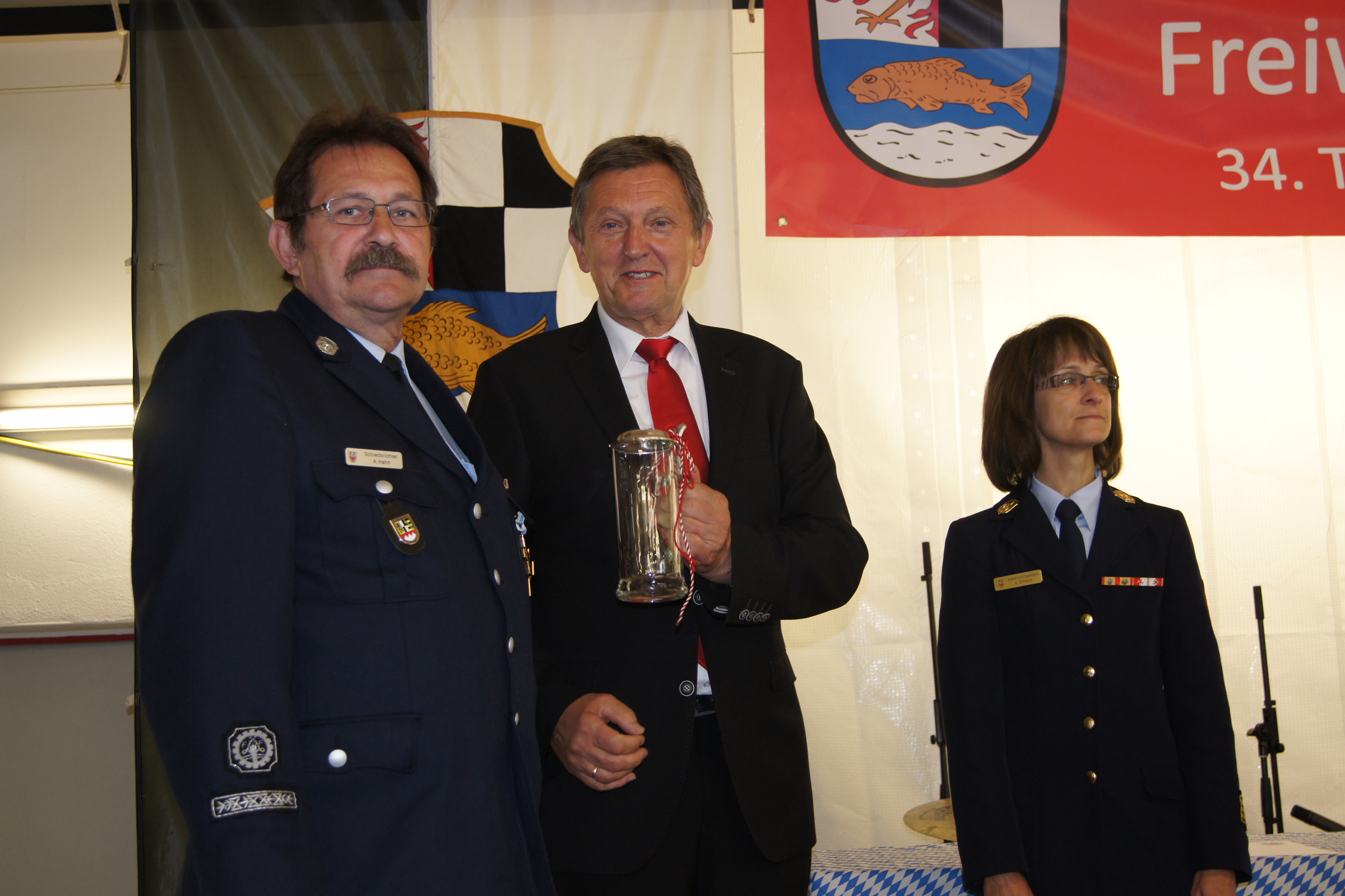 So wurde der seit 18 Jahren für die Inspektion II tätige Schiedsrichter Alfred Hahn verabschiedet und mit einem Landkreisgeschenk bedacht. Kreisbrandrat Schreck würdigte ihn als stets fairen Schiedsrichter, der in seiner Zeit eine Vielzahl von Leistungsprüfungen abgenommen hat und sich vor allem bei Jugendveranstaltungen und Wettbewerben im Landkreis und Bezirk ehrenamtlich eingebracht hat. Da Alfred Hahn sein 63. Lebensjahr vollendet hat, muss er gemäß Bayerischen Feuerwehrgesetz nun seinen aktiven Dienst beenden. Neuer Schiedsrichter für die Inspektion II ist seit dem 01. April 2016 Oliver Becker, erster Kommandant der Freiwilligen Feuerwehr Glashütten.