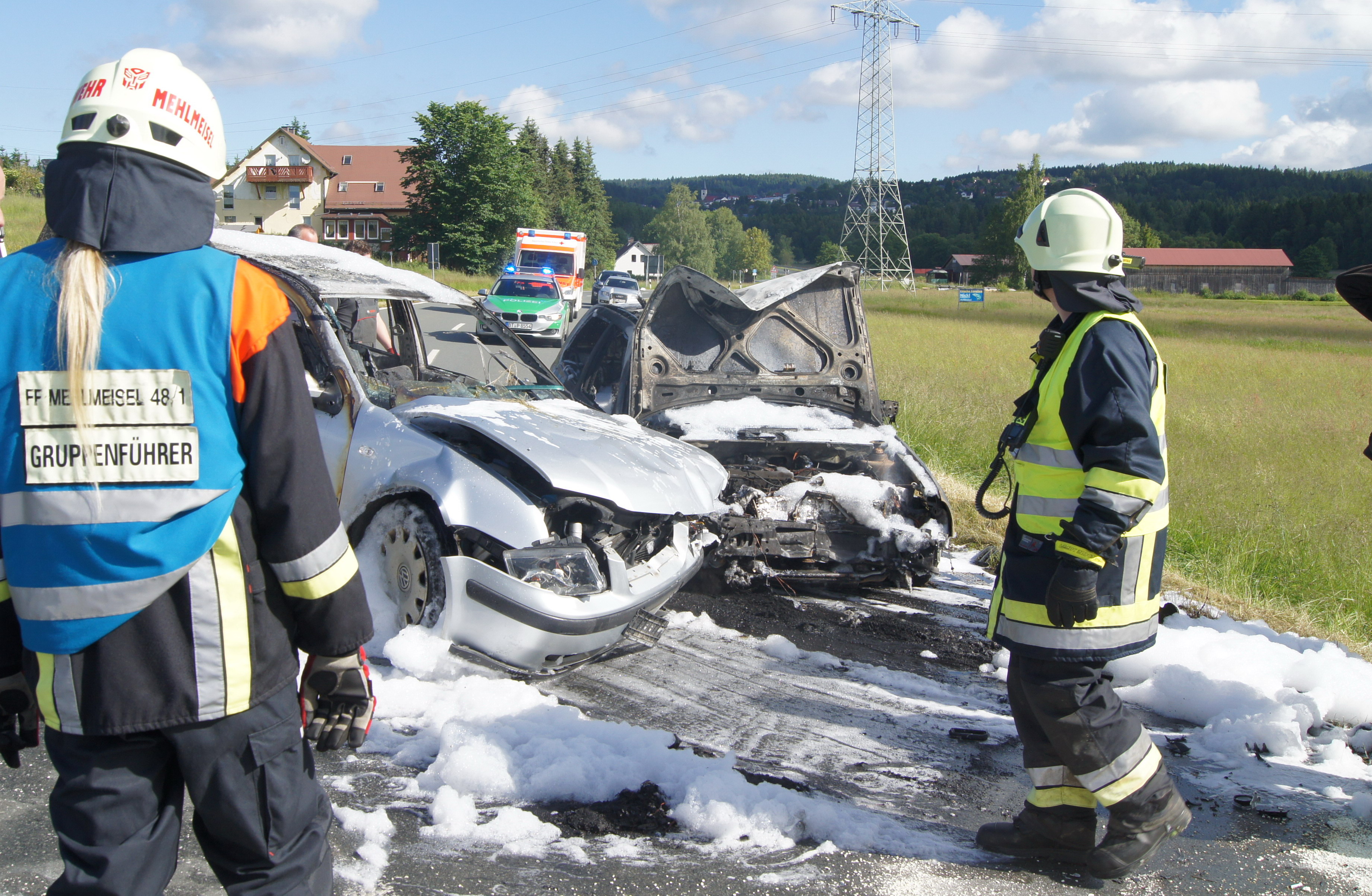 Zu einem Verkehrsunfall wurden die Freiwilligen Feuerwehren Mehlmeisel und Unterlind am 20.06.2016 um 8.26 Uhr auf die Staatsstraße 2181 auf Höhe der Abzweigung Mehlmeisel alarmiert. Bereits beim Eintreffen der ersten Rettungskräfte standen die zwei beteiligten Fahrzeuge in Vollbrand und wurden von den Einsatzkräften der Feuerwehr sofort abgelöscht. Glücklicherweise konnten die Insassen vor Ausbruch des Feuers ihre Fahrzeuge selbständig und nur leicht verletzt verlassen. Die Feuerwehr kümmerte sich zudem um die Verkehrsregelung und reinigte die Fahrbahn. Zur weiteren Veranlassung entsprechender Maßnahmen an der beschädigten Fahrbahndecke wurde der zuständige Straßenbaulastträger hinzugezogen. Insgesamt waren rund 25 Kräfte von Feuerwehr, Rettungsdienst und Polizei im Einsatz. Die Einsatzleitung Feuerwehr hatte Johannes Geisler inne.