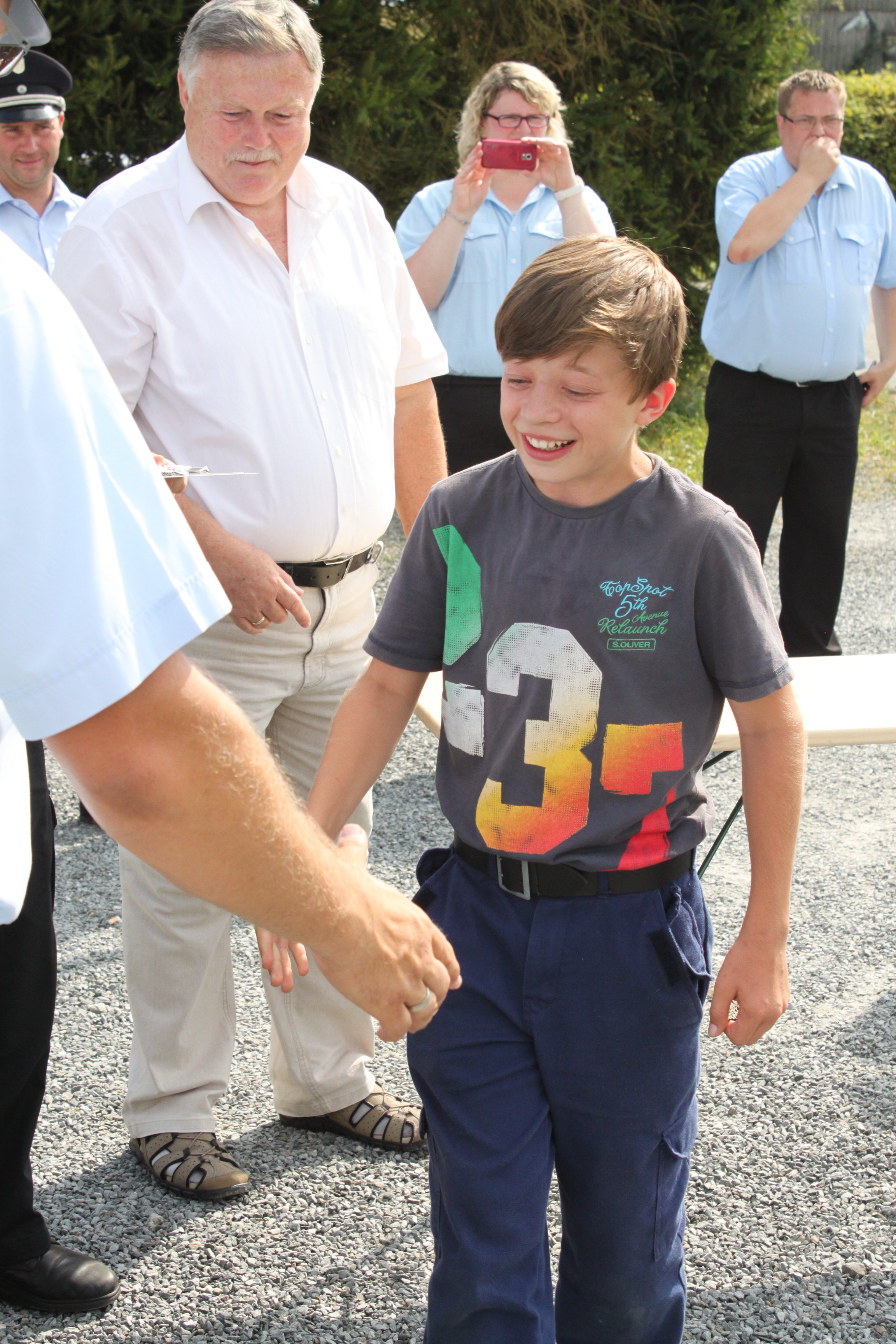 Der Abnahmeberechtigte Schiedsrichter Gerold Schneiderbanger aus dem Landkreis Bamberg lobte die Leistungen der Anwärter und Jugendwarte und übergab zusammen mit den Inspektoren und dem Bürgermeister das höchste und schönste Abzeichen der Jugendfeuerwehr an die Feuerwehranwärterinnen und Anwärter.