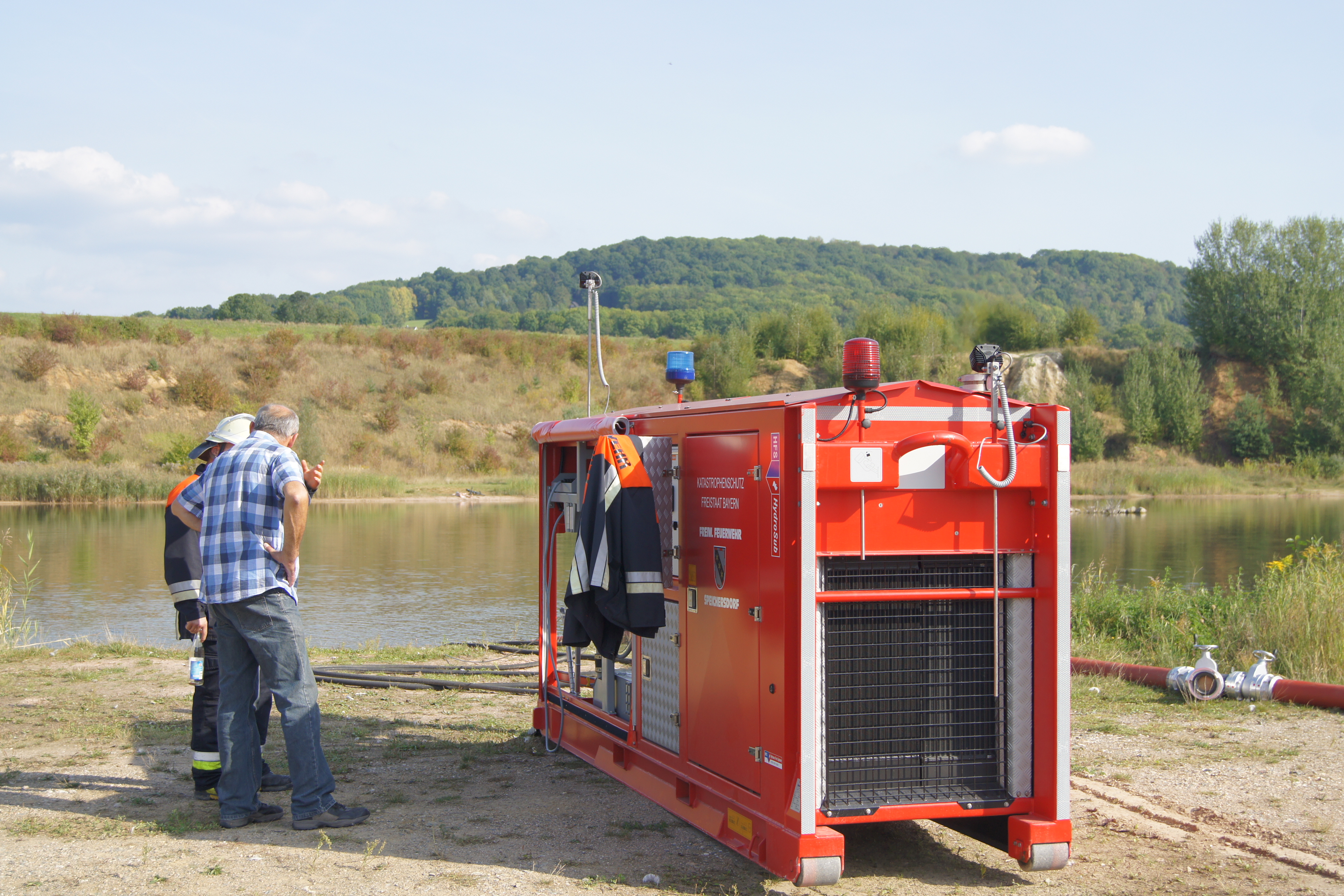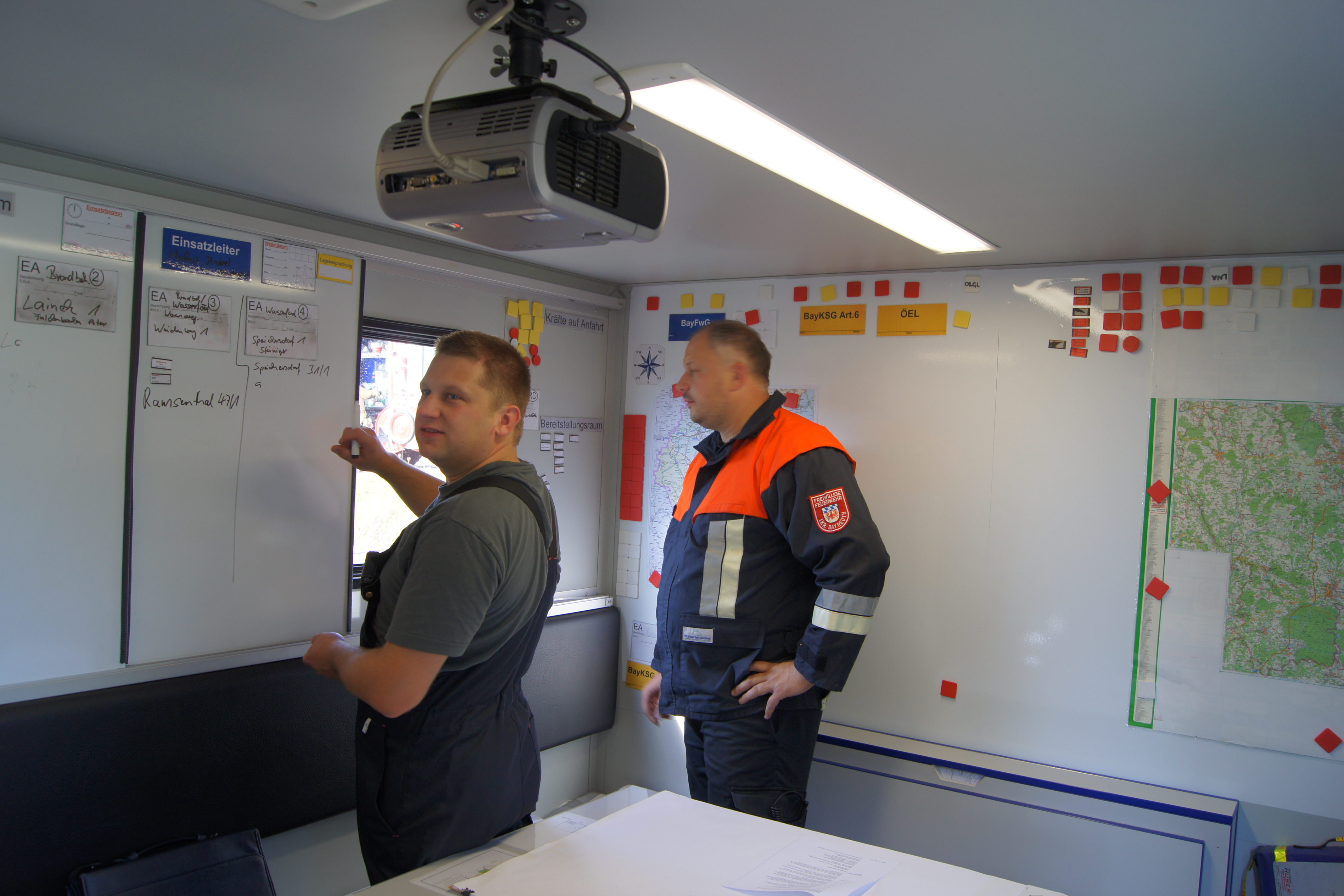 Einsatzleiter Markus Strobel koordinierte gemeinsam mit Kreisbrandmeister Konrad Bauer die Großübung, unterstützt durch die Unterstützungsgruppe Örtliche Einsatzleitung. Eingeteilt in vier Einsatzabschnitte, hatte die Menschenrettung höchste Priorität. Insgesamt 12 vermeintlich Verletzte wurden gerettet. Ein starkes Augenmerk galt der Wasserversorgung. So wurde unter anderem das Wechselladerfahrzeug mit dem Abrollbehälter Wasserförderung, das bei der Feuerwehr Speichersdorf stationiert ist, an die Einsatzstelle geordert, um vom rund 700 Meter entfernten Kiesweiher Löschwasser zu fördern. Der Abrollbehälter Atem- und Strahlenschutz von der Feuerwehr Pegnitz wurde ebenfalls an die Übungsstelle geholt. Die Drehleitern aus Bayreuth und Weidenberg unterstützten die Brandbekämpfungsmaßnahmen. Die Helfer des Bayerischen Roten Kreuzes (BRK) kümmerten sich um die Verletzten und deren weitere Versorgung.