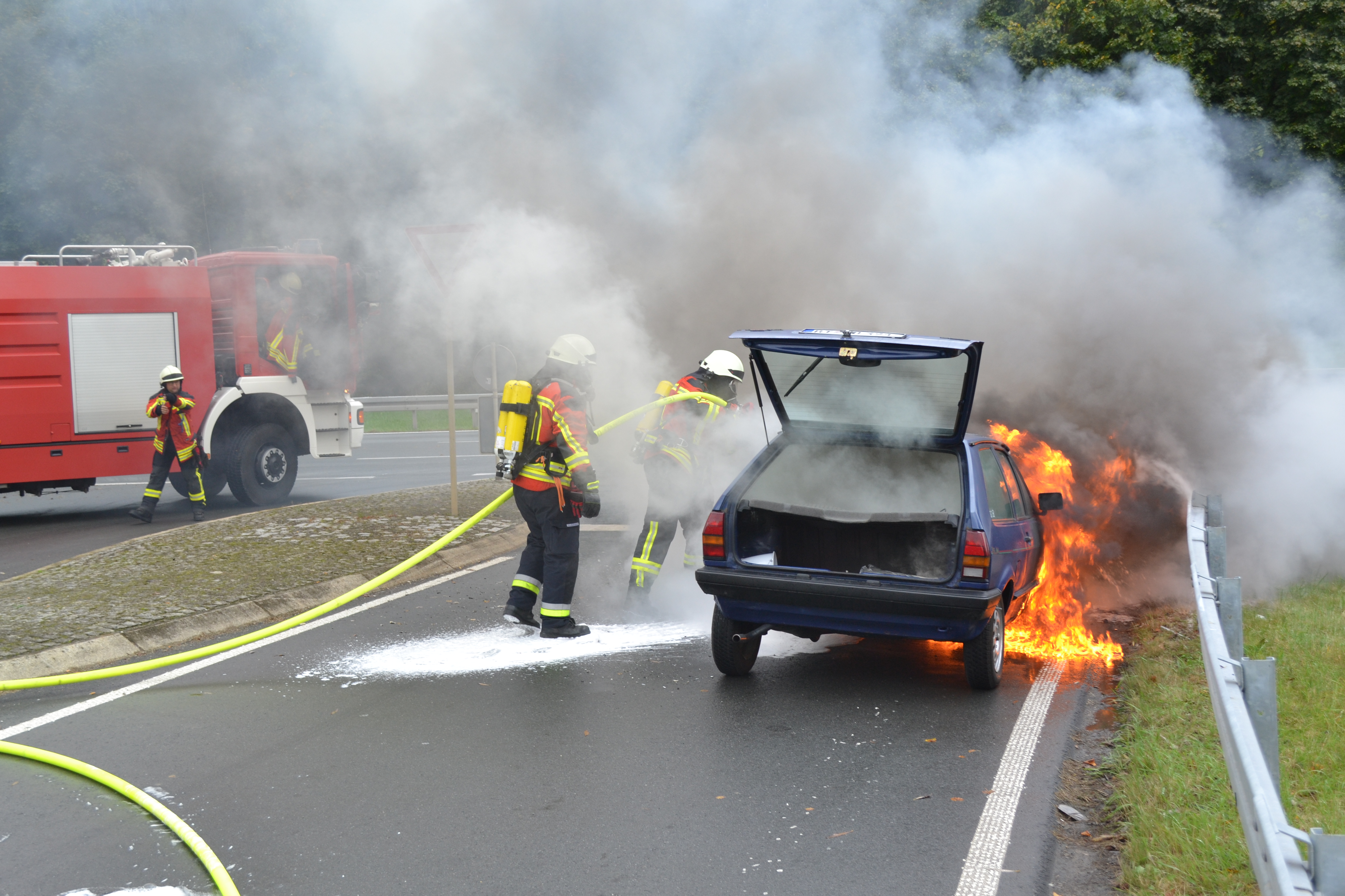 Dort stand ein VW bereits fast im Vollbrand. Die Feuerwehr löschte den Brand mit Netzwasser, sicherte den Verkehr ab und band auslaufenden Treibstoff. Für den ebenfalls anwesenden Rettungsdienst gab es glücklicherweise keine weiteren Aufgaben und die Beamten der Polizei nahmen wie üblich den Schaden auf.