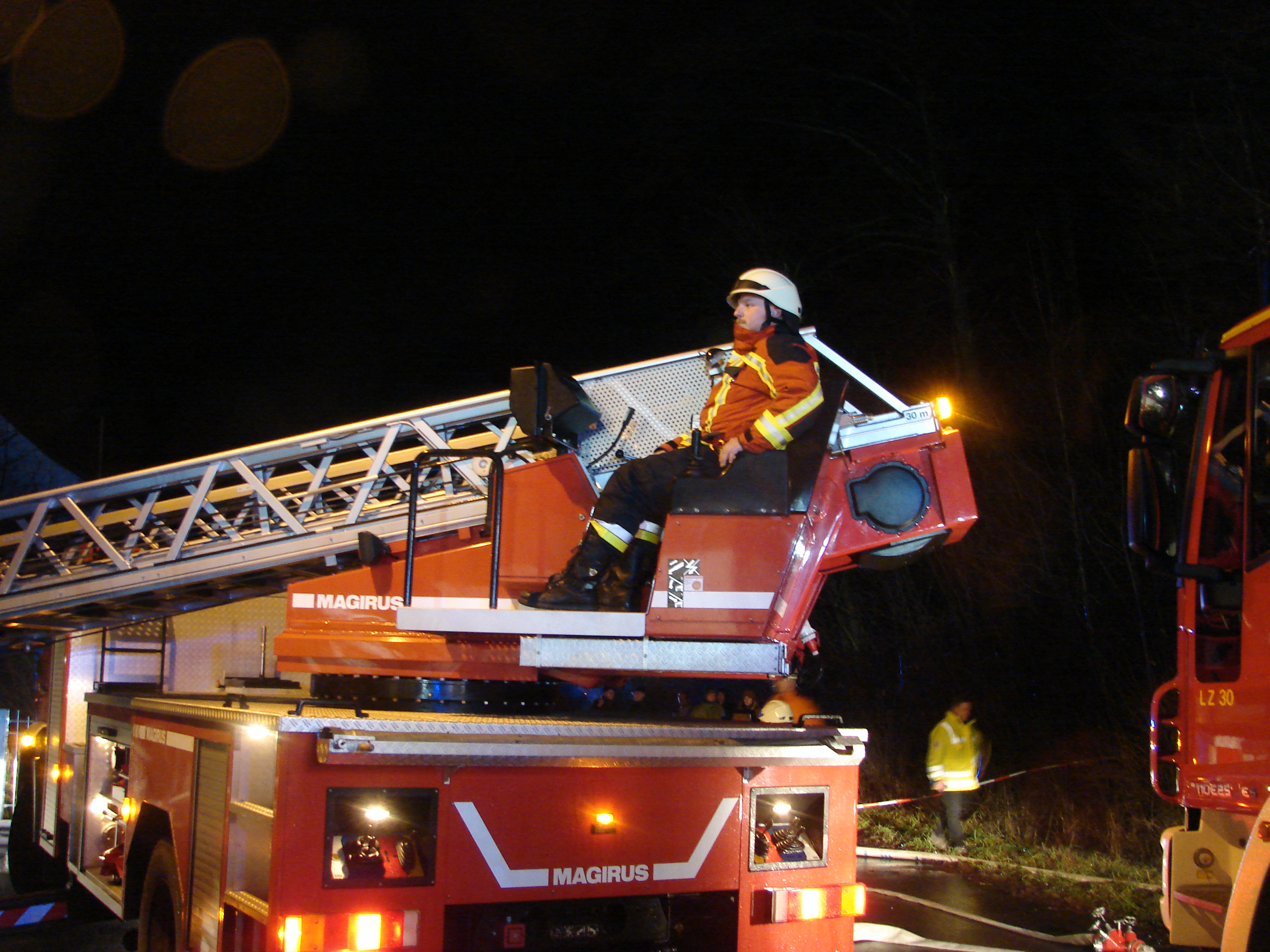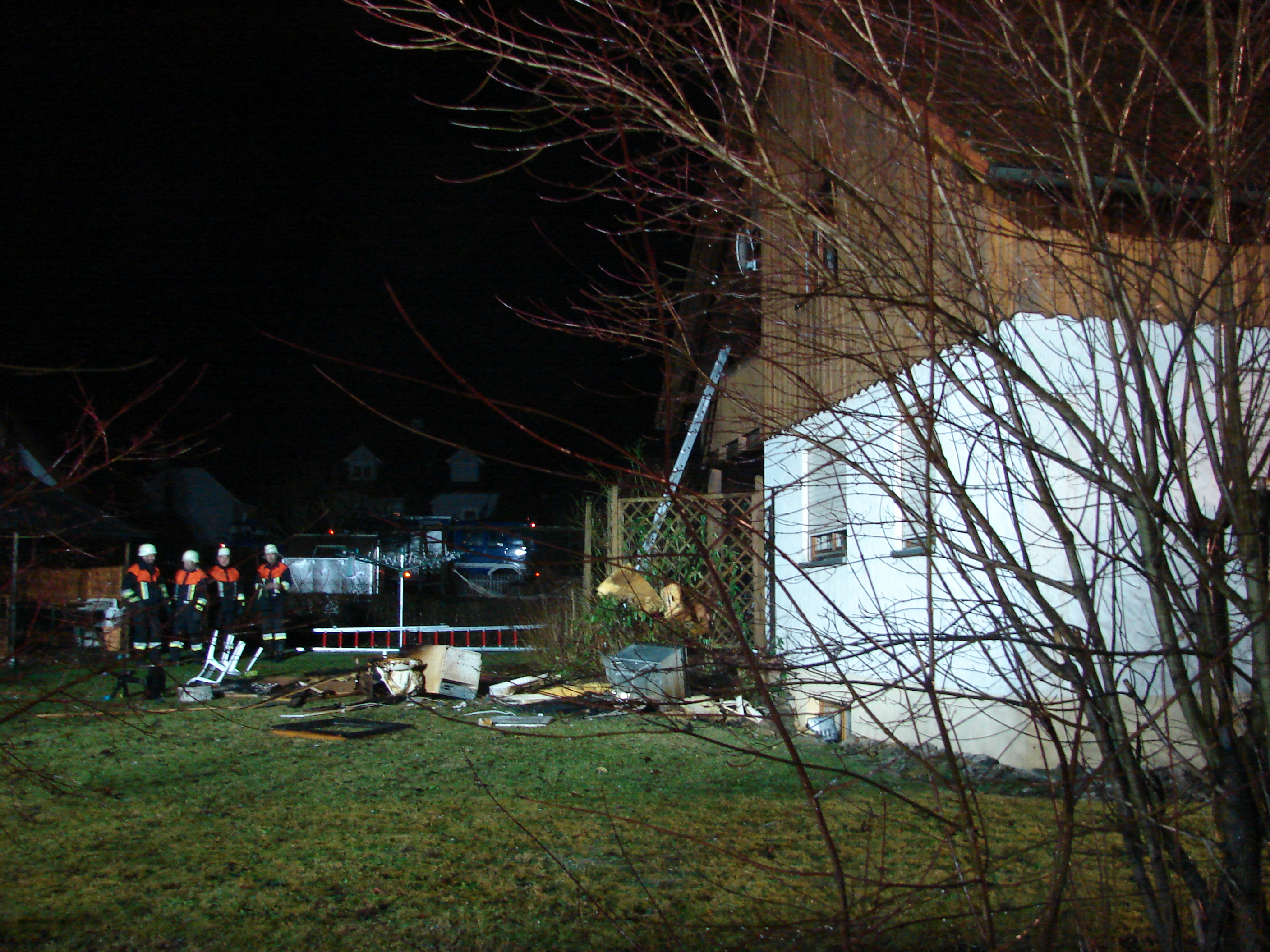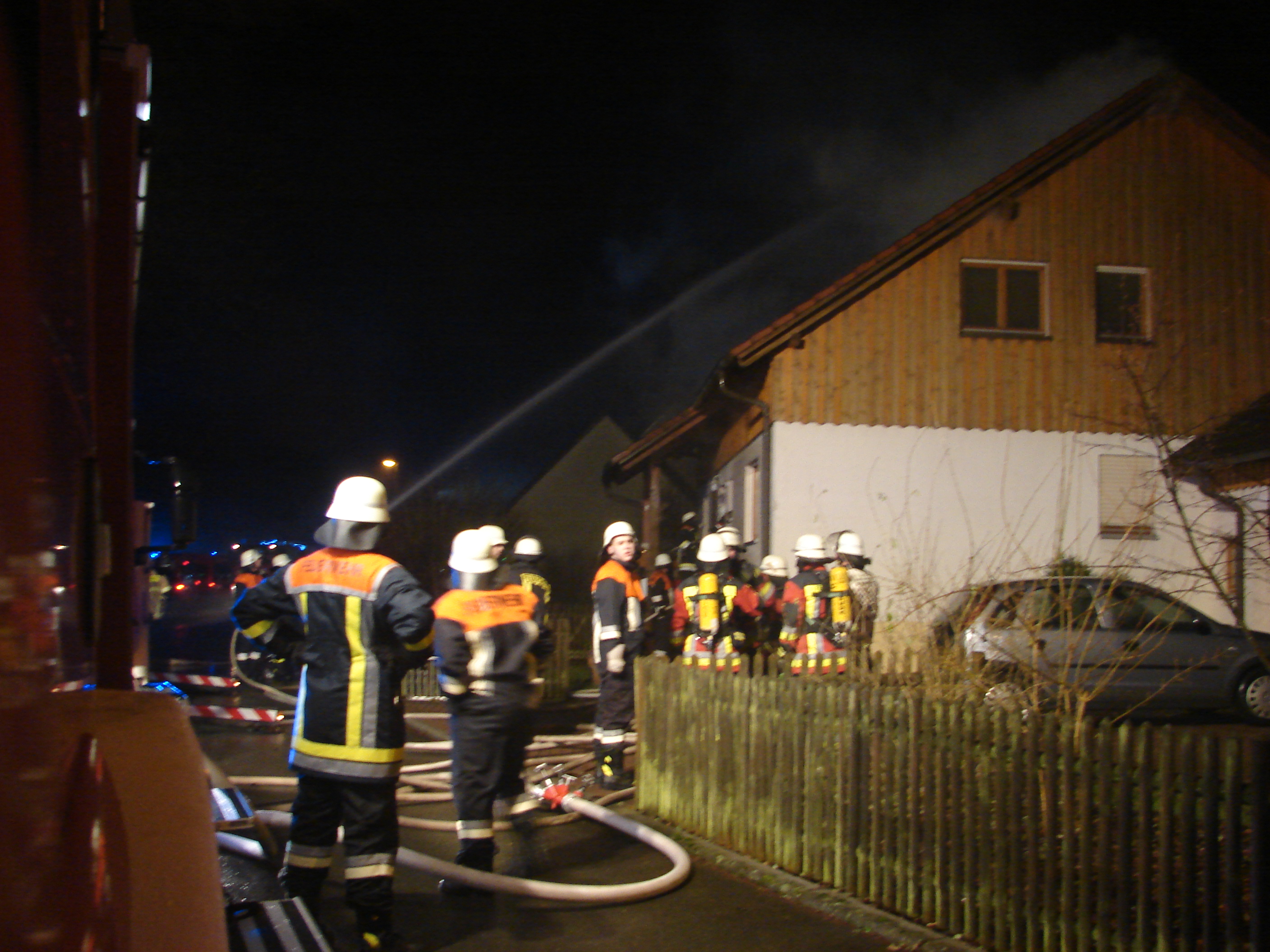 Die ersten Feuerwehrkräfte fanden ein Einfamilienhaus vor, aus dessen Dachgeschoss starker Rauch qualmte. Das Innere des Hauses war bereits stark verraucht, so dass nur Atemschutzträger vordringen konnten. Die Bewohner des Hauses wurden in Sicherheit gebracht und dem BRK zur weiteren Versorgung übergeben. Eine Person wurde umgehend mit Verdacht auf eine Rauchgasvergiftung in ein Krankenhaus gebracht. Zwei weitere Personen begaben sich später in ärztliche Behandlung. Das Großaufgebot an Einsatzkräften, das immer bei diesem Einsatzstichwort zum Einsatzort eilt, baute die Löschwasserversorgung aus einem Weiher und aus dem Hydranten-Netz auf. Die Drehleitern aus Bayreuth und Pegnitz wurden in Stellung gebracht. Über diese wurde die Dachhaut gekühlt, an zwei Stellen wurden die Ziegel entfernt, damit man unter die Isolierung kam, um die Brandnester zu bekämpfen. Zahlreiche Atemschutzträger rückten dem Brand von Innen zu Leibe. Hierzu wurden Teile der Deckenverkleidung entfernt und ins Freie befördert. Durch diese schnellen Maßnahmen konnte verhindert werden, dass sich der Brand auf das gesamte Haus ausbreitete. Neben den Wehren aus dem Landkreis Bayreuth wurde aus der benachbarten Oberpfalz die Feuerwehr Vorbach alarmiert. Das THW leuchtete den Einsatzort aus. So hatte der örtliche Einsatzleiter, der durch die Unterstützungsgruppe örtlicher Einsatzleiter ( UG-ÖEL ), Kreisbrandrat Hermann Schreck, Kreisbrandinspektorin Kerstin Schmidt und eine Vielzahl von Kreisbrandmeistern unterstützt wurde, über 200 Rettungskräfte zur Verfügung. Während der Nacht wurde eine Brandwache gestellt. Die Bewohner des Hauses kommen bei Verwanden unter, da das Haus vorerst nicht bewohnt werden kann.