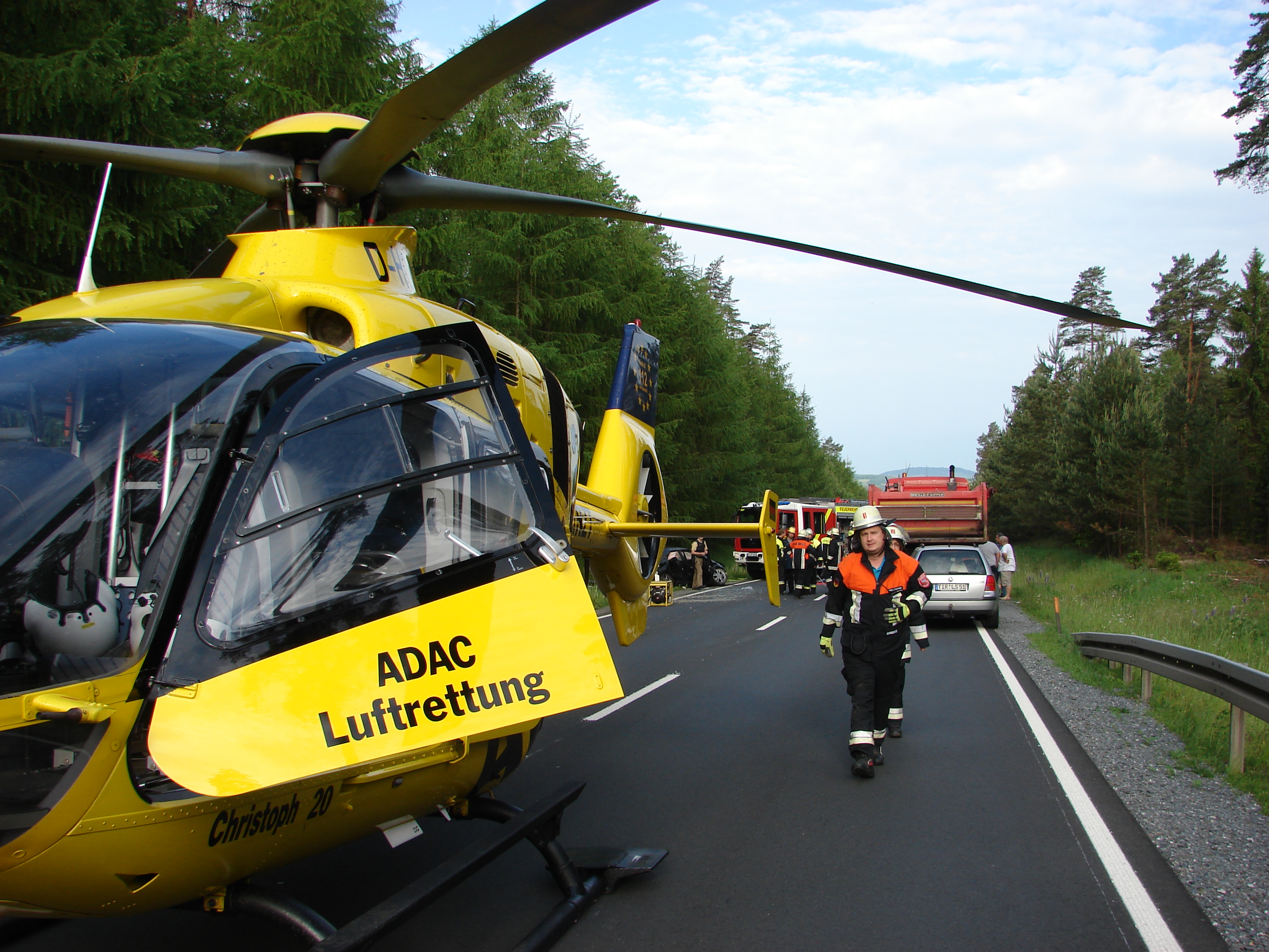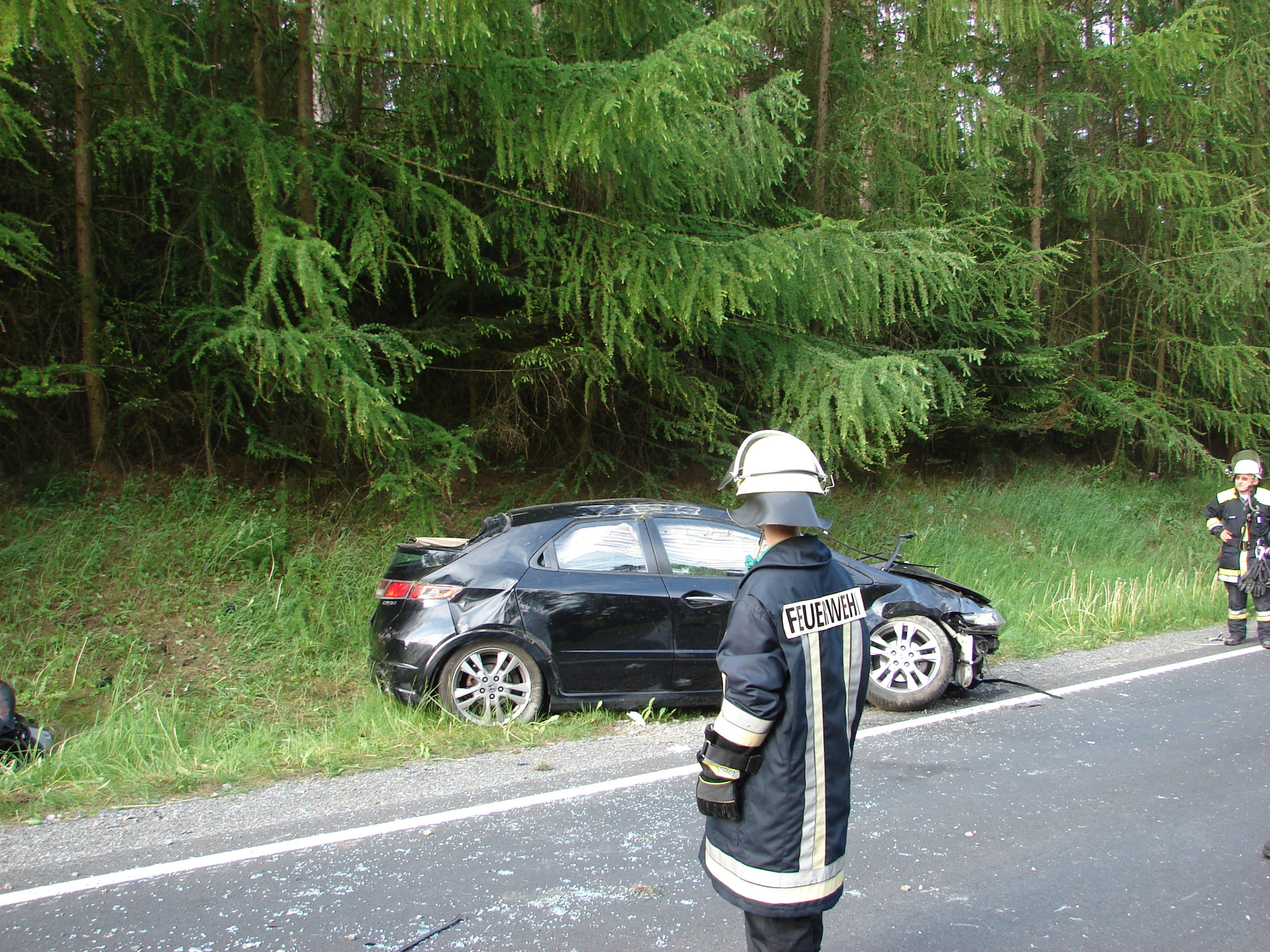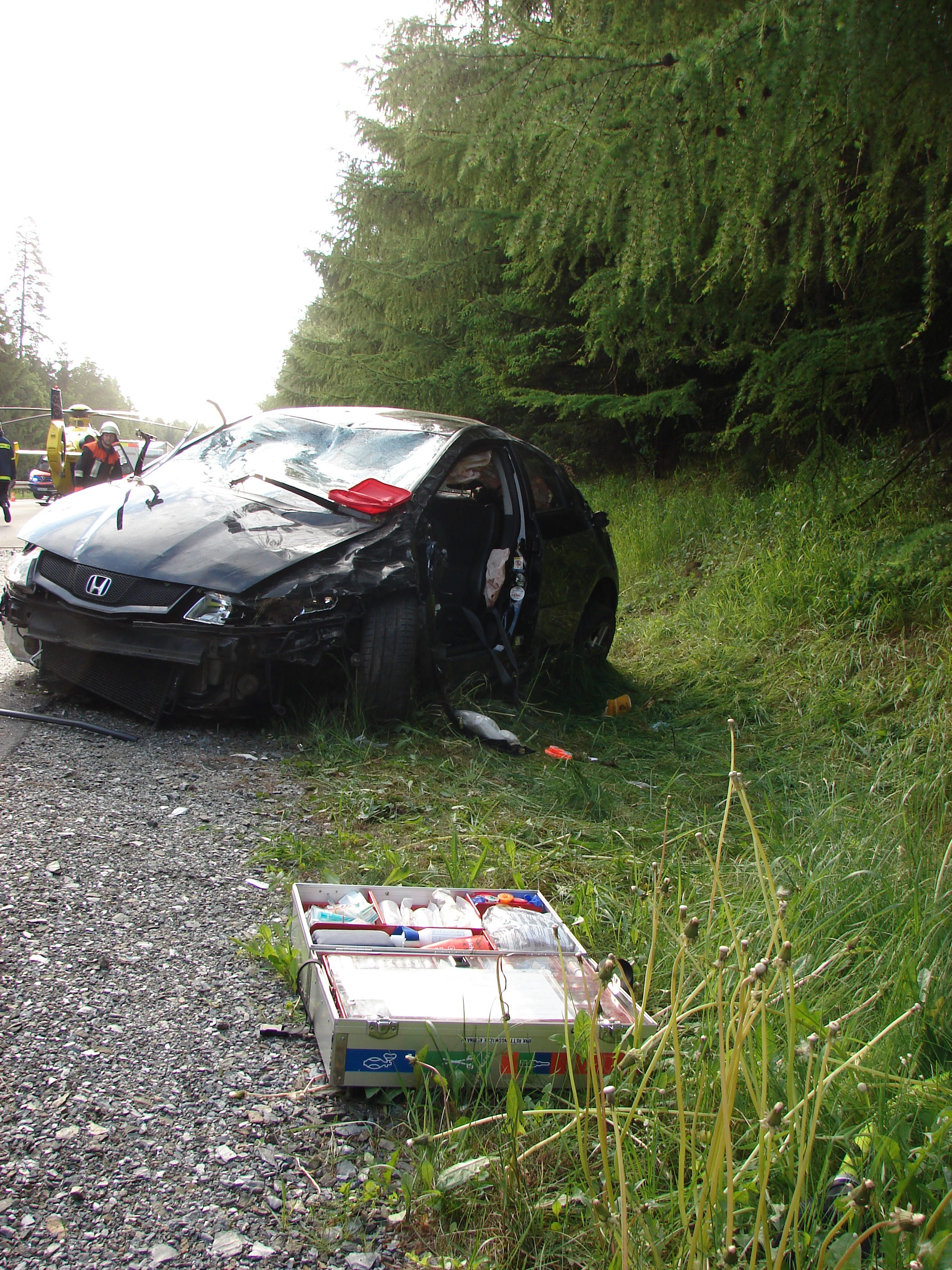 Die Einsatzkräfte fanden einen an der Böschung liegenden Personenkraftwagen vor, in dem der Fahrer schwer eingeklemmt war. Die eingesetzten Kräfte befreiten den Fahrer unter Aufsicht eines Notarztes, der mit dem Rettungshubschrauber Christoph 20 eingeflogen wurde, mittels Rettungsspreizer und -schere. Trotz aller Bemühungen der Hilfs- und Rettungskräfte verstarb der Patient noch an der Unfallstelle.