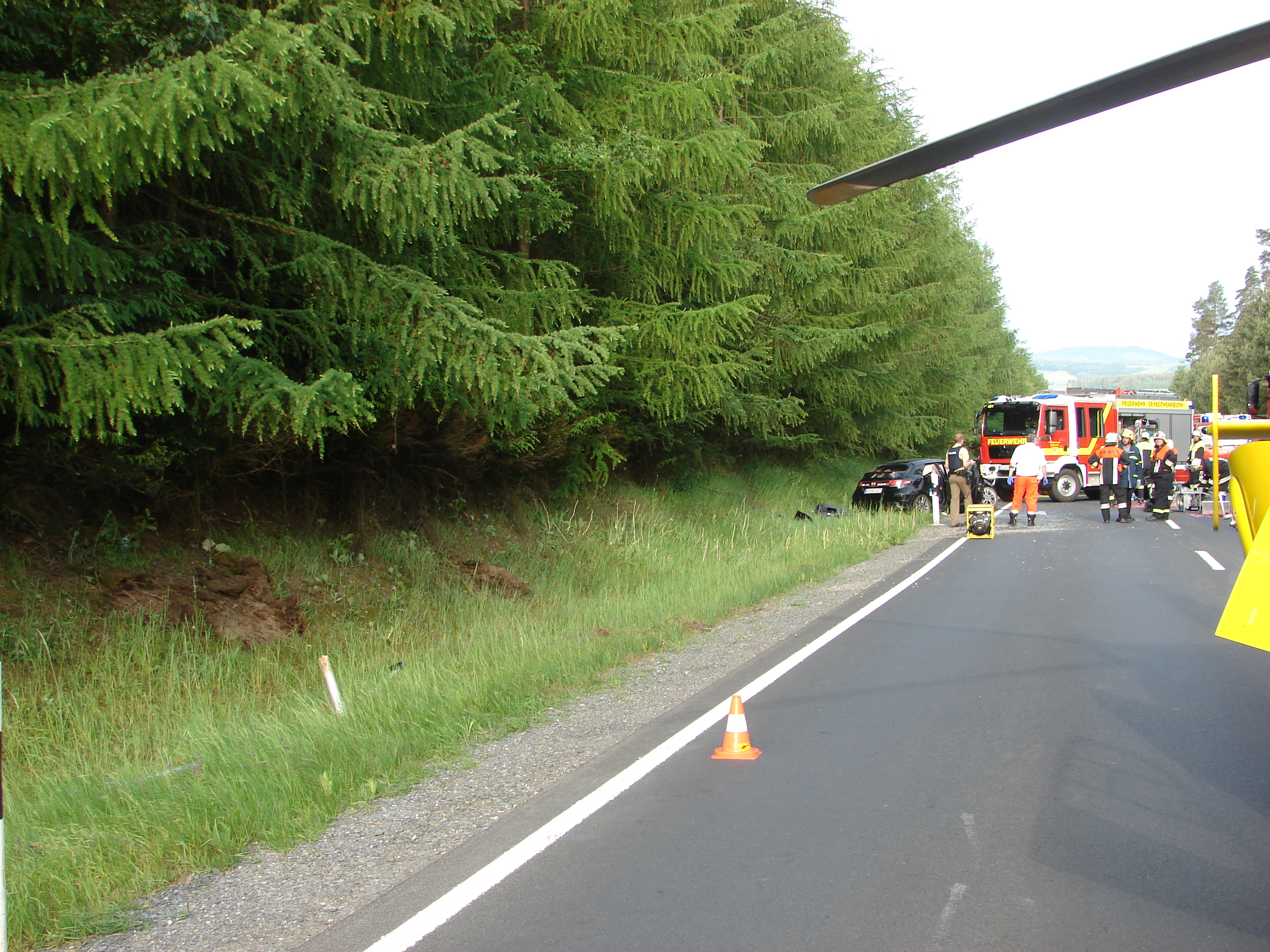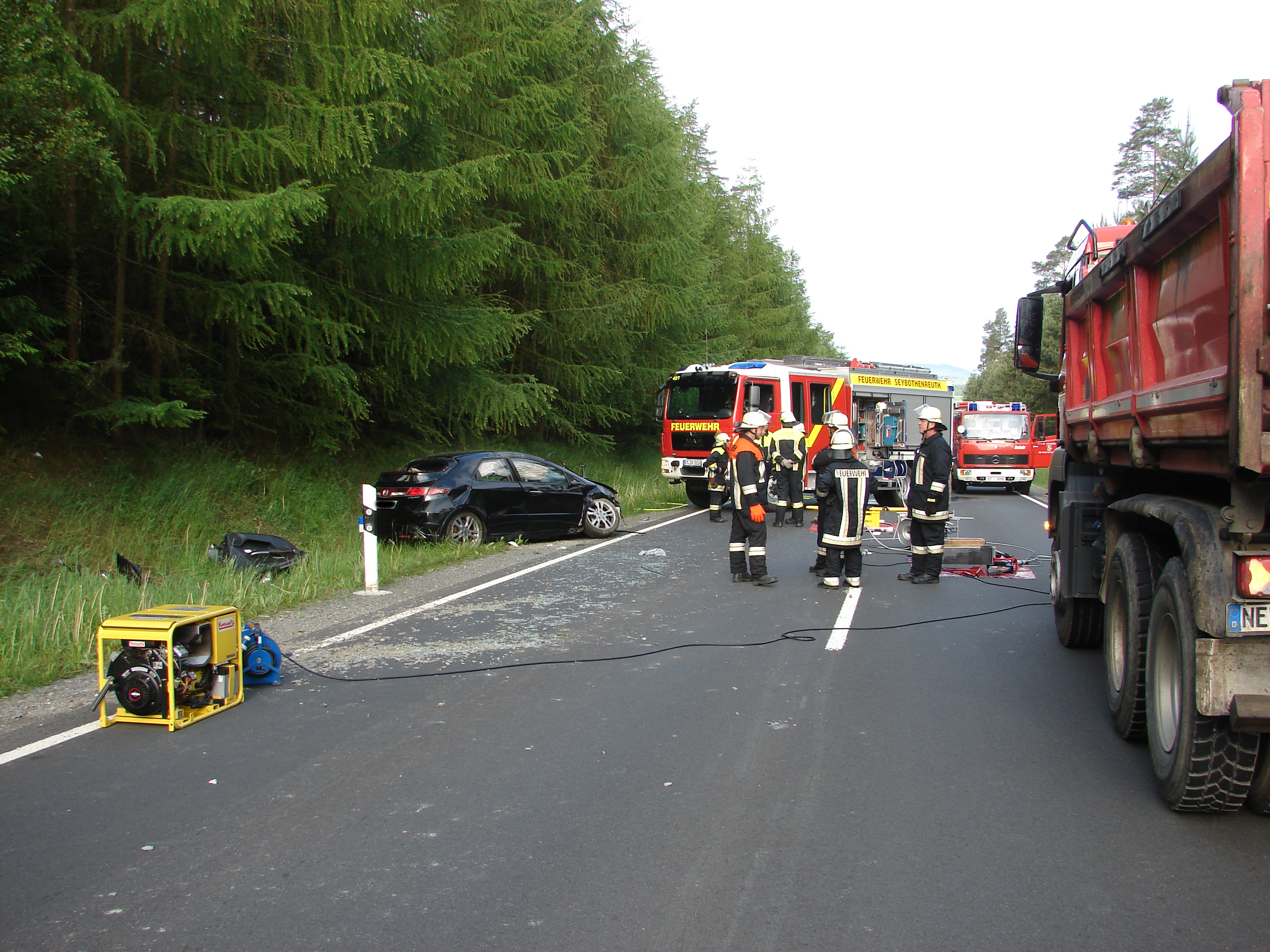 Kurz nach 7:15 Uhr wurden die Feuerwehren aus Seybothenreuth, Kirchenlaibach und Windischenlaibach am Montag, den 29.05.2017, von der Integrierten Leitstelle Bayreuth zu einem Verkehrsunfall, mit dem Alarmstichwort: Verkehrsunfall; Person eingeklemmt, auf der Bundesstraße 22 zwischen Speichersdorf und Seybothenreuth alarmiert.