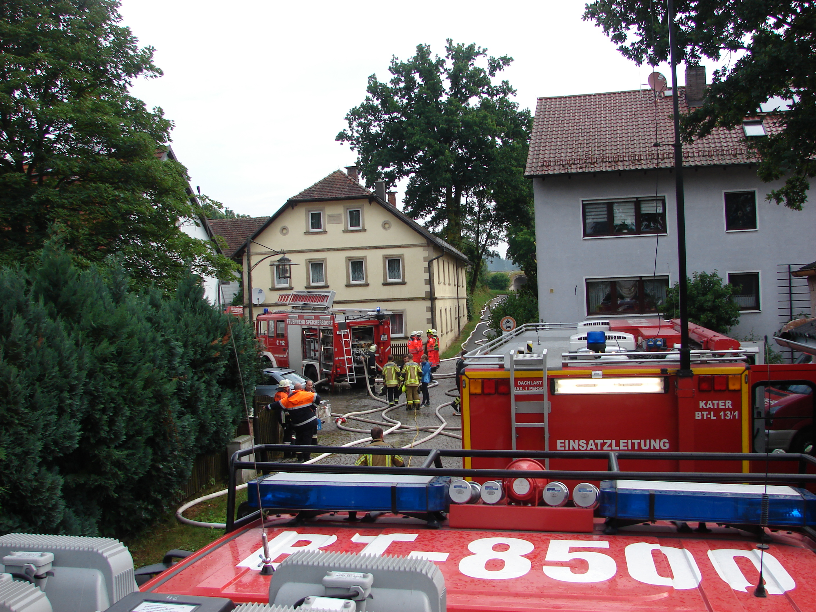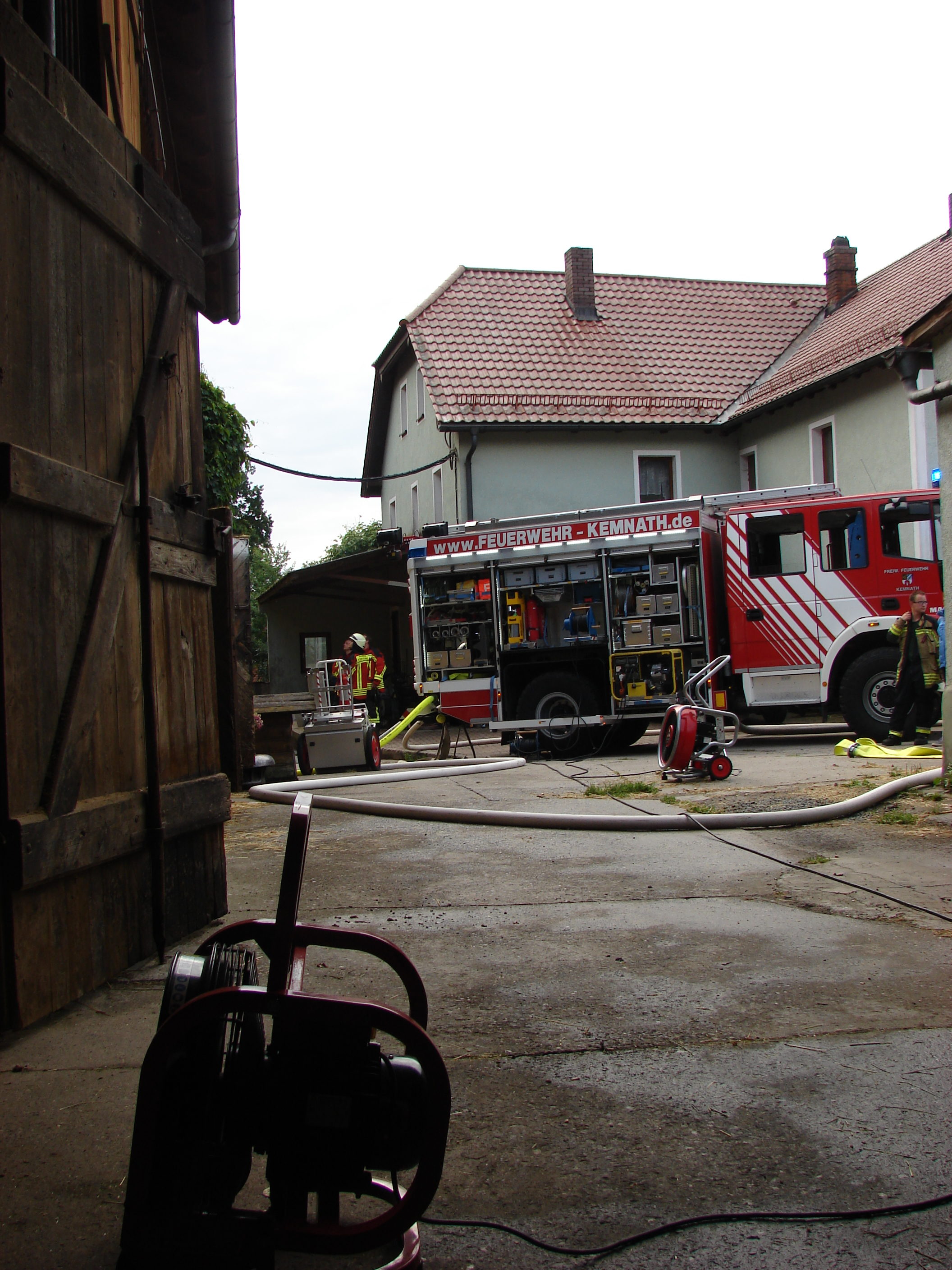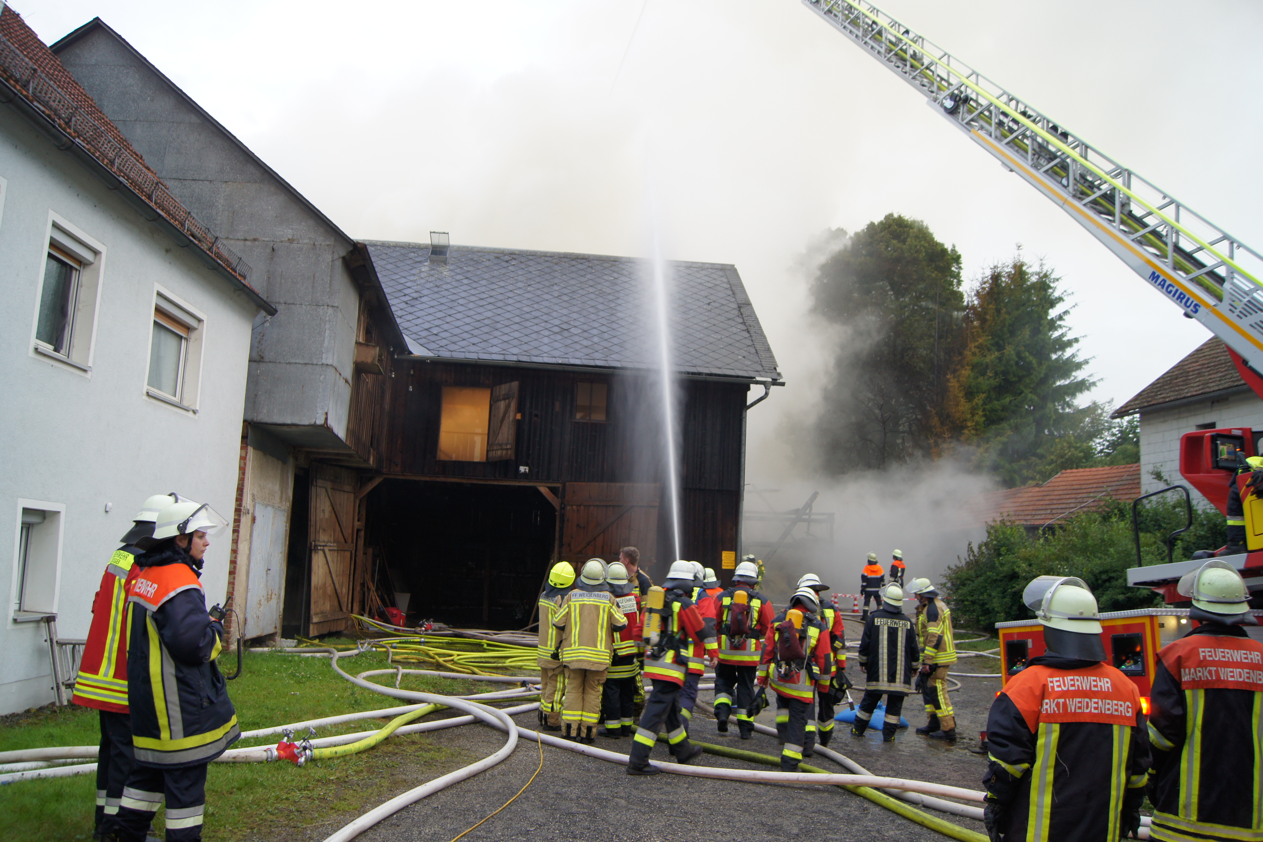 Beim sofortigen Eintreffen der ersten Kräfte wurde festgestellt, dass eine Scheune im Vollbrand stand. Es galt, weitere Gebäude vor den bereits übergreifenden Flammen zu schützen. Mit massivem Löschwassereinsatz, unter anderem mit den zwei Drehleitern aus Kemnath und Weidenberg, gelang dies erfolgreich. Eine nebenstehende Scheune war zwar bereits in Mitleidenschaft gezogen, der Brand konnte jedoch hierauf begrenzt und weiterer Schaden abgewendet werden. Aufgrund des enormen Bedarfs an wasserführenden Fahrzeugen, Atemschutzgeräten und -trägern wurden die Feuerwehren Creußen und Bindlach sowie der Abrollbehälter Atem- und Strahlenschutz aus Pegnitz nachalarmiert.