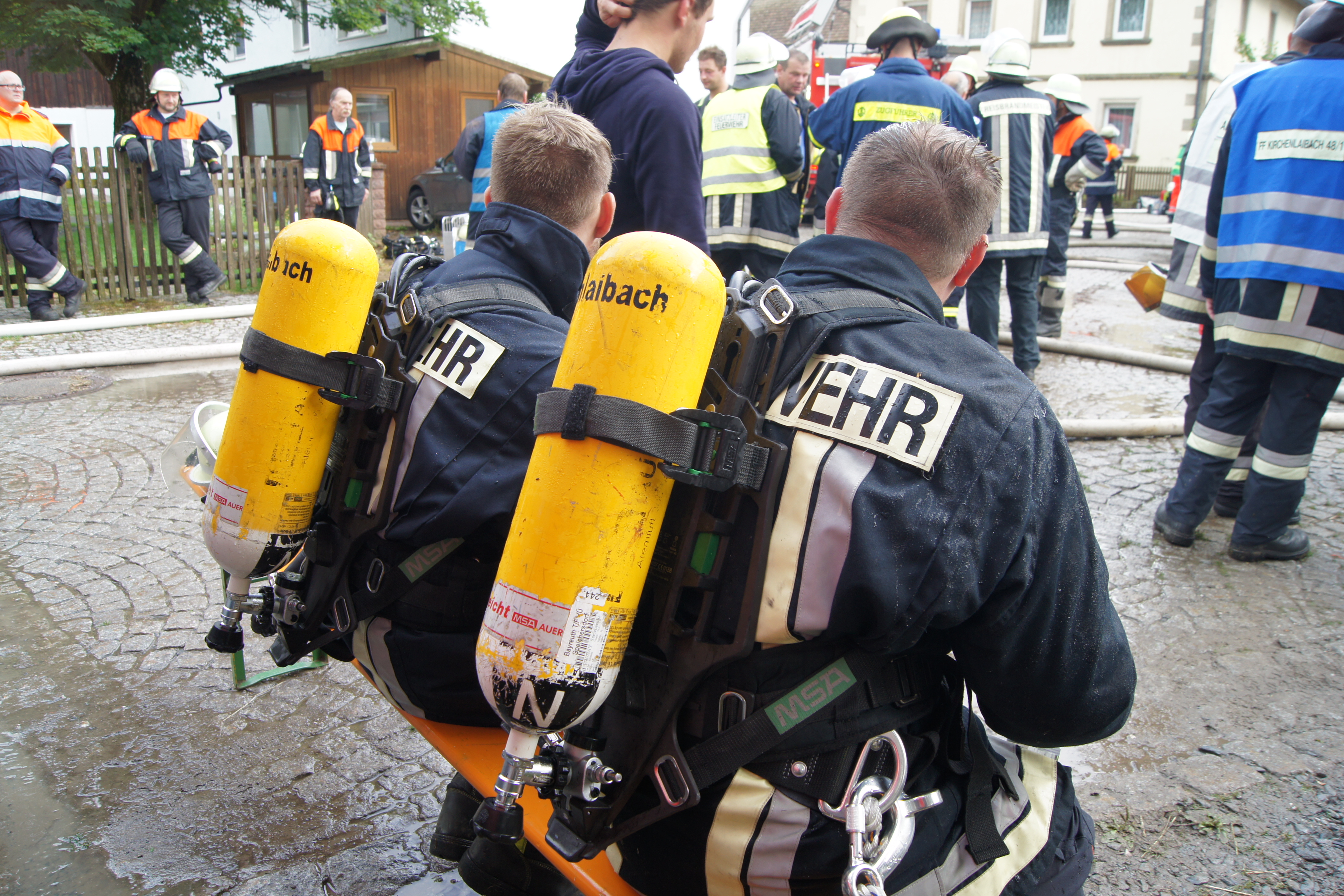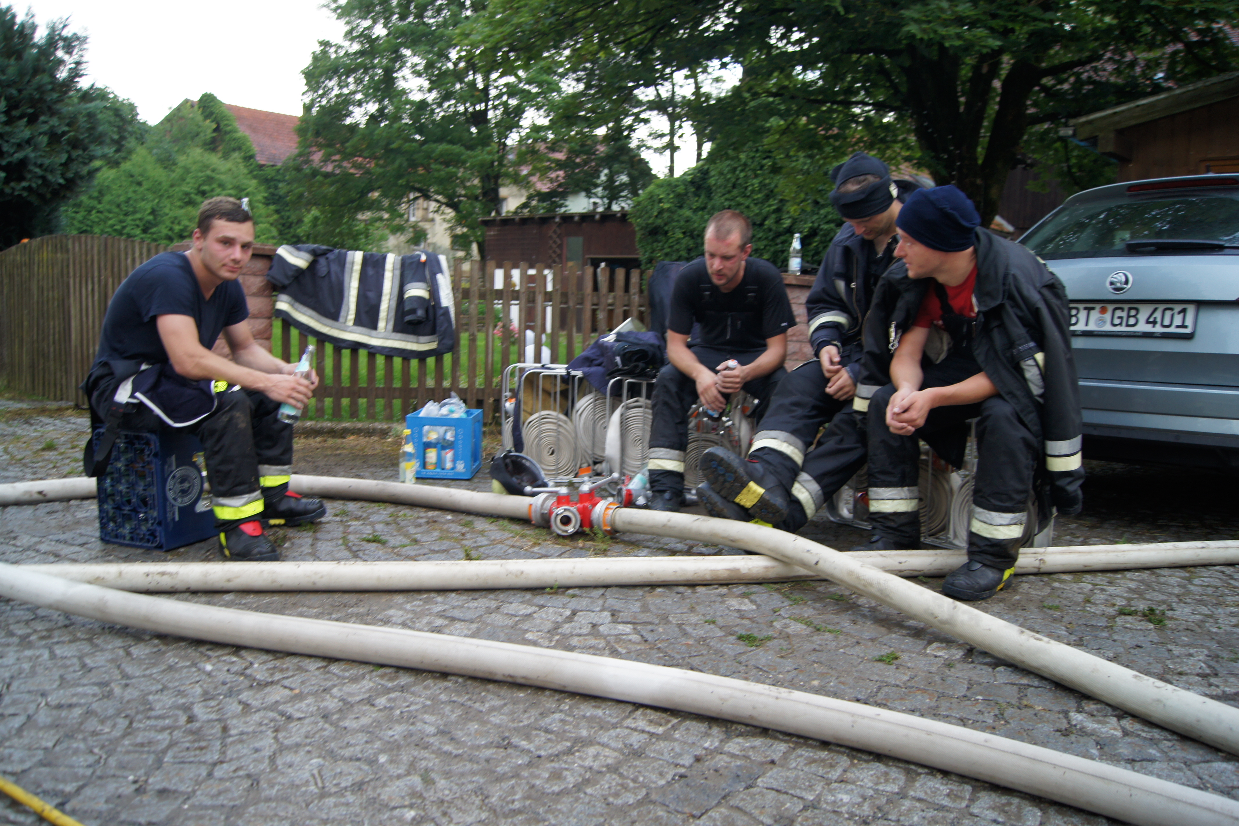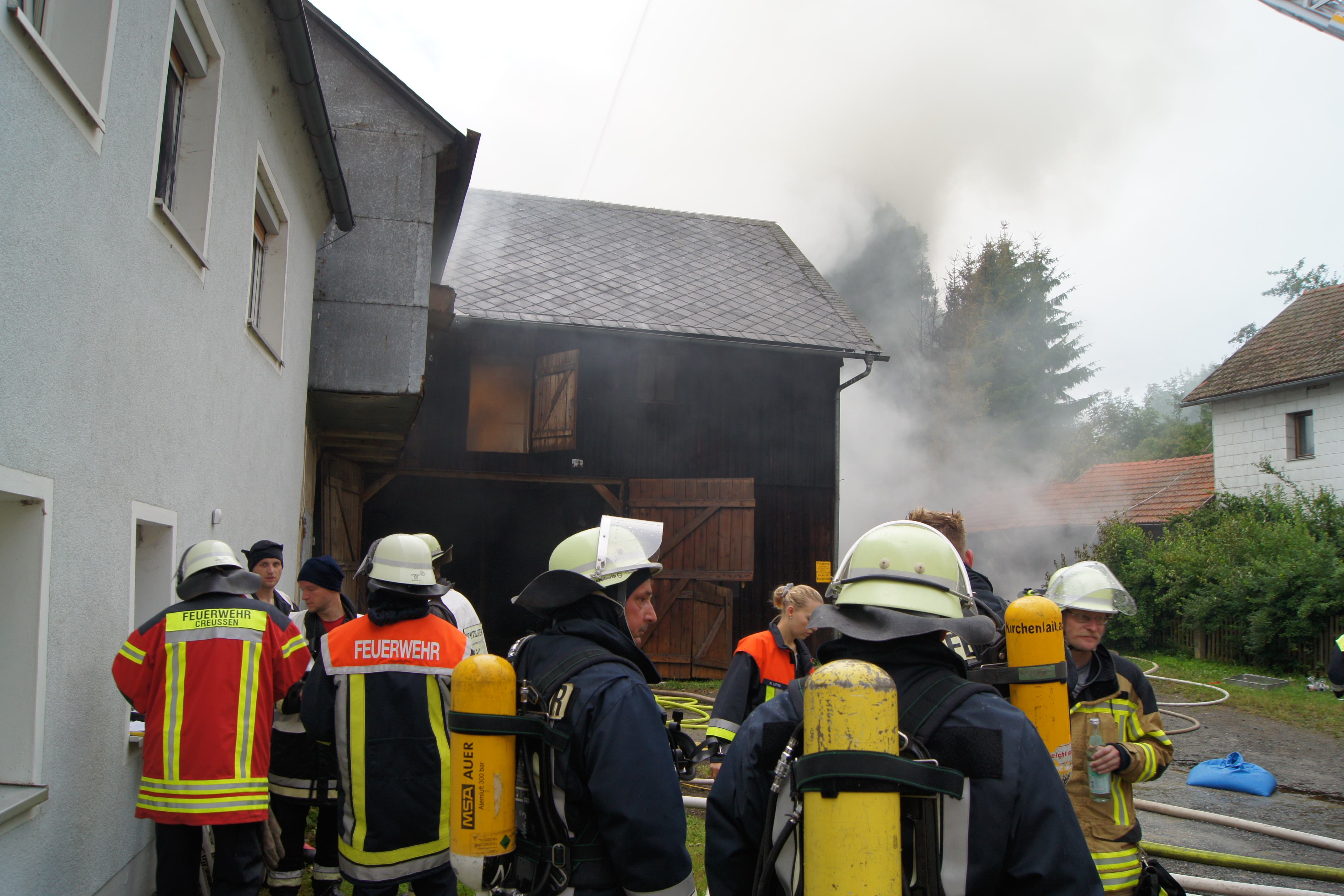 Beim sofortigen Eintreffen der ersten Kräfte wurde festgestellt, dass eine Scheune im Vollbrand stand. Es galt, weitere Gebäude vor den bereits übergreifenden Flammen zu schützen. Mit massivem Löschwassereinsatz, unter anderem mit den zwei Drehleitern aus Kemnath und Weidenberg, gelang dies erfolgreich. Eine nebenstehende Scheune war zwar bereits in Mitleidenschaft gezogen, der Brand konnte jedoch hierauf begrenzt und weiterer Schaden abgewendet werden. Aufgrund des enormen Bedarfs an wasserführenden Fahrzeugen, Atemschutzgeräten und -trägern wurden die Feuerwehren Creußen und Bindlach sowie der Abrollbehälter Atem- und Strahlenschutz aus Pegnitz nachalarmiert.
