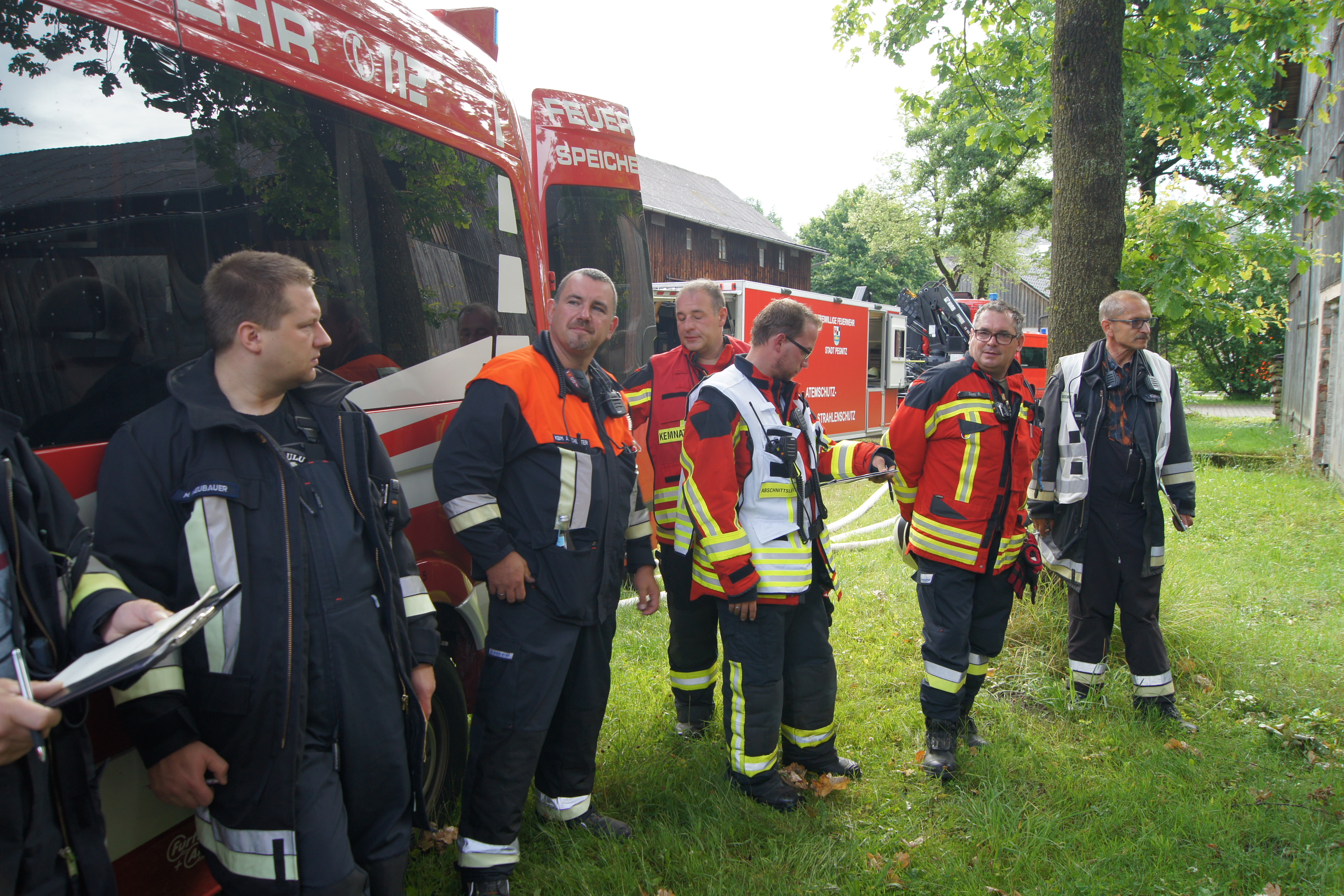 Zum Brand eines landwirtschaftlichen Anwesens wurden die Freiwilligen Feuerwehren von Speichersdorf und Umgebung am Morgen des 10.07.2017 kurz nach 6 Uhr alarmiert. Nach einem kurzen, aber heftigen Gewitter mit Regenschauern war im Ort ein lauter Knall zu hören, den Anwohner und Angehörige der örtlichen Feuerwehr vernahmen. Sofort wurde der Kommandant und spätere Einsatzleiter, Roland Steininger, sowie die Integrierte Leitstelle Bayreuth-Kulmbach informiert, die entsprechend nach dem Stichwort „Brand Bauernhof / landwirtschaftliches Anwesen“ in die  Ringstraße in Speichersdorf alarmierte.