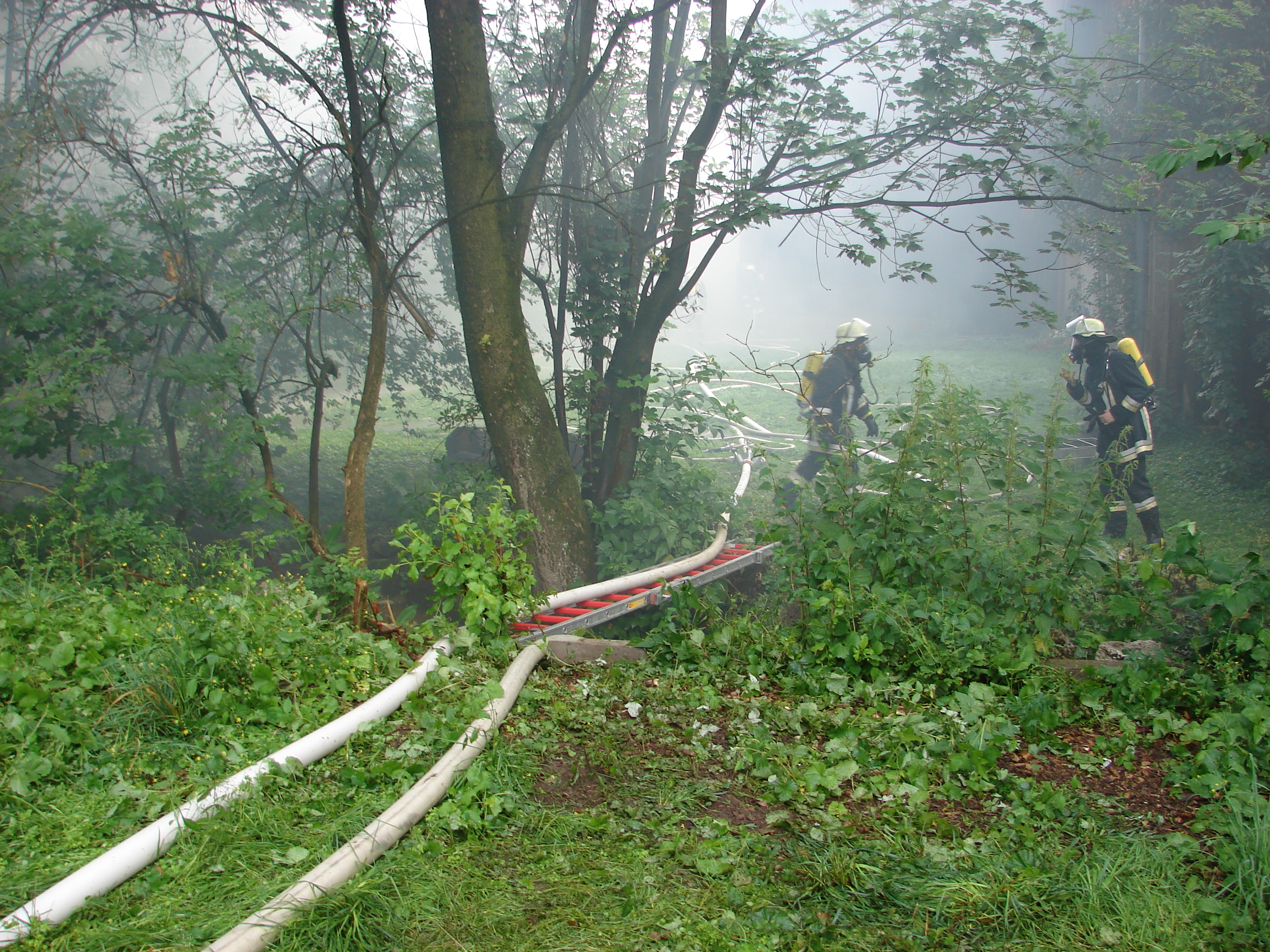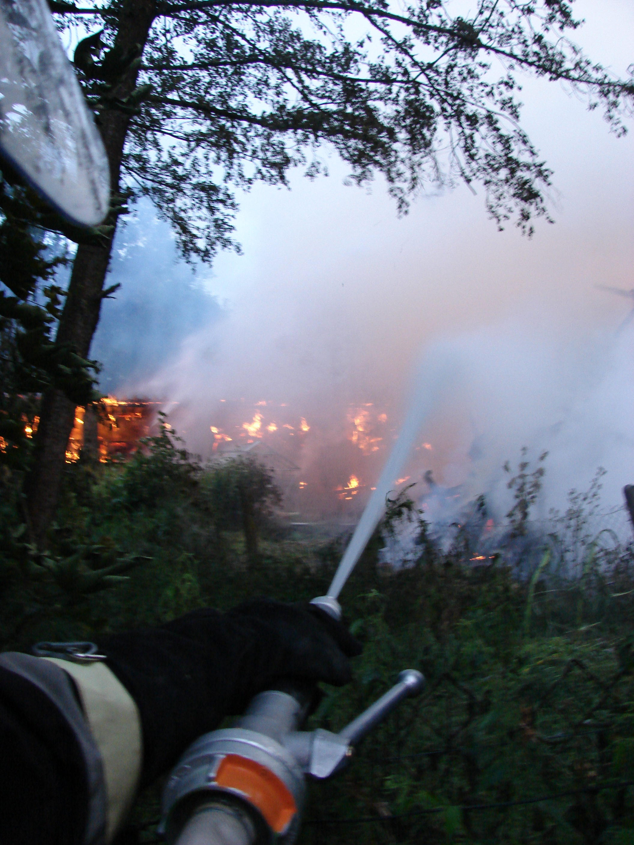 Beim sofortigen Eintreffen der ersten Kräfte wurde festgestellt, dass eine Scheune im Vollbrand stand. Es galt, weitere Gebäude vor den bereits übergreifenden Flammen zu schützen. Mit massivem Löschwassereinsatz, unter anderem mit den zwei Drehleitern aus Kemnath und Weidenberg, gelang dies erfolgreich. Eine nebenstehende Scheune war zwar bereits in Mitleidenschaft gezogen, der Brand konnte jedoch hierauf begrenzt und weiterer Schaden abgewendet werden. Aufgrund des enormen Bedarfs an wasserführenden Fahrzeugen, Atemschutzgeräten und -trägern wurden die Feuerwehren Creußen und Bindlach sowie der Abrollbehälter Atem- und Strahlenschutz aus Pegnitz nachalarmiert.