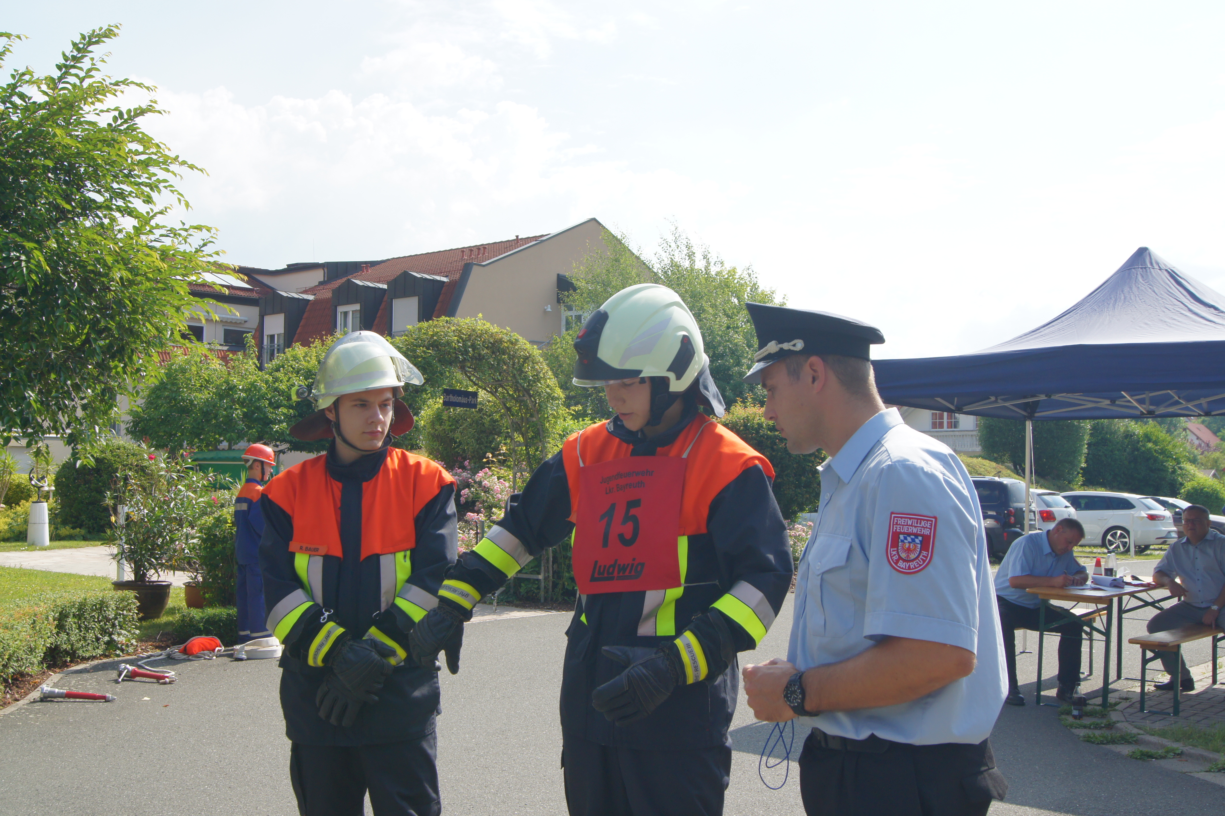 Kreisbrandmeister a. D. und Urgestein der Bindlacher Wehr, Karlheinz Jung, fungierte als „Starter“ für die 25 Staffeln, die sich ab 9 Uhr im 5-Minuten-Takt auf die rund sechs Kilometer lange Strecke begaben. Zu absolvieren waren sieben Übungsstationen: Gerätetransport, Erste-Hilfe-Maßnahmen, Löschangriff, Knoten und Stiche, Gefahrgut und Hinweiszeichen, Theoretische Prüfung und Kartenkunde. Bei bestem Wetter ging der Rundkurs durch Wohngebiete und herrliche Natur.